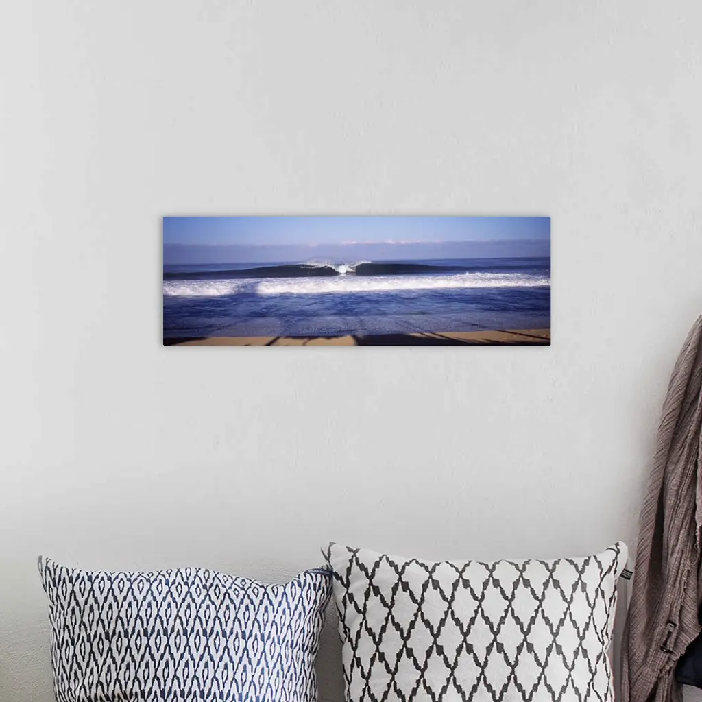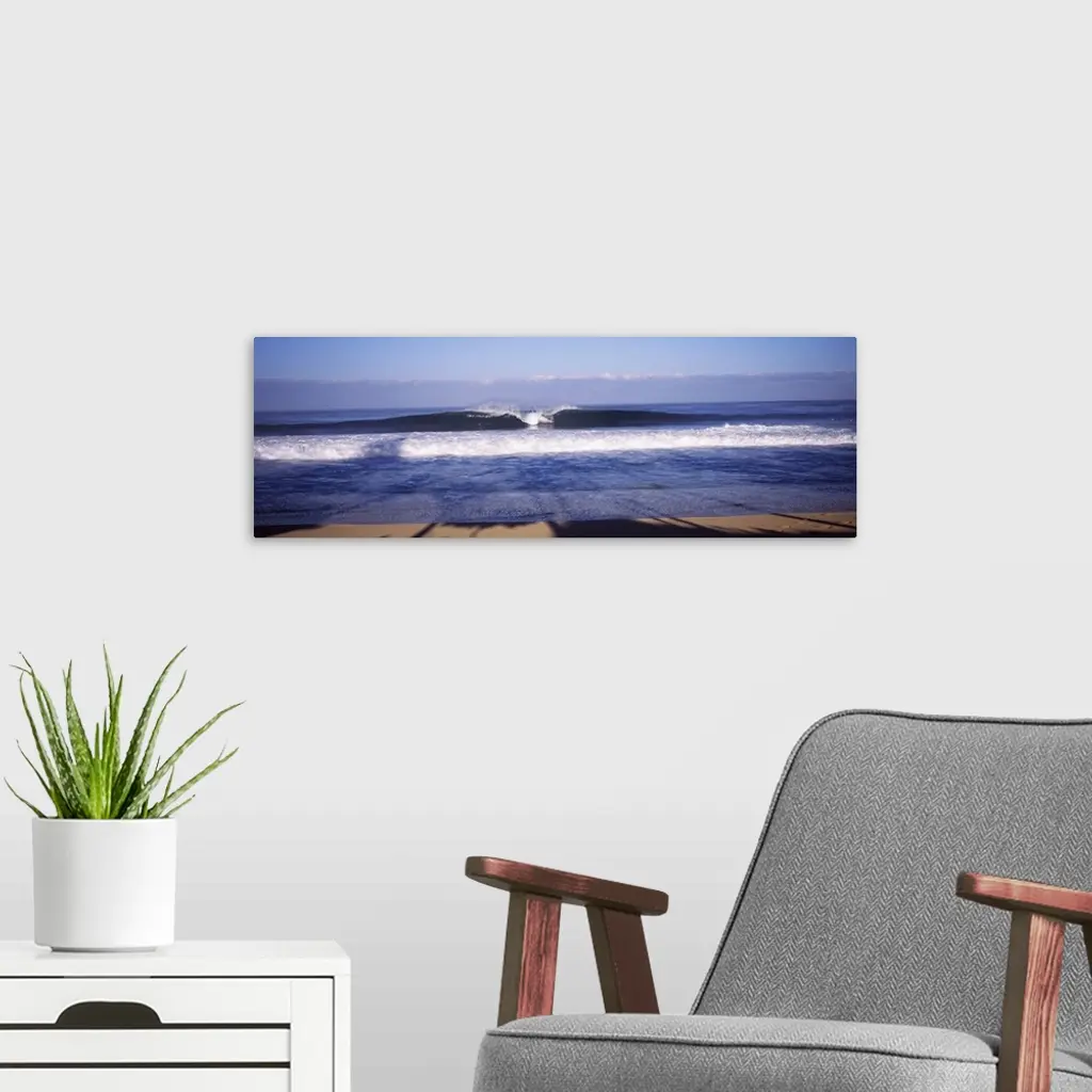 Panoramic photo print of a big wave breaking in the middle washing ashore in Hawaii.