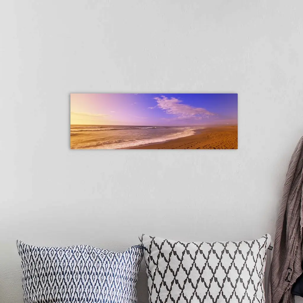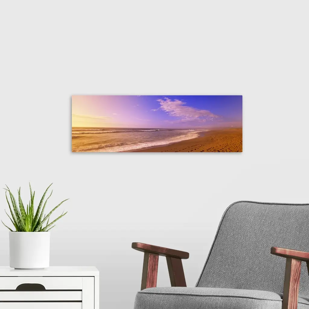 Oversized, landscape photograph of waves hitting the sands of North Beach, on Point Reyes National Seashore, in California.