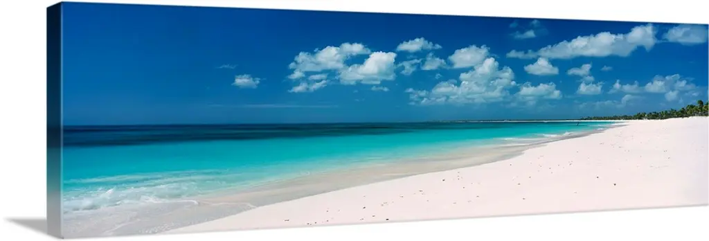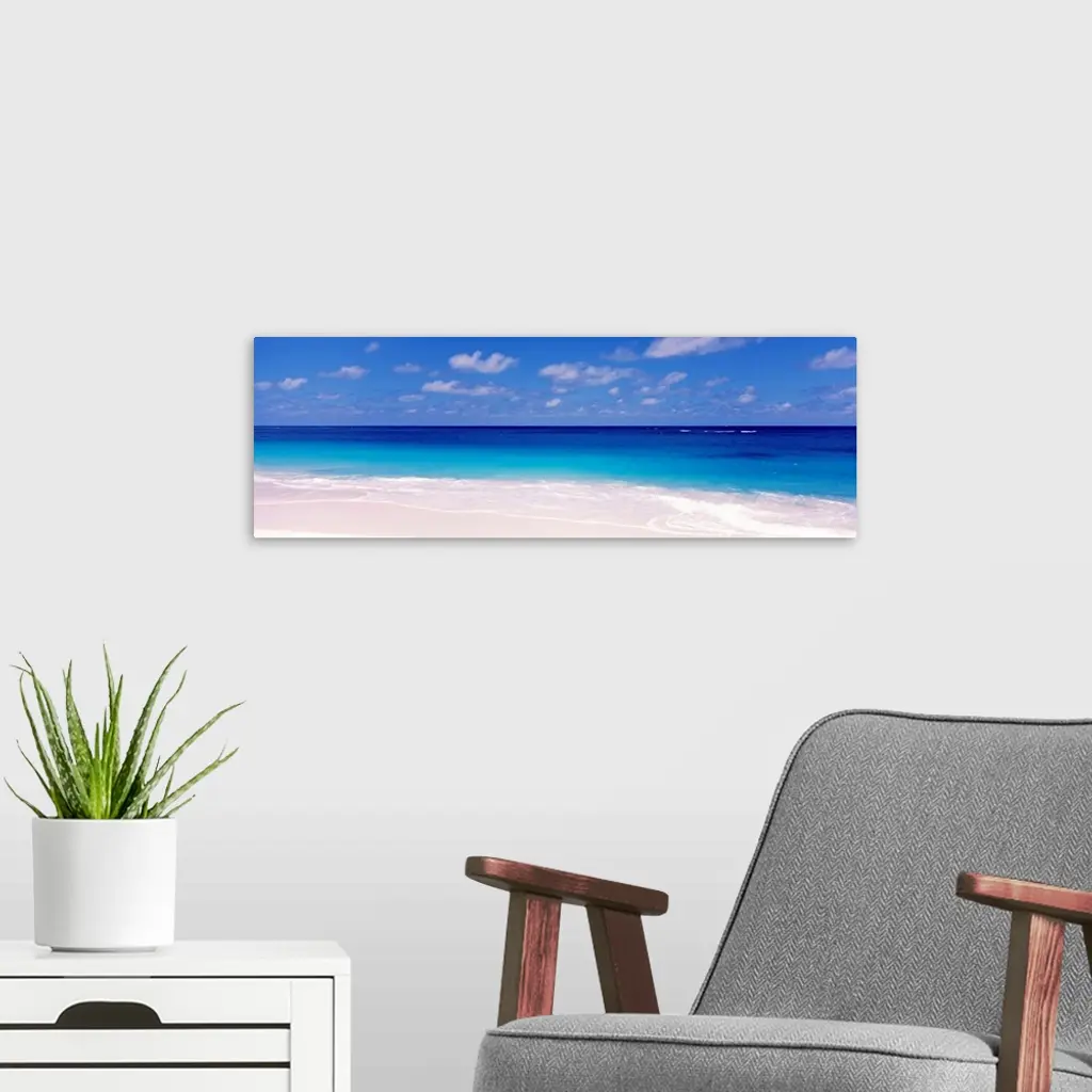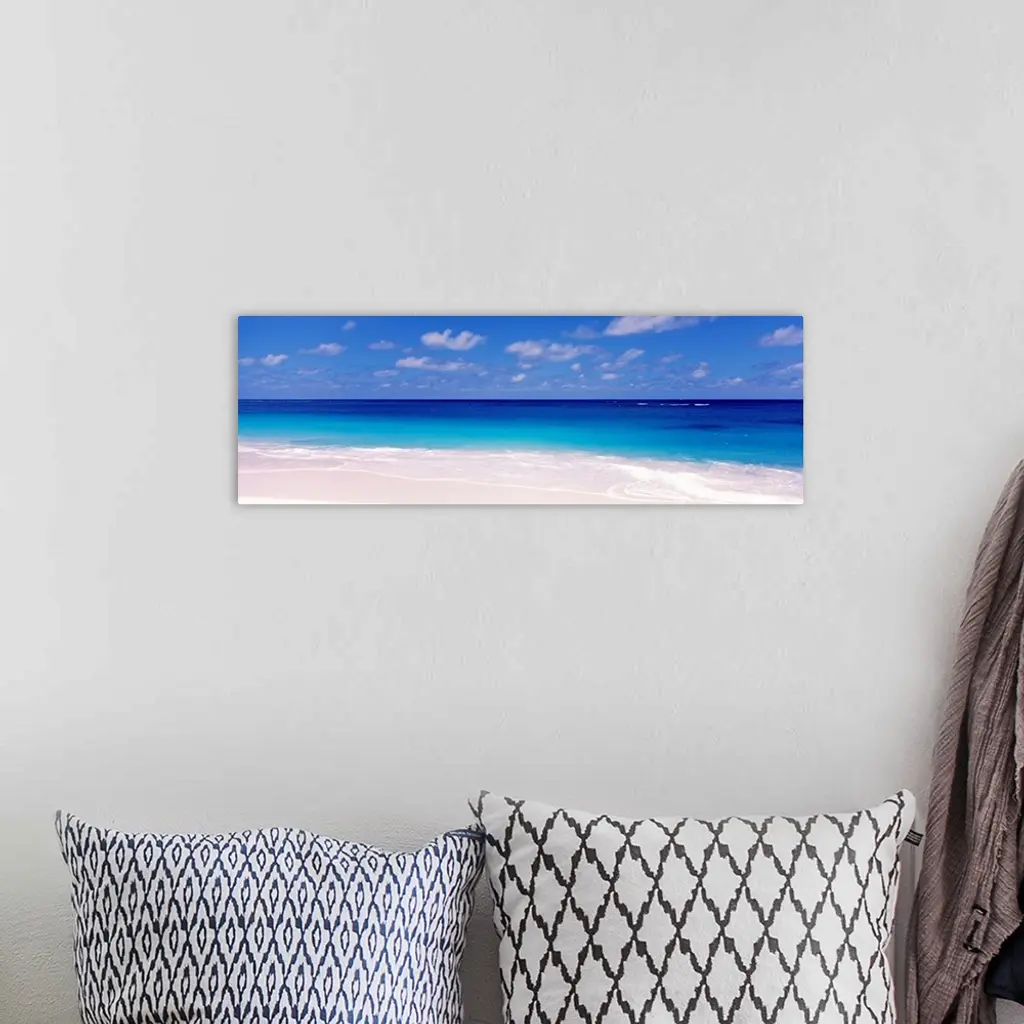 Oversized wall hanging for the home this is a serene panoramic beach photograph of a calm sea full of clear tropical water.