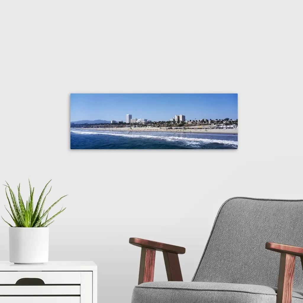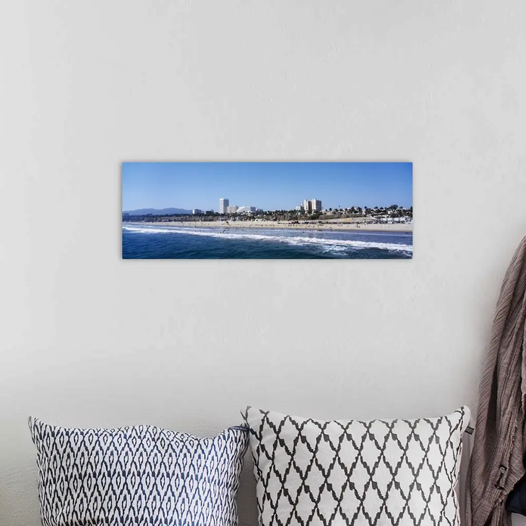 Waves on the beach with buildings in the background, Santa Monica Beach, Santa Monica, California wall art for home and office decor. Discover canvas art prints, photos, mural, big canvas art and framed wall art in GreatBigCanvas.com's varied collections.
