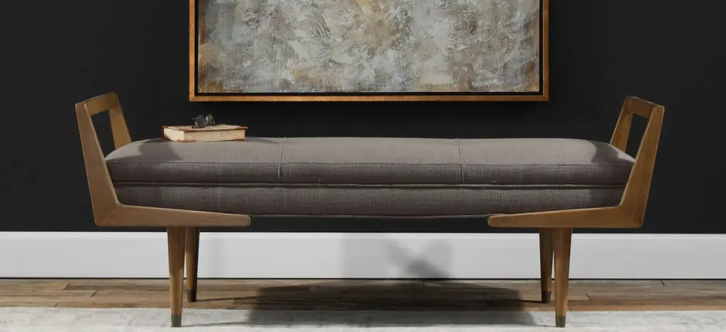 The Waylon bench provides extra seating, with a mid-century twist, in its modern birch wood frame. Lightly finished in a smooth oak finish, with a tufted bench seat in a woven taupe gray fabric.