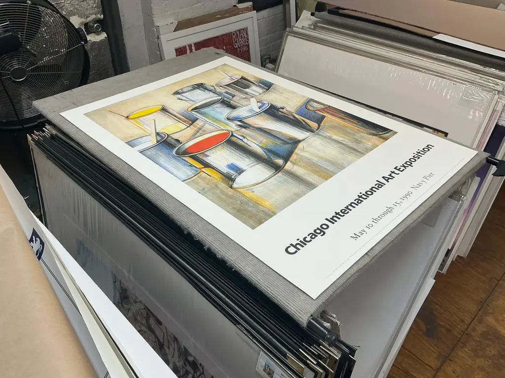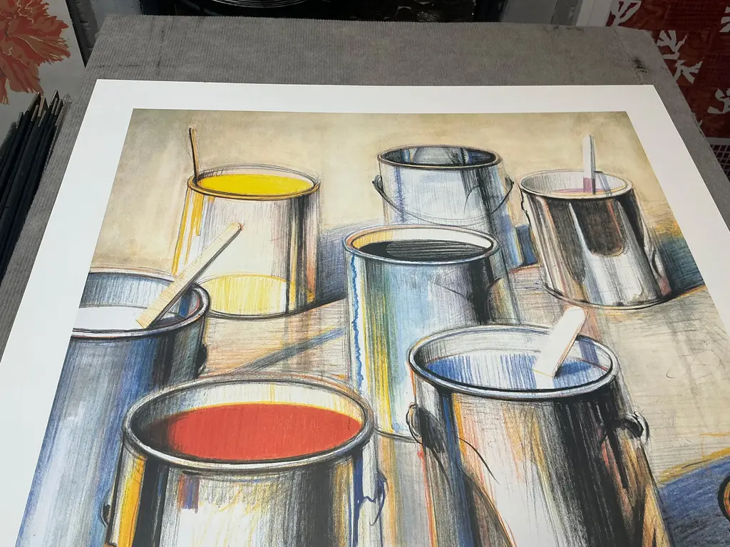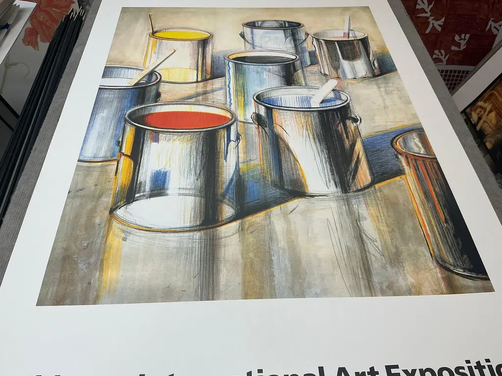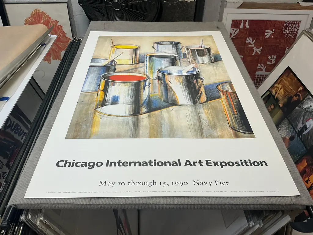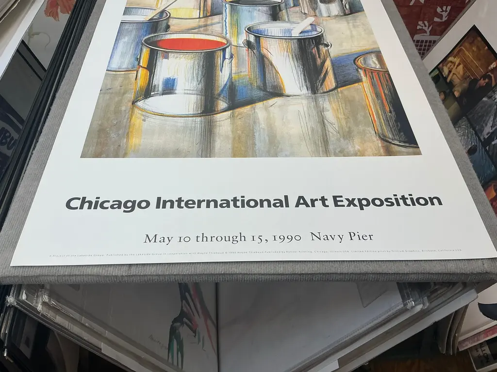 Artist: Wayne Thiebaud Title: Paint Cans Year: 1990 Signed: No Medium: Offset Lithograph Paper Size: 39 x 27 inches ( 99 x 69 cm ) Image Size: 29 x 23 inches ( 74 x 58 cm ) Edition Size: 1000 Framed: No Condition: A: Mint Additional Details: This limited edition poster titled "Paint Cans" by Wayne Thiebaud was created for the Chicago International Art Exposition in 1990 and published by Rohner Printing. Printed by Trillium Graphics in Brisbane, California, the poster features Thiebaud's iconic depiction of vibrantly colored paint cans, showcasing his distinctive style and playful approach to everyday objects. Printed on high-quality, heavy surface paper, the poster has an artistic texture that enhances its visual appeal and collectible value.