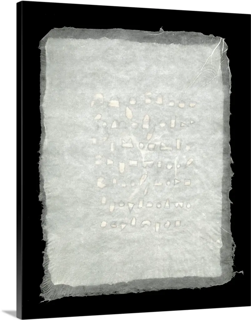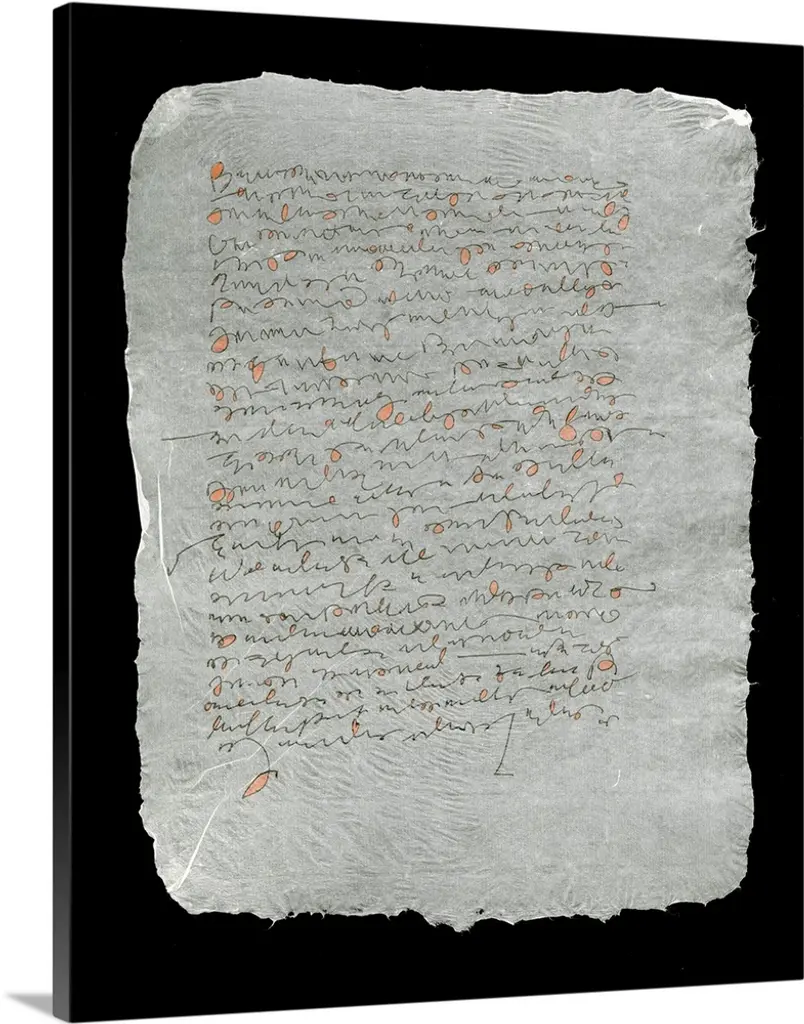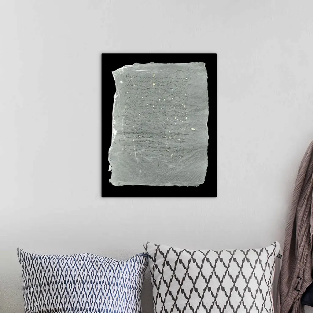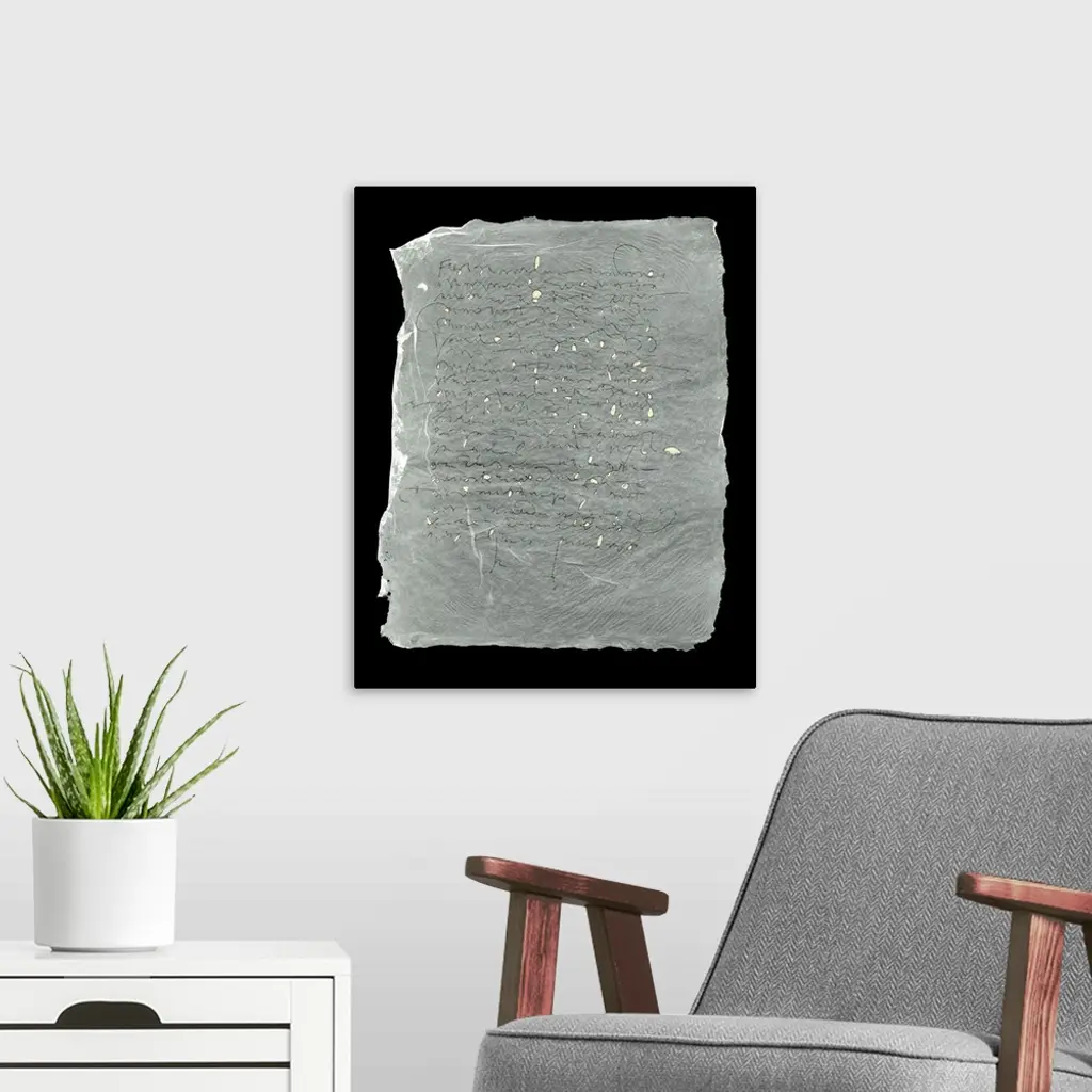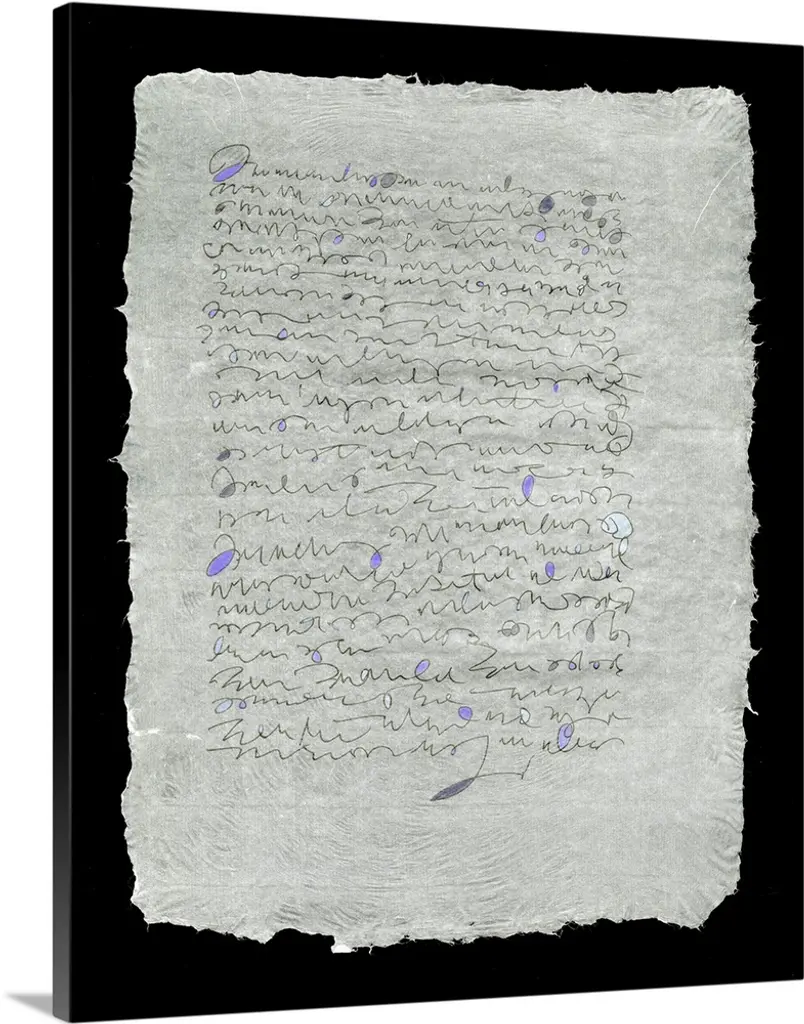 Loose lines evoking handwriting with splashes of pink move along a sheet of handmade paper.