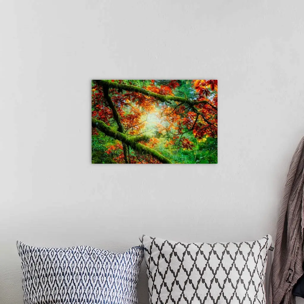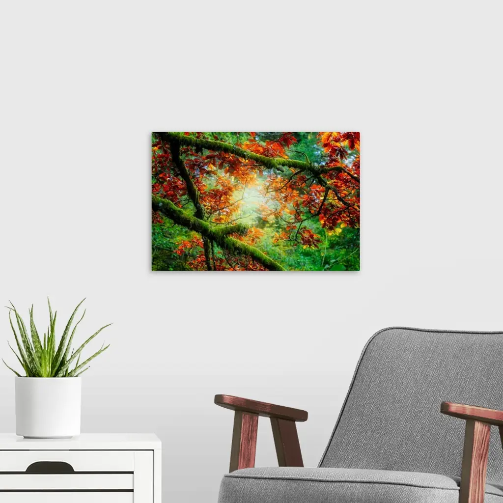 Mossy green branches filled with contrasting orange leaves.