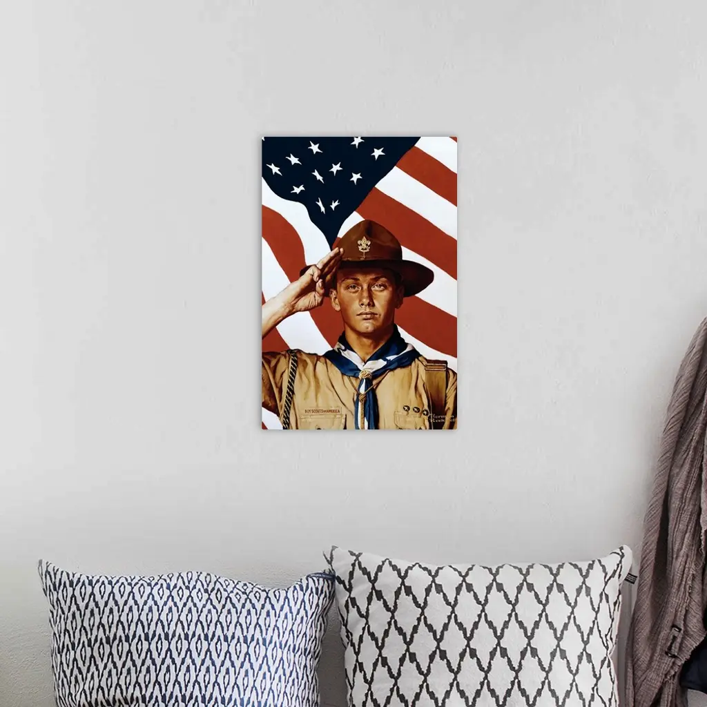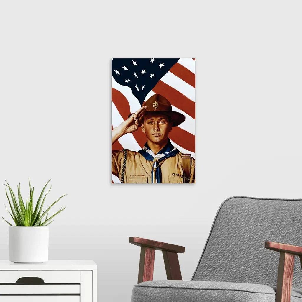 Norman Rockwell's long artistic relationship with the Boy Scouts of America began after he successfully illustrated the Boy Scout Hikebook in the fall of 1912 and lasted until 1976 with Rockwell producing their annual calendar illustrations. Many of the images depict the Scouts learning, teaching, or doing outdoor activities. Approved by the Norman Rockwell Family Agency