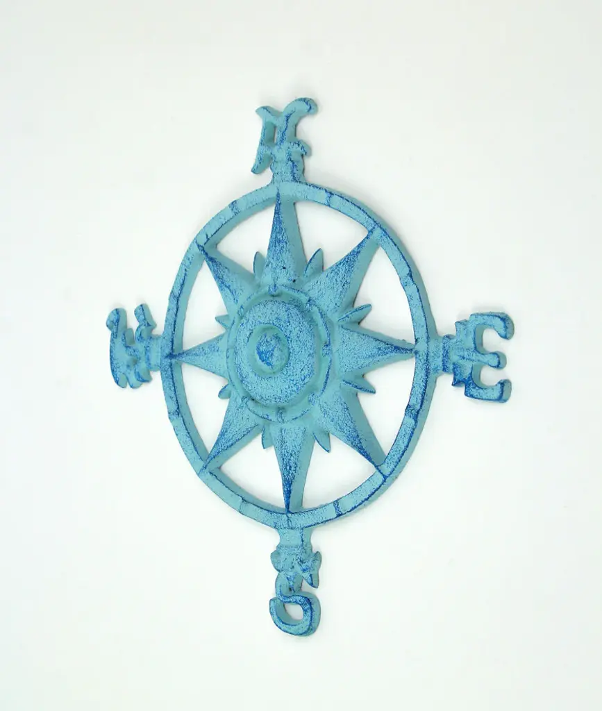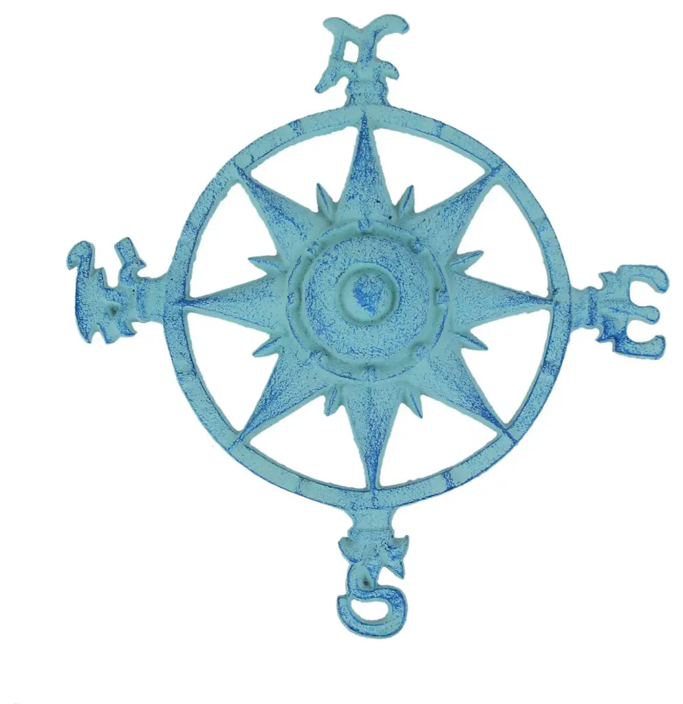 Weathered Blue Cast Iron Compass Rose Wall Hanging