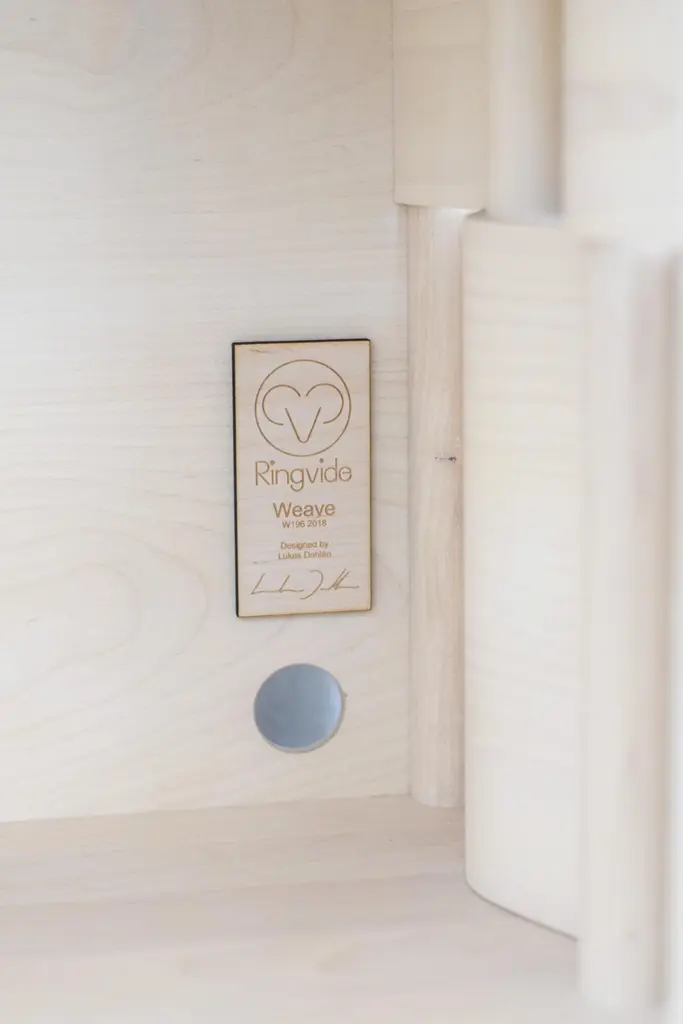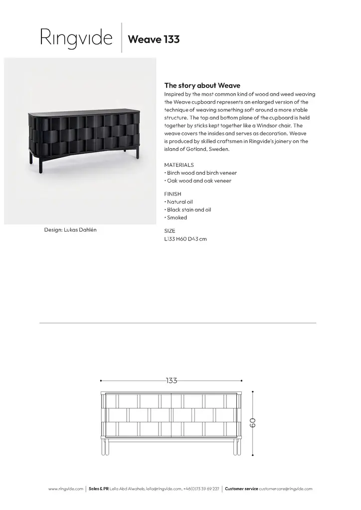 The weave series is modern yet classic, bold yet modest and serves as a great example of scandinavian contemporary high quality design. The expressive cabinet weave is made of solid birch wood and laminated birch veneér. Inspired by the most common kind of wood and weed weaving the Weave sideboard represents an enlarged version of the technique of weaving something soft around a more stable structure. The top and bottom plane of the cabinet is held together by sticks kept together like a Windsor chair. Since first shown in Milan 2012, Salone Satellite, it has received a lot of attention worldwide. The Weave series includes different products in several standard sizes, in birch or oak The natural finishes are treated with white pigmented hardwax oil. The black is stained black and treated with hardwax oil. The smoked oak is also treated with hardwax oil. Standard size: L133 x H60 x D43 Signed by Maker,Labeled by Maker,Imprinted by Maker,Labeled with Country of Origin