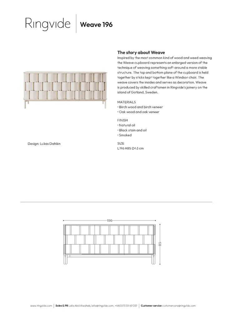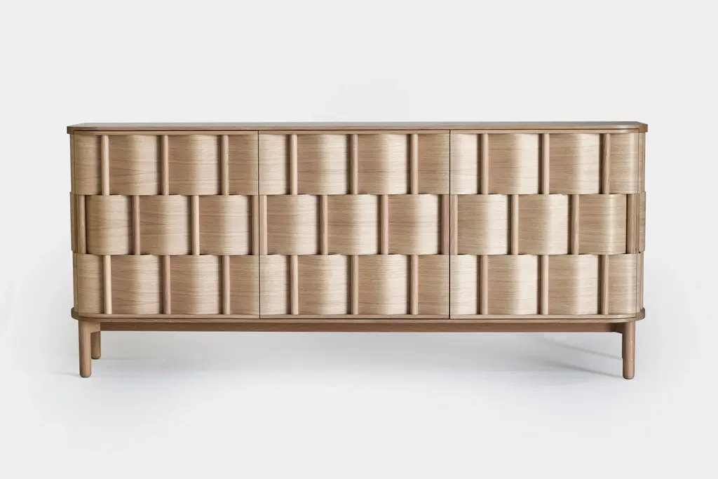 The weave series is modern yet classic, bold yet modest and serves as a great example of scandinavian contemporary high quality design. The expressive cabinet weave is made of solid birch wood and laminated birch veneér. Inspired by the most common kind of wood and weed weaving the Weave sideboard represents an enlarged version of the technique of weaving something soft around a more stable structure. The top and bottom plane of the cabinet is held together by sticks kept together like a Windsor chair. Since first shown in Milan 2012, Salone Satellite, it has received a lot of attention worldwide. The Weave series includes different products in several standard sizes, in birch or oak The natural finishes are treated with white pigmented hardwax oil. The black is stained black and treated with hardwax oil. The smoked oak is also treated with hardwax oil. Standard size: L196 x H85 D43 cm Signed by Maker,Labeled by Maker,Imprinted by Maker,Labeled with Country of Origin