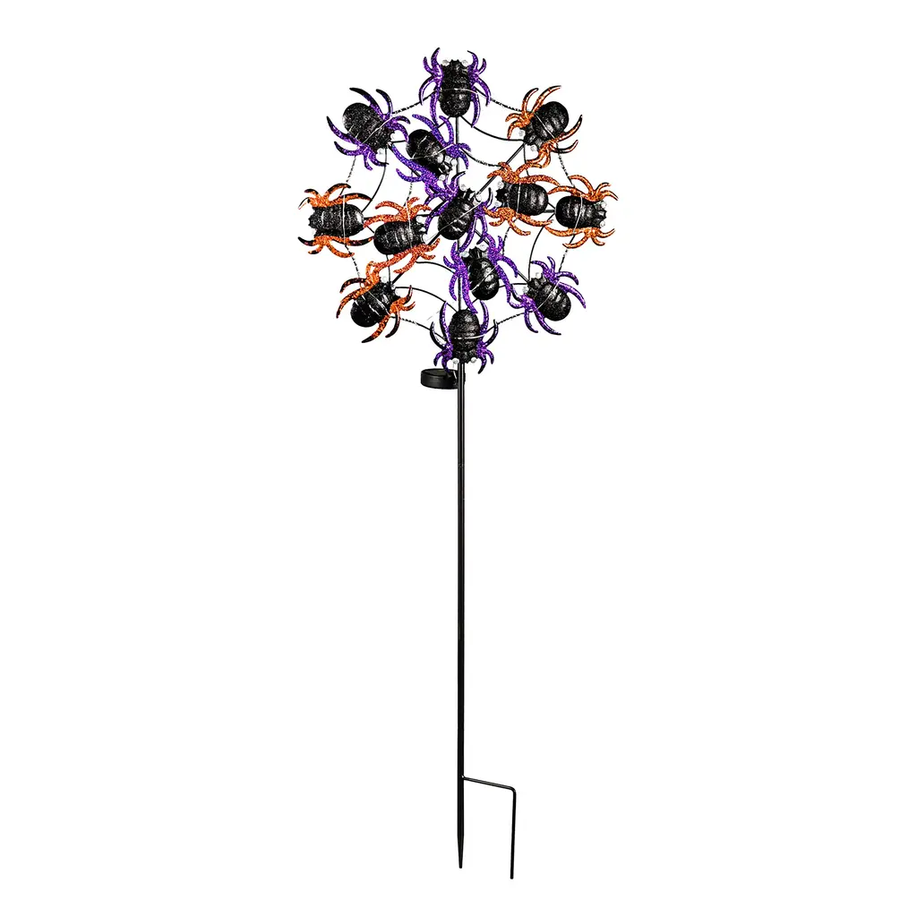 These creepy crawlers come to life as day turns to night. Spook up your outdoor space for Halloween with this solar garden stake featuring orange and purple spiders on a web. Purple lights on the web provide a chasing light effect to enhance the design and entice trick or treaters to visit your home. Place this solar-powered piece in direct sunlight to feel the full effect of this illuminating design. Allow the stake to get 6 hours of direct sunlight to ensure a full charge. The stake should light up night after night as Halloween approaches. The design has an h-stake for easy display; simply push down into softened dirt in your outdoor space. The weather-resistant material allows enjoyment day and night, all season long.