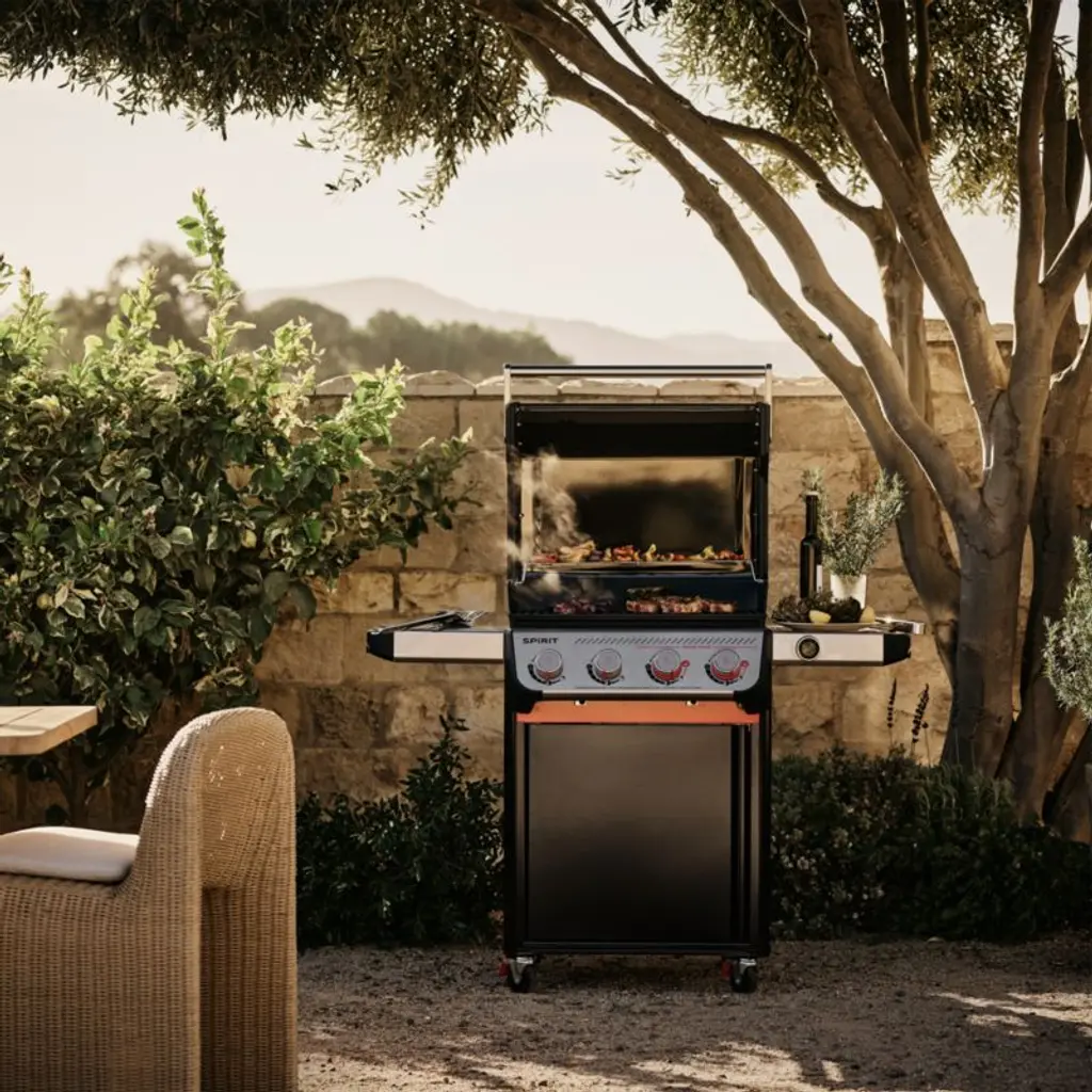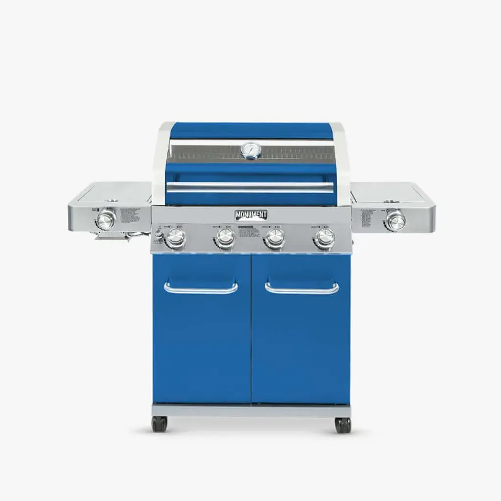 This four-burner gas grill is a backyard chef's dream. Burgers, wings, fish and veggies grill evenly and consistently regardless of where they're placed on the porcelain-enameled cast iron cooking grate with Flavorizer bars. Two Booster Burners unleash 40% more power in the sear zone, making it easy to create bold, flavorful sear marks on everything you grill. Snap-Jet Ignition lets you easily light individual burners with one hand, and the electronic ignition system fires up the grill quickly and reliably. A lid-mounted thermometer lets you monitor what's cooking with a digital display that can be read night or day. Side tables provide extra room grilling supplies and pans, and a cabinet hides a propane tank and more. Finished in black with red and stainless steel accents, the grill takes pride of place on your patio or deck.