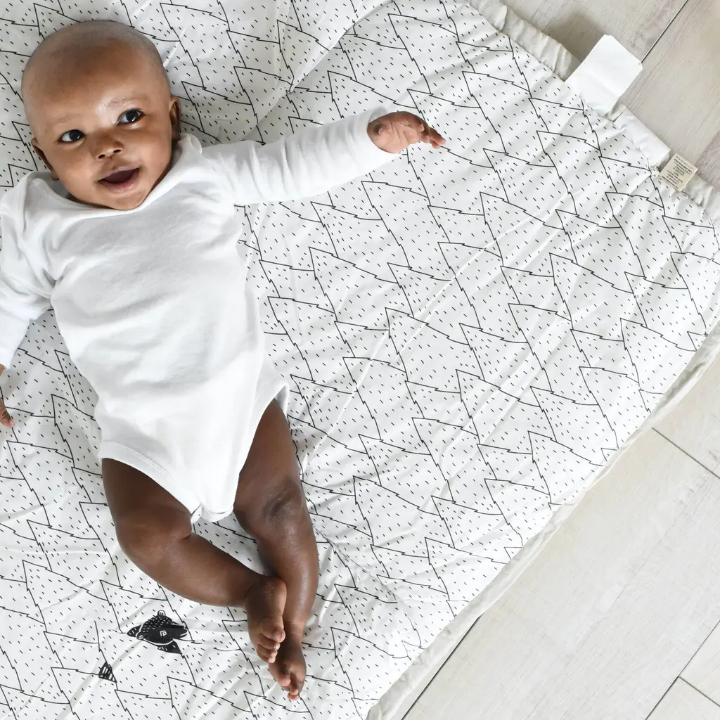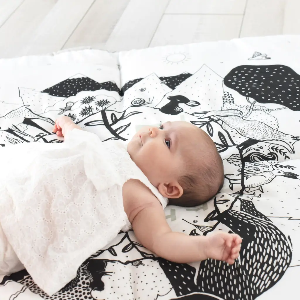 THOUGHTFULLY DESIGNED: Wee Gallery's infant play mat features a hand-illustrated woodland scene on one side and a neutral cityscape on the other. Measuring 40 inches by 40 inches, our play mat creates the perfect area for cushioned play. BABY DEVELOPMENT SUPPORT: Featuring a reversible two-sided pattern with high contrast graphics, this aesthetic baby floor mat keeps your little one interested and visually stimulated. The ideal playtime setting for baby development! THE PERFECT GIFT: This floor mat is the perfect baby shower gift or first birthday present for your child or grandchild. Our soft play mat for babies also comes in a keepsake drawstring bag with a tassel for easy storage and gifting. DURABLE & SUSTAINABLE: Ethically made in India from cotton muslin and Oeko-tex polyester padding, the outer layer of our baby mat also features a double layer of voile for extra soft cushioning to support regular use. WEE VALUES: We've built a fun and creative world of animals and nature themes, thoughtfully designed to entertain and educate. Our sustainable toys for babies are created for each stage of child development to encourage learning through play.