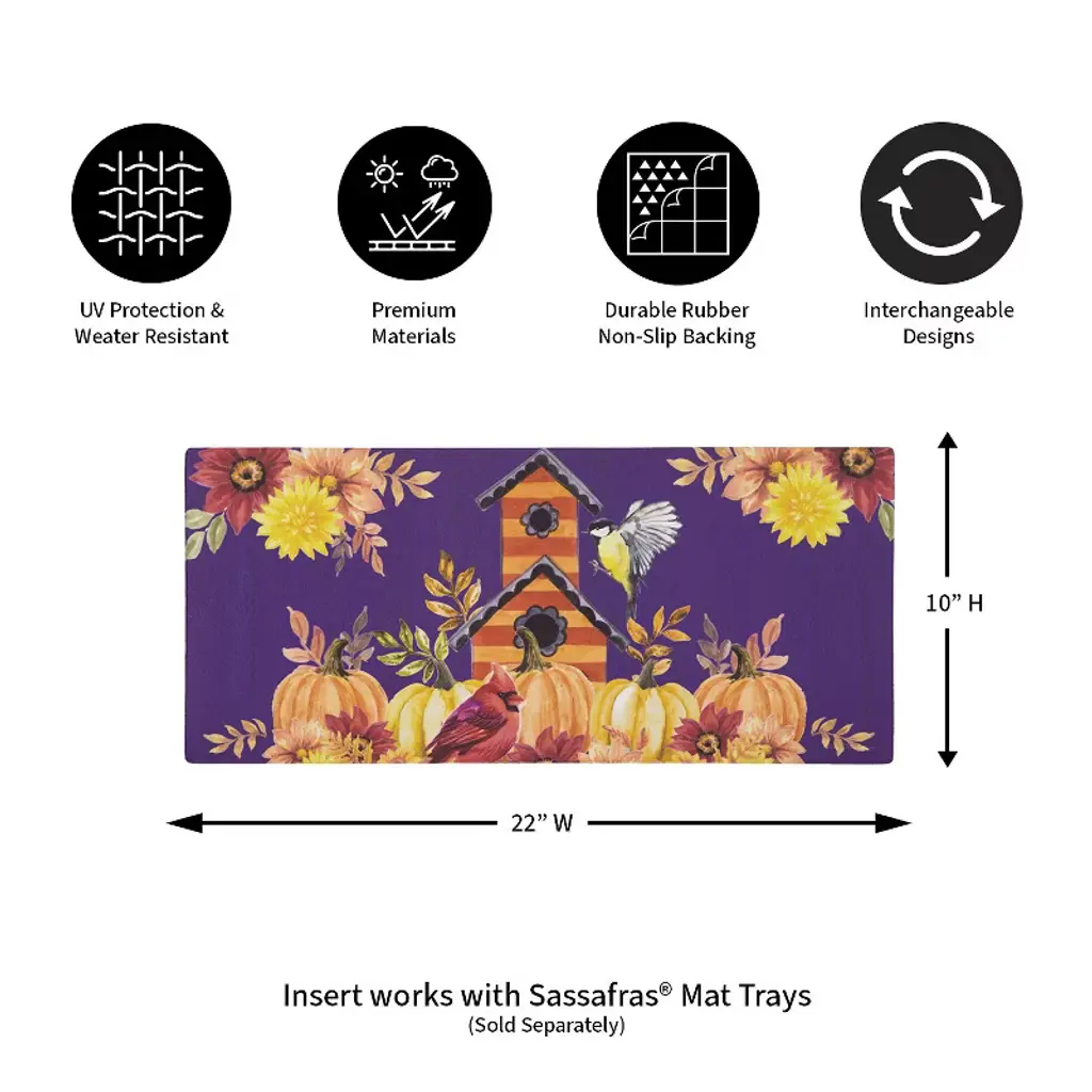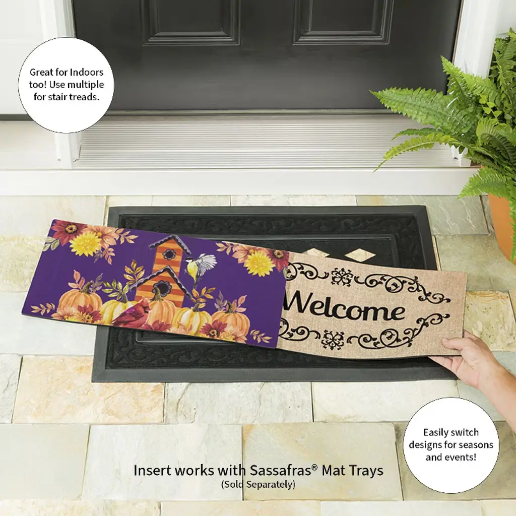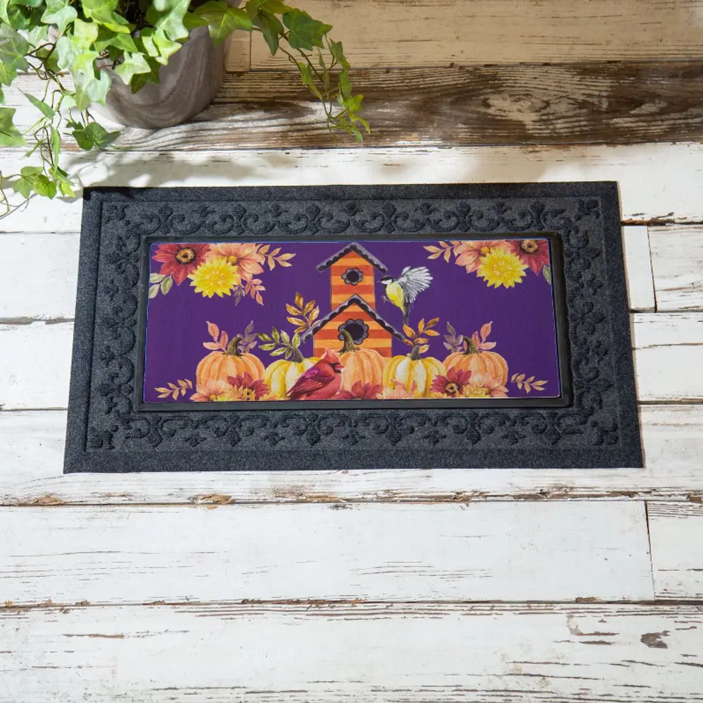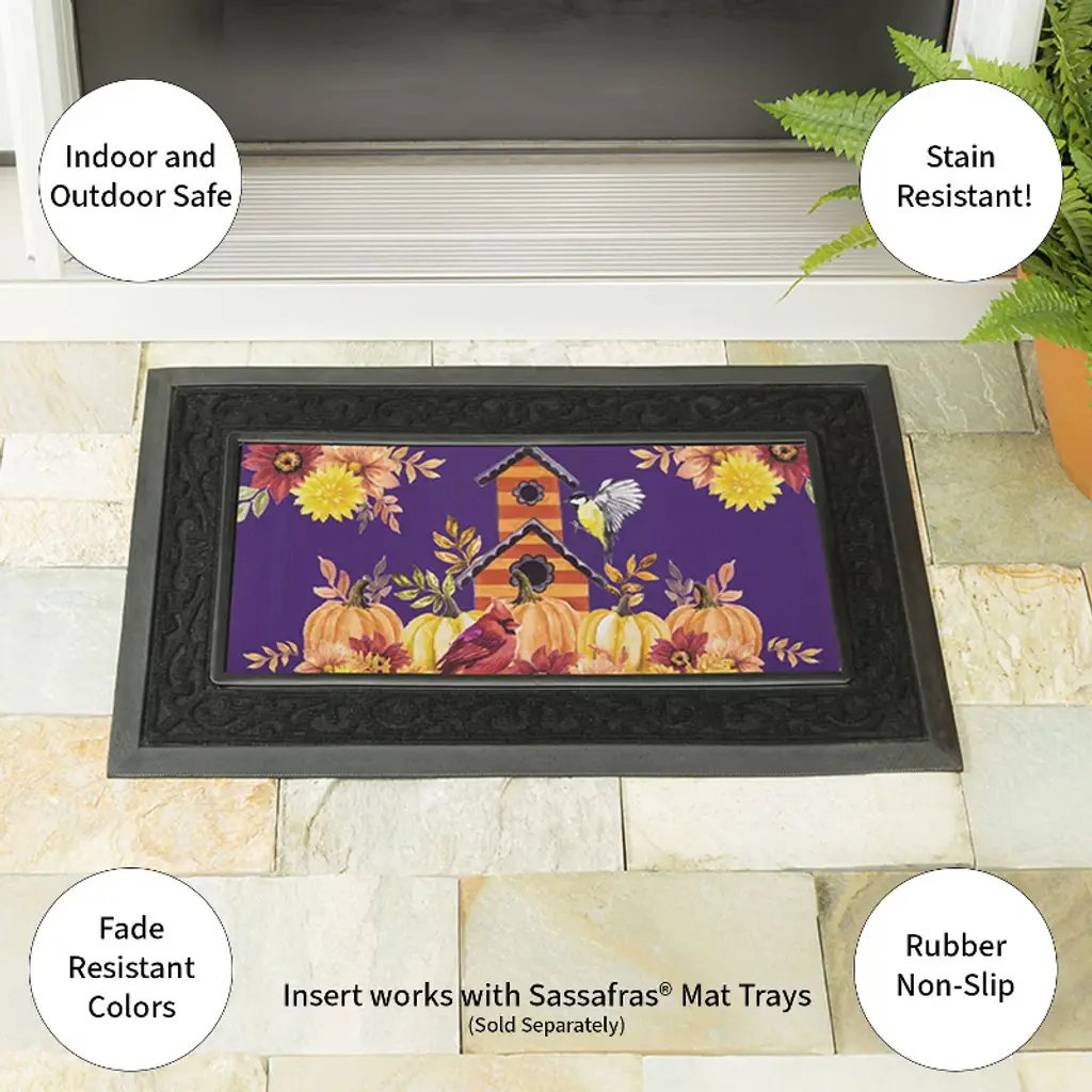 Say hello to fall with this sassafras switch mat. This mat features a birdhouse in a pumpkin patch surrounded by leaves and birds. A "Welcome" message invites guests into the home.