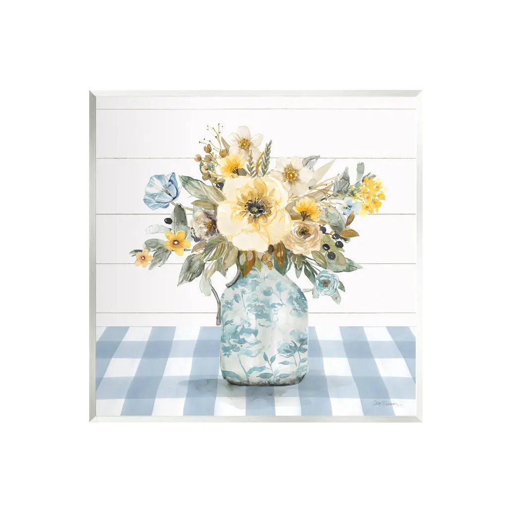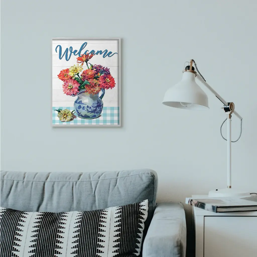Welcome Flower Pot Blue Plaid Rustic Word Design, 16"x20", Gray Frame