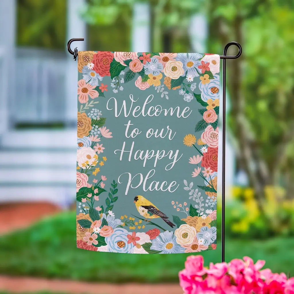 With its striking color and welcoming message, this Burlap Flag brings a refreshing ambience to the spring season. Its detailed, vibrant design is sure to catch anyone's eye. Crafted to be durable, this piece is made from weatherproof material.