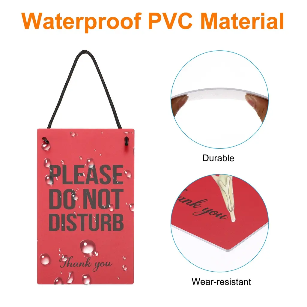 The Do Not Disturb and Please Knock Sign is widely used in homes, offices, businesses, retail stores, restaurants, and shops to prevent unnecessary interruptions and show that you need privacy or tell others you are free. It is also a great gift for your friends and families.SpecificationSize: 254 x 127 x 2 mm/ 10 x 5 x 0.08 Inch(L*W*T)Color: Red and BlackMaterial: PVCPacking List: 1 Pcs x The Do Not Disturb and Please Knock SignAdvantage1. The do not disturb door hanger sign is made of PVC material which is durable, waterproof, wear-resistant, not easy to break, and can be used for a long time. The rope hanger design allows you to hang it anywhere.2. Large hanger design suits various environments. Double-sided printing, large and eye-catching fonts, and elegant design can quickly attract people's attention. The simple design enables you to place it in any place.3. The double-sided design suits different situations, meeting your various needs. One side is printed with "WELCOME PLEASE KNOCK" and the other side is designed with"PLEASE DO NOT DISTURB".InstructionEasy to install. Directly hang the sign on doors, window, glass, walls, and anywhere you can hang.Note: Please check your size before purchasing.
