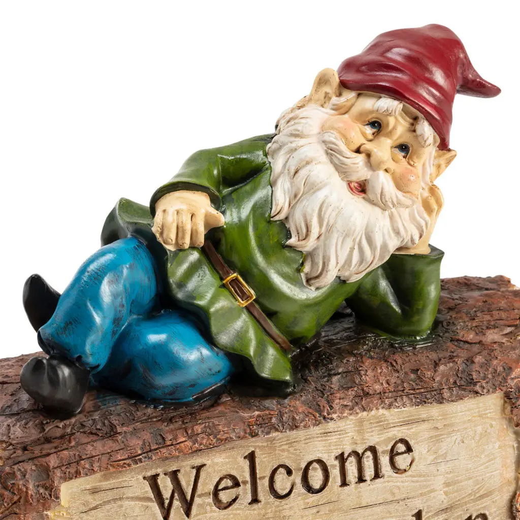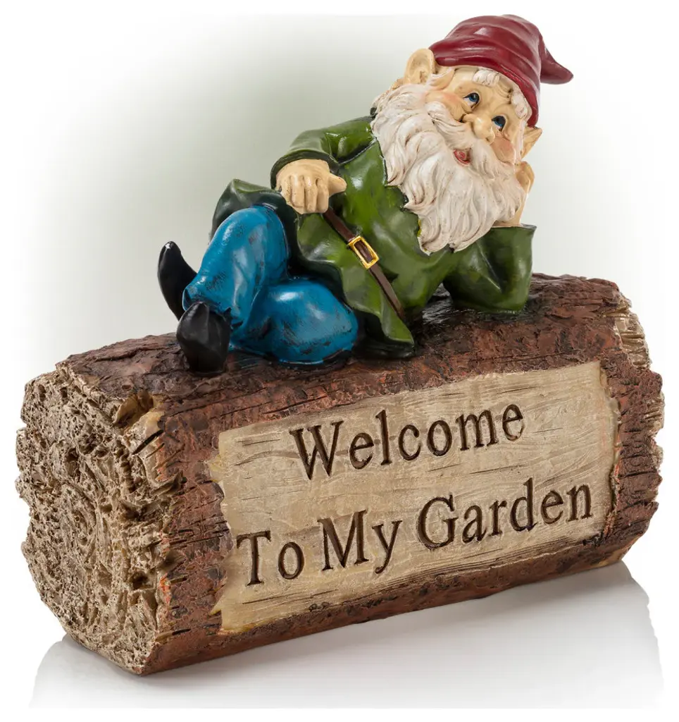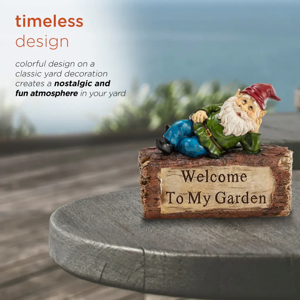 Add color, spice and life to your outdoors with this sweet "Welcome to my Garden" Gnome Statuary. Made from cast stone resin, this sturdy statuary will bring a playful feel to any garden, deck or yard.Boasts hues of blue, green and redMeasures 4 inches wide, 10 inches long and 9 inches tall
