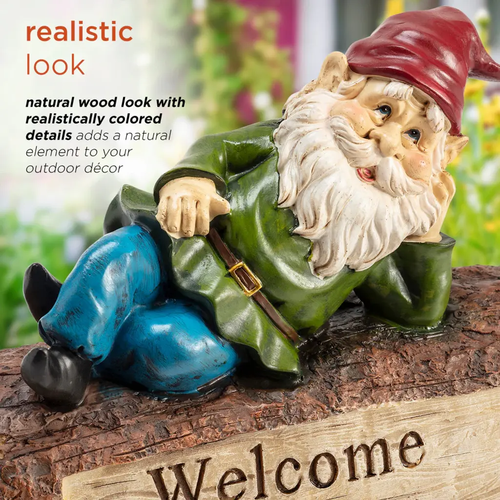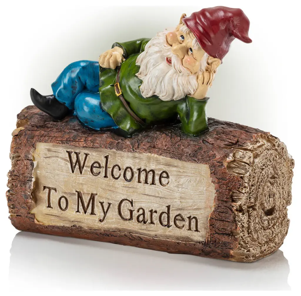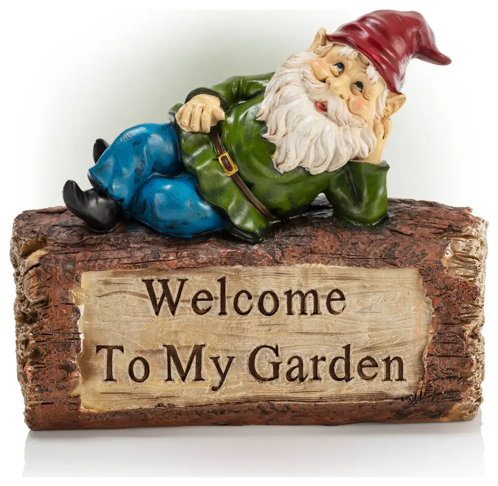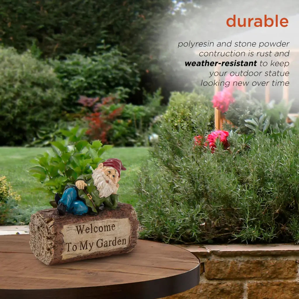 Add color, spice and life to your outdoors with this sweet "Welcome to my Garden" Gnome Statuary. Made from cast stone resin, this sturdy statuary will bring a playful feel to any garden, deck or yard.Boasts hues of blue, green and redMeasures 4 inches wide, 10 inches long and 9 inches tall