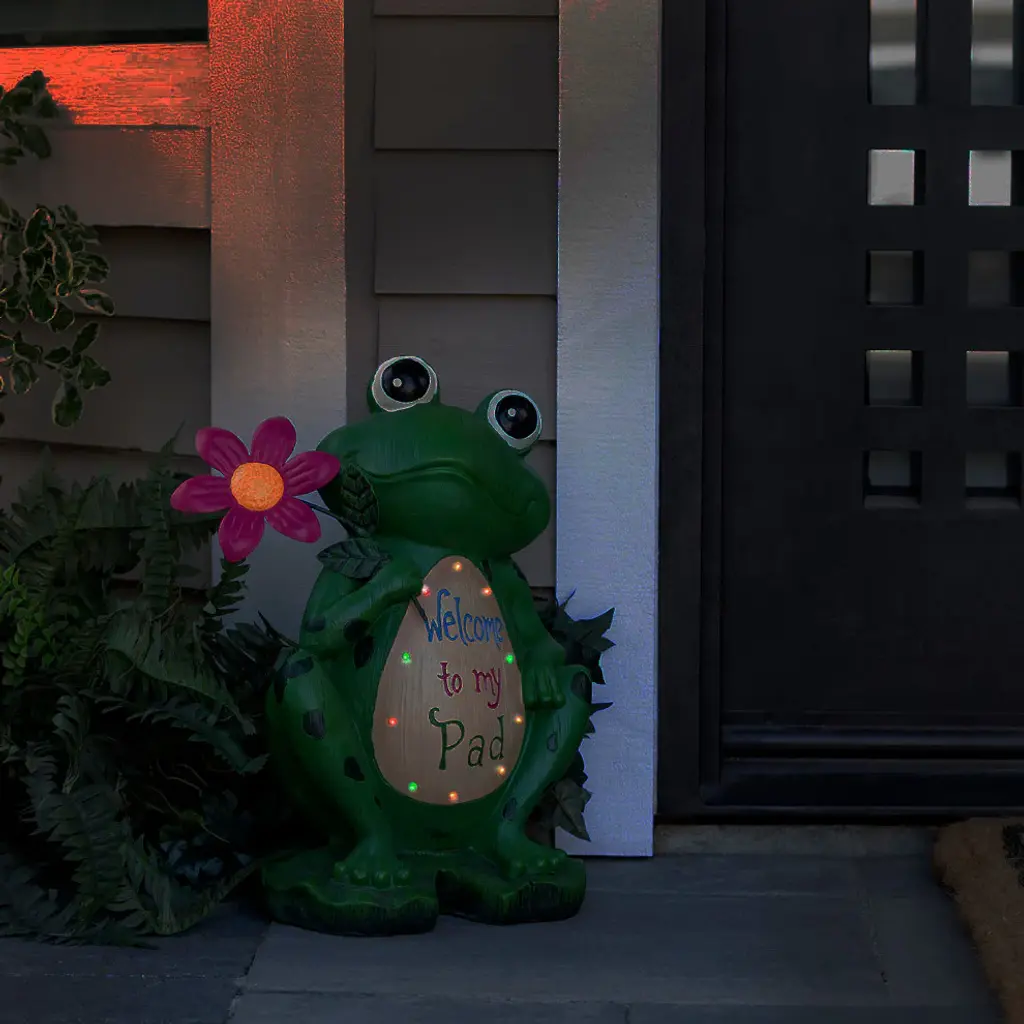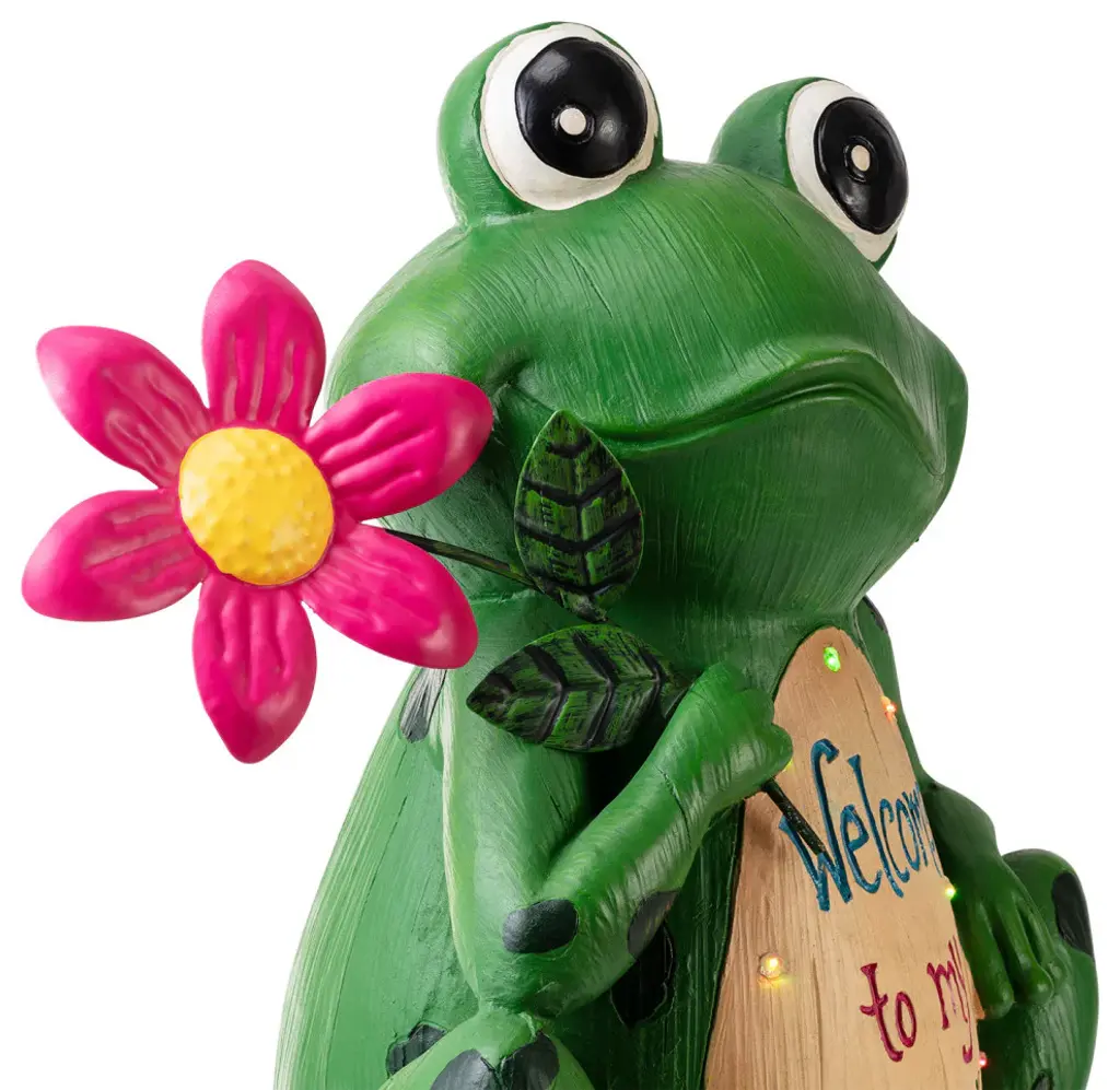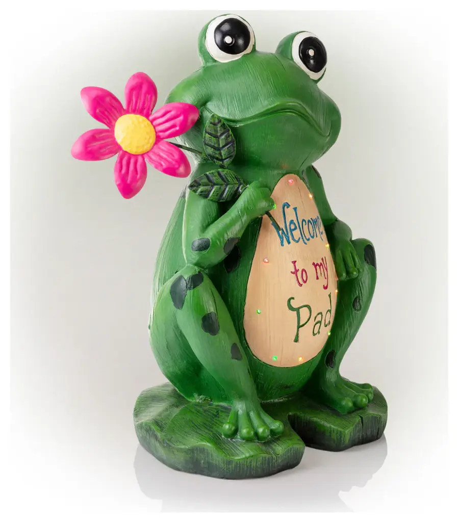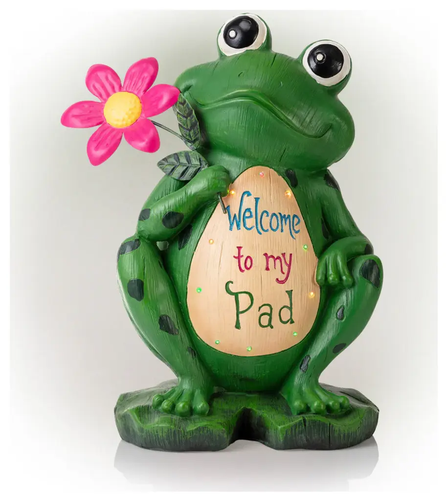 This charming frog statue will greet your guests with flower in hand and ''Welcome to my Pad'' on its chest. Includes color changing LEDs that circle the welcome message and change from green to blue then, red. Whimsically designed and constructed out of polyresin. Painted in playfully vibrant colors and finished to look carved out of wood. Takes 2 AA batteries, housed in a waterproof battery box which includes a 6 hour timer, so there''s no need to worry about leaving it on.