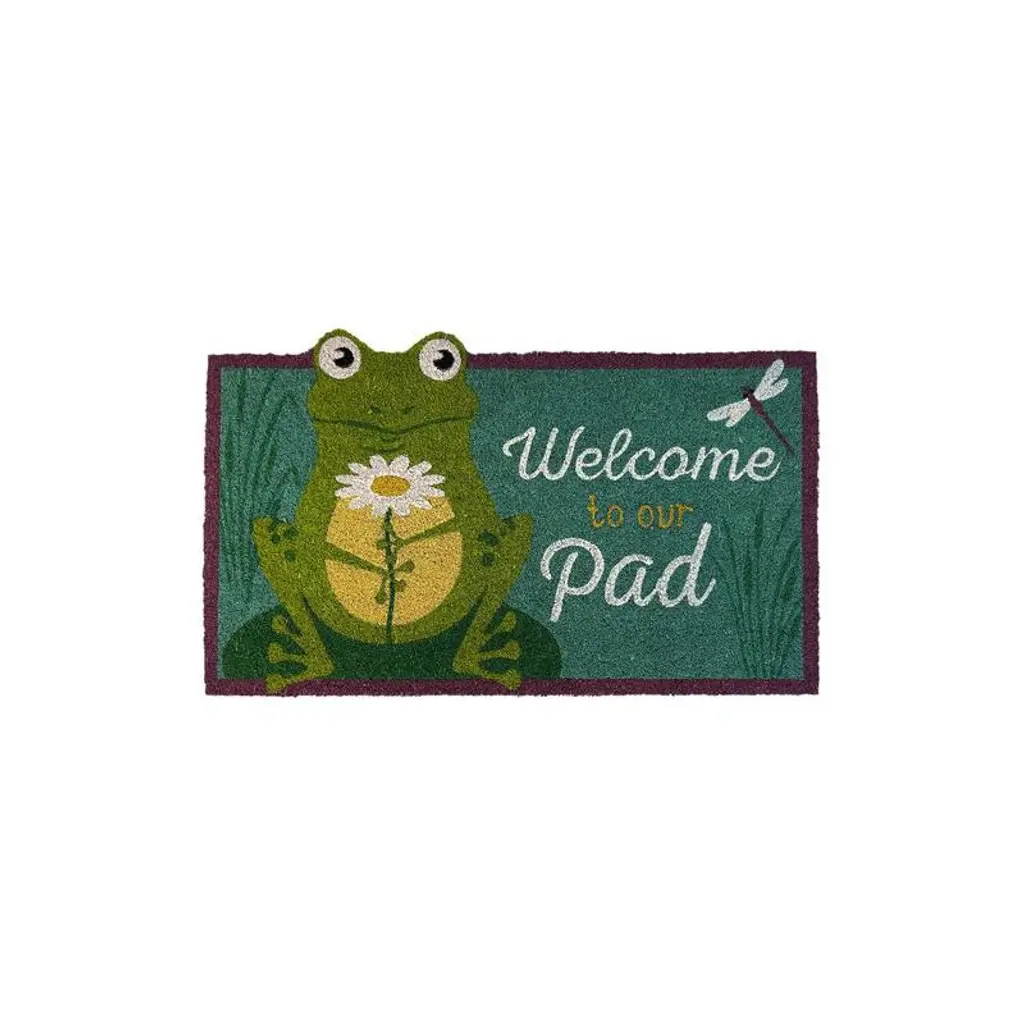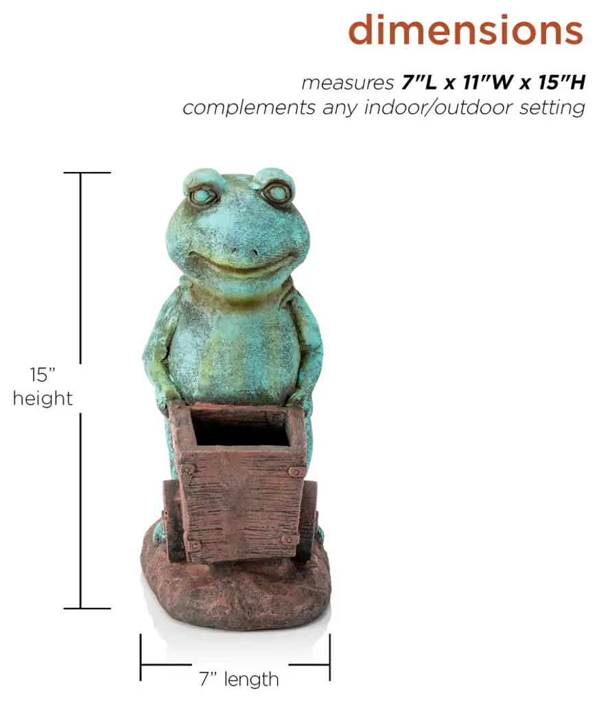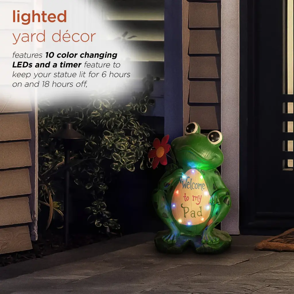 This charming frog statue will greet your guests with flower in hand and ''Welcome to my Pad'' on its chest. Includes color changing LEDs that circle the welcome message and change from green to blue then, red. Whimsically designed and constructed out of polyresin. Painted in playfully vibrant colors and finished to look carved out of wood. Takes 2 AA batteries, housed in a waterproof battery box which includes a 6 hour timer, so there''s no need to worry about leaving it on.