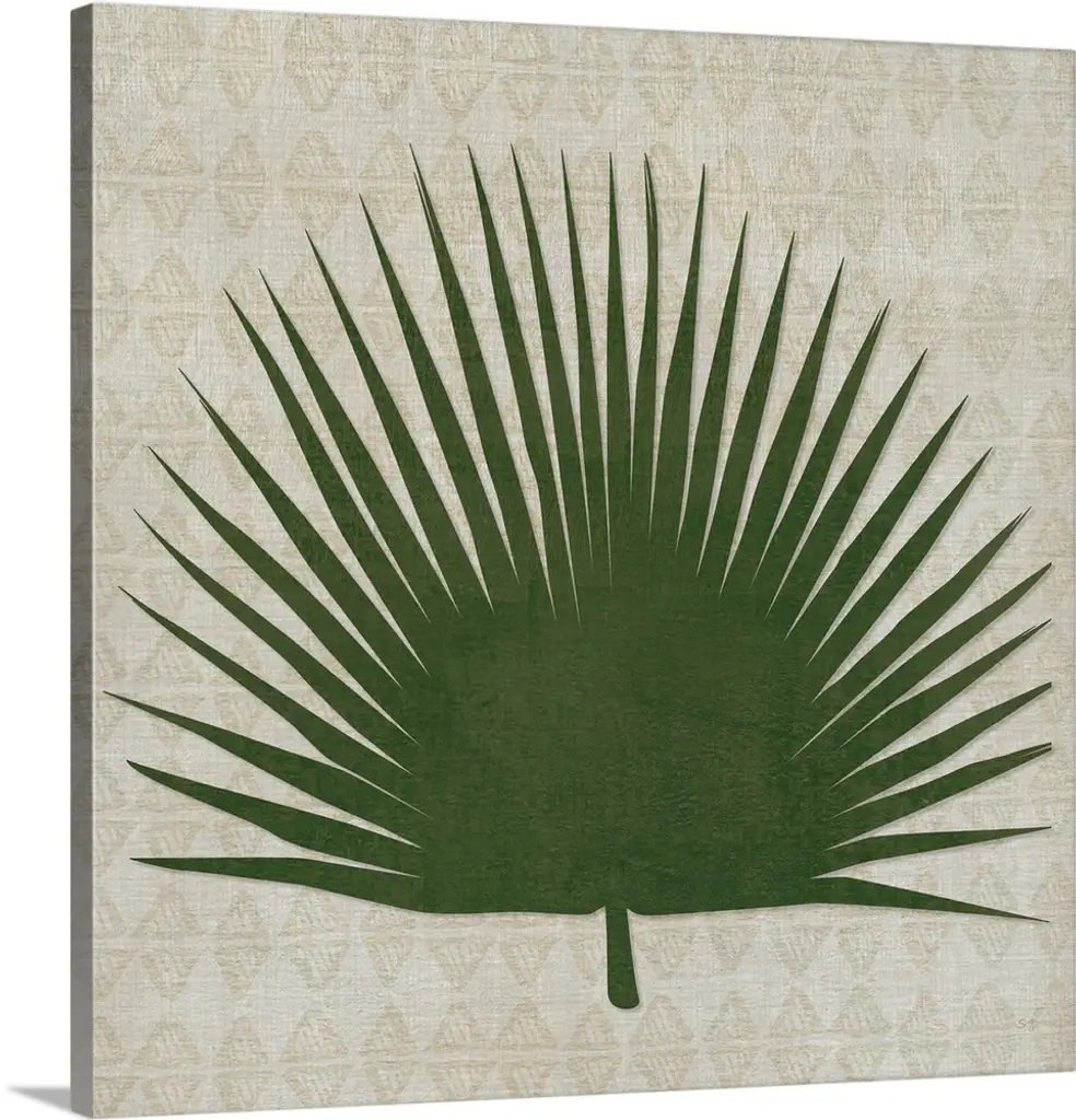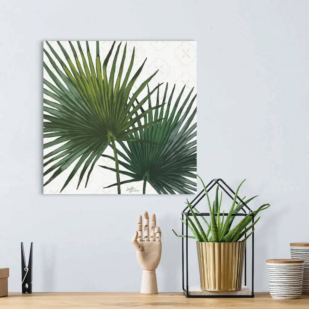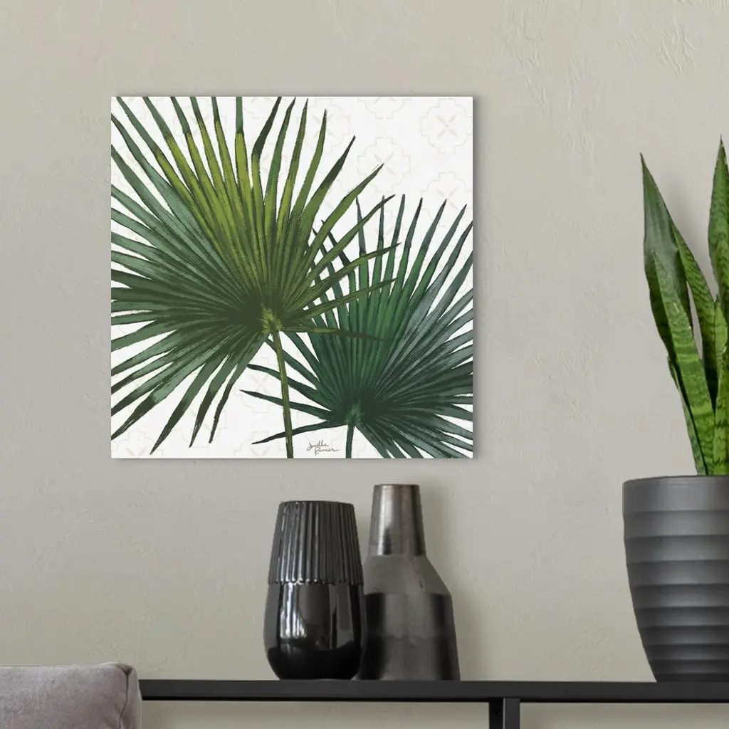 Square art of green palm leaves on a white background with a faint beige pattern.