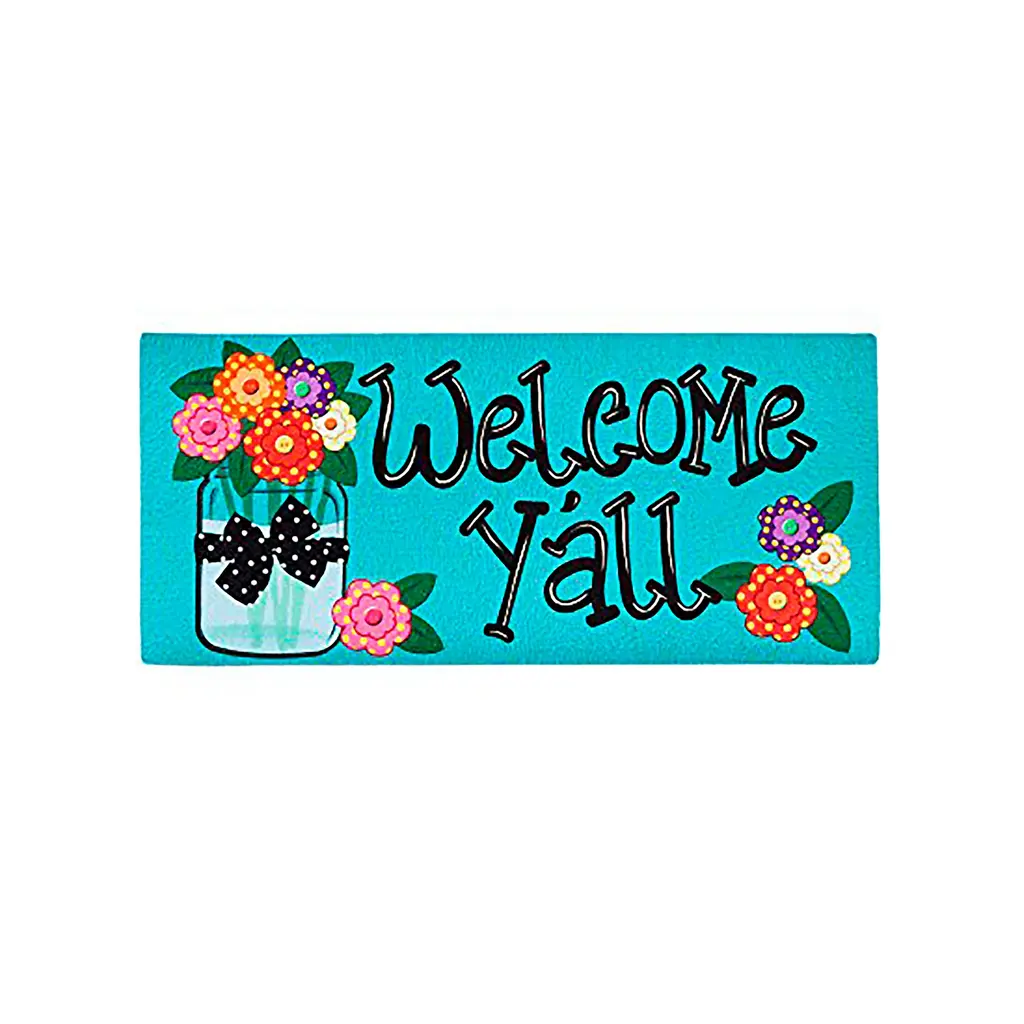 The perfect set for coordinating decorators! The Welcome Y'all Burlap Garden Flag and Sassafras Mat Set includes a sassafras switch mat with base and a matching garden burlap flag and stand. Both pieces read "Welcome Y'all" and feature a bevy of blooms set inside a rustic mason jar. The durable insert is created for placement in the included Sassafras mat frame tray. The charming design is heat sublimated onto the polyester and rubber insert. This Burlap Boutique flag is made of medium-weight, soft polyester burlap fabric that has the look and feel of real burlap. The flag features a sleeve at the top for use with the included metal stand. Both pieces are safe for outdoor use. Imported.
