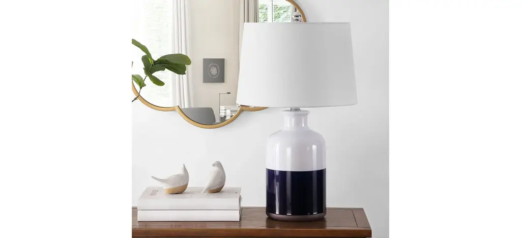 This Weldon Ceramic Table Lamp is a modern take on classic pottery forms, making it perfect for today's transitional d_cor. Weldon's ginger jar shape is given additional decorative depth with the subtle asymmetry of its white and natural bands, while a tapered drum shade softens the look.