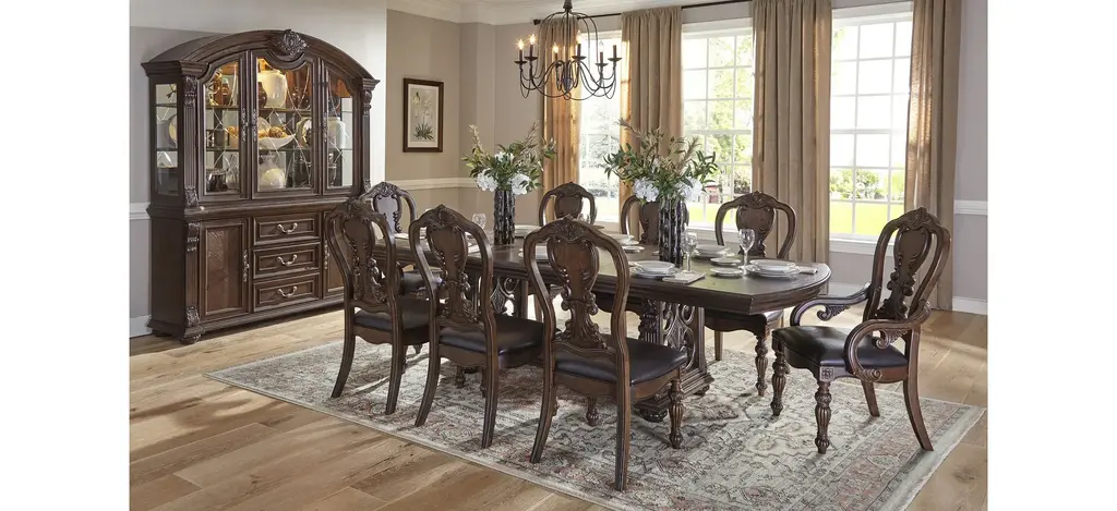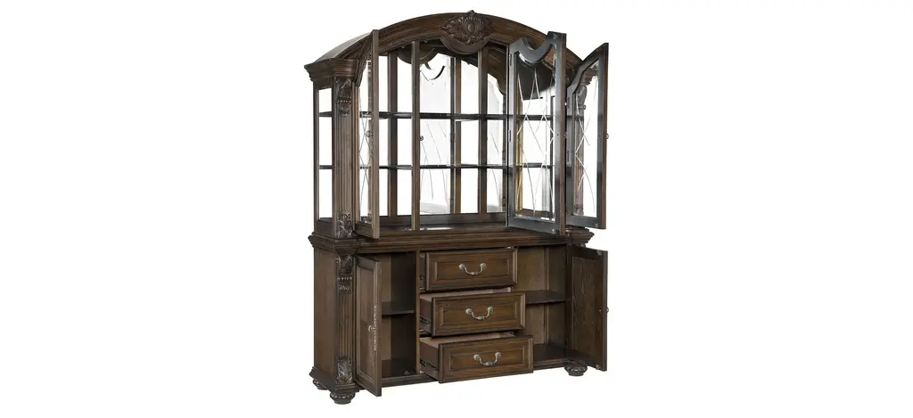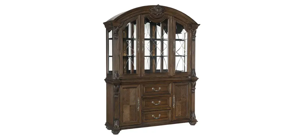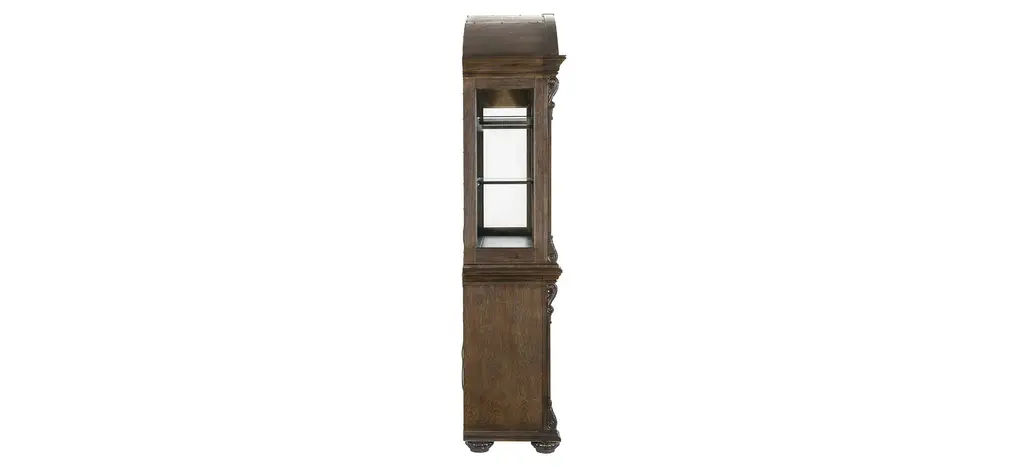 Wellington Collection invokes a timeless aesthetic for your home's traditional dining room. The dark oak finish highlights the distinct oak veneer of the collection, while also lending contrast to the decorative accenting of the curio's design. Faux keyhole hardware fronts the doors of the china, while traditional bale hardware fronts the drawers. The glass doors of the china's hutch allow for enclosed display of your tabletop accessories and decorative items while the base of the unit features wood doors that provide a closed storage option. Traditional accenting abounds throughout the piece with classic routed pilasters, moldings, and decorative pediments gracing the design.