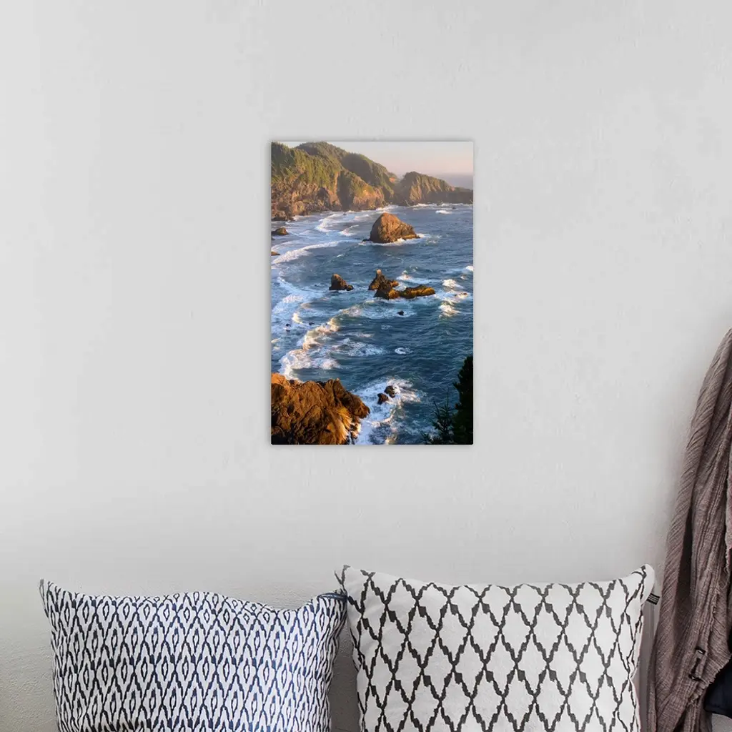 USA, West Coast, Oregon, State Scenic Corridor, Sunset with waves crashing.