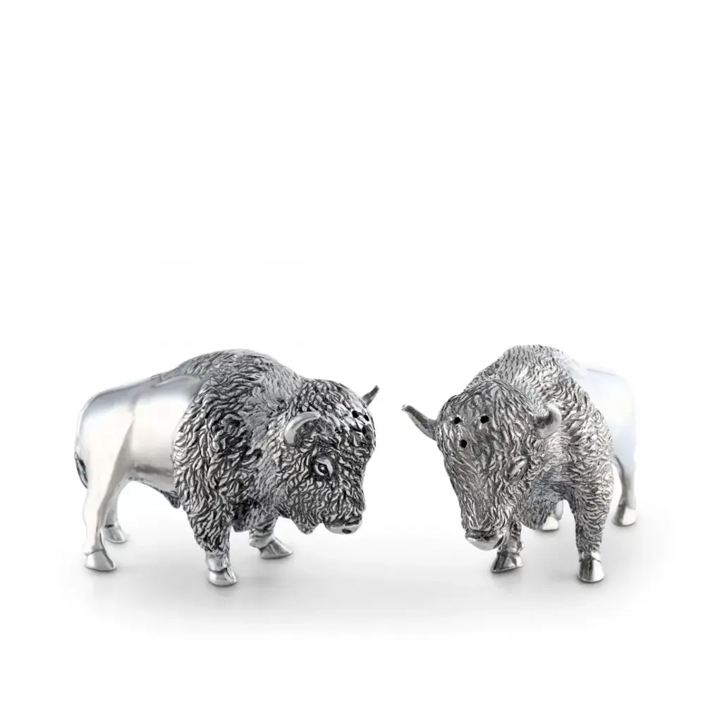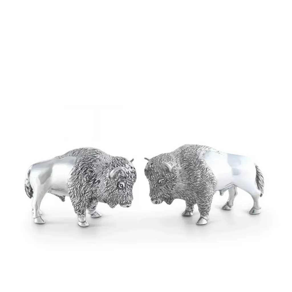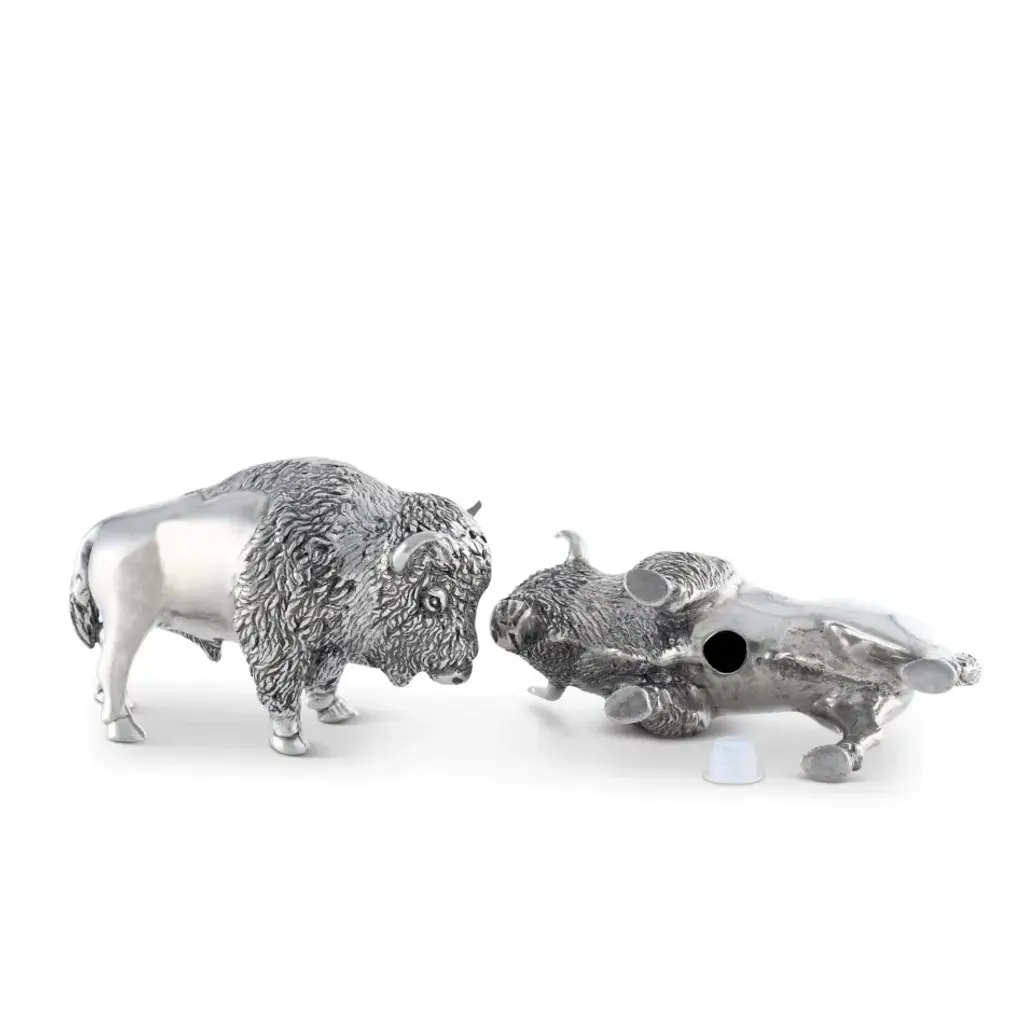 Vagabond House's Bison Salt and Pepper Set is crafted in richly detailed luxury grade pewter. Accurately detailed from their solid hooves to the tips of their horns, this set is a perfect table accent for a western ranch themed celebration or home. Wonderfully detailed and realistic Vagabond House Pewter Salt and Pepper sets make perfect gifts for nuptials, housewarming, collectors or just because. Vagabond House is a family-owned American company specializing in fine pewter tableware, servingware and giftware. Largely inspired by nature, their exclusive products are designed to be unique, functional heirlooms for those who seek to express tradition and style in both family and formal entertaining.