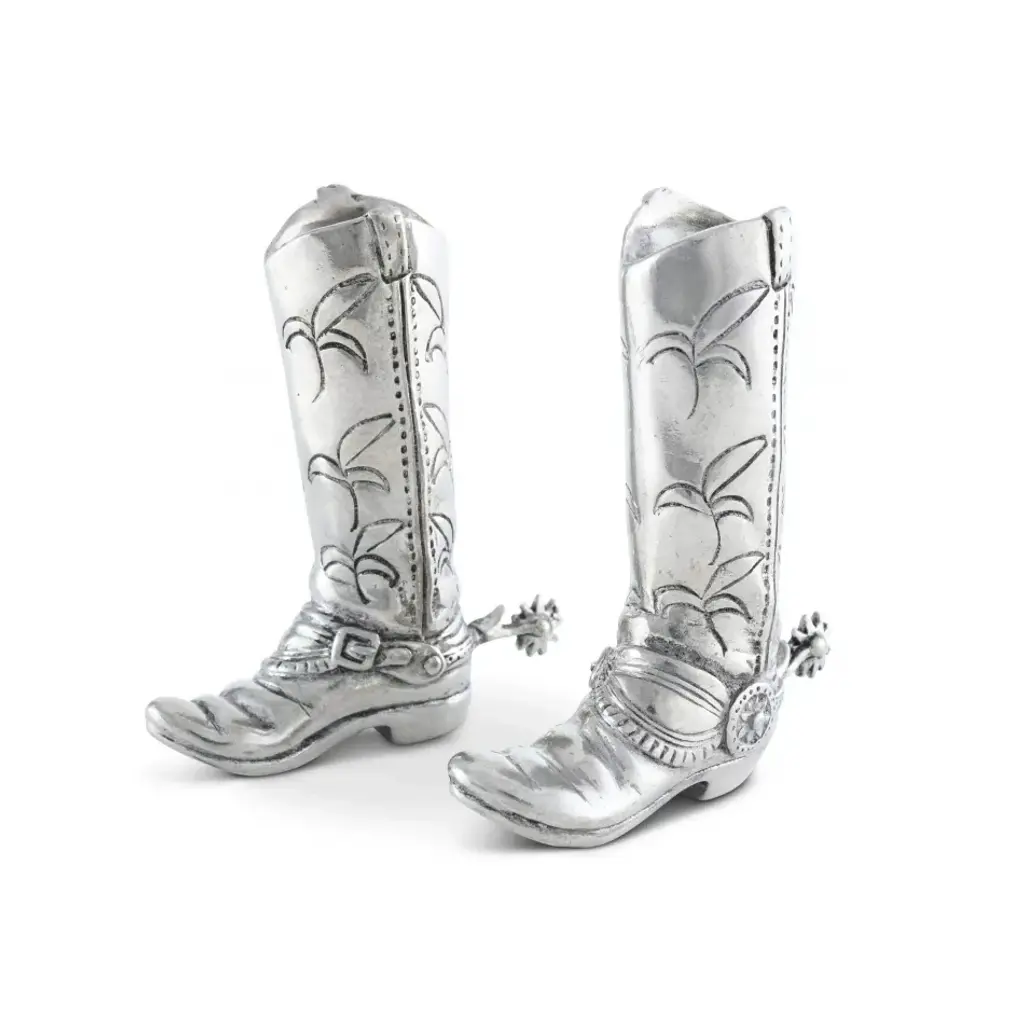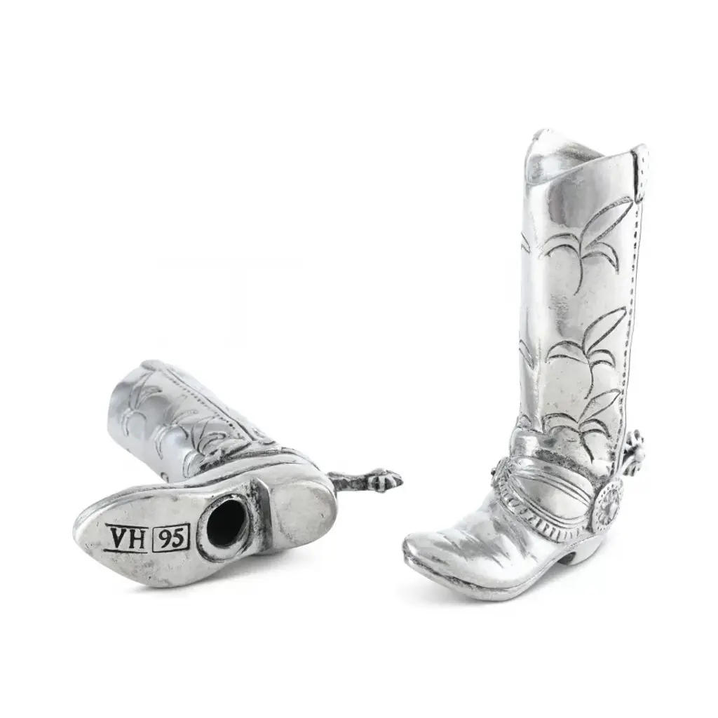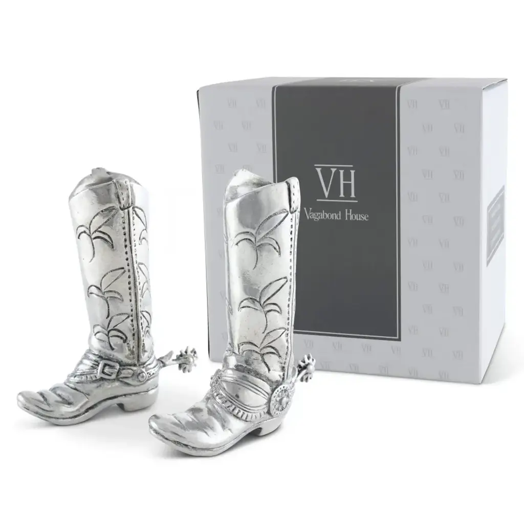 Vagabond House's Cowboy Boot Salt and Pepper Set is crafted in richly detailed pewter. Accurately embossed and charmingly detailed with spurs and buckles, this set is a perfect table accent for a western or ranch theme. Vagabond House is a family-owned American company specializing in fine pewter tableware, servingware and giftware. Largely inspired by nature, their exclusive products are designed to be unique, functional heirlooms for those who seek to express tradition and style in both family and formal entertaining.