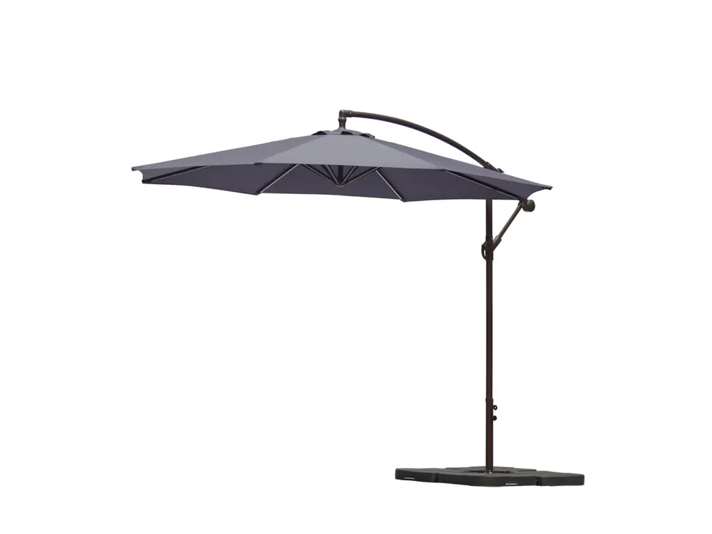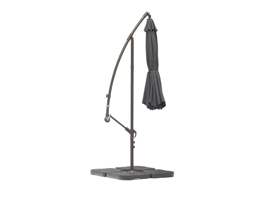 This UV- and water-resistant cantilever hanging outdoor patio umbrella with counterweights is a delightful addition to any home. The crank mechanism makes it easy to open and close this patio umbrella. Durable steel framing ensures long-lasting, weather-resistant enjoyment. The best part is that this set comes with everything to set up your perfect outdoor oasis.