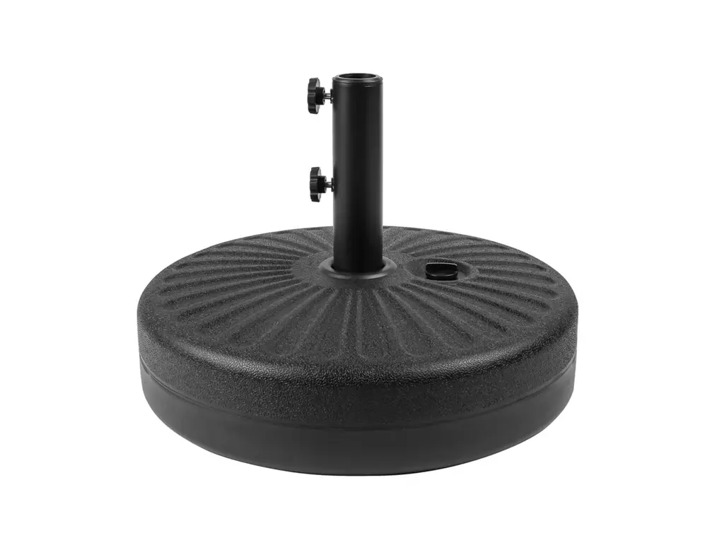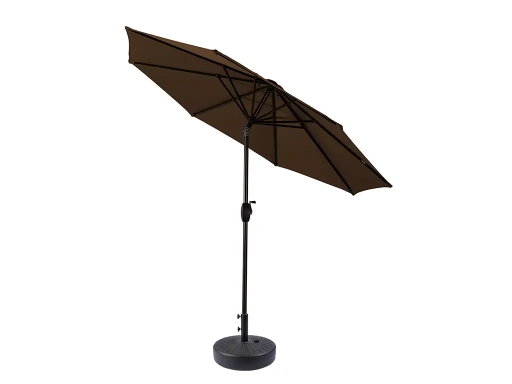 Enjoy being outdoors without the sun blasting down on you as you sit underneath this 9-foot patio umbrella and fillable base set. Use the vibrant umbrella to shield yourself from the elements and put a fun twist on your outdoor decor. A push-button tilt mechanism lets you adjust as you please so you can get just the right amount of sun. The base allows you to move the umbrella to any part of your yard. The best part is both are easy to set up, clean and require minimal maintenance.