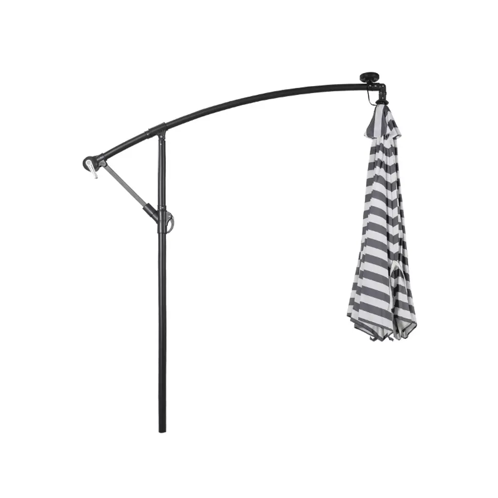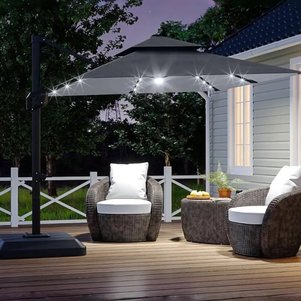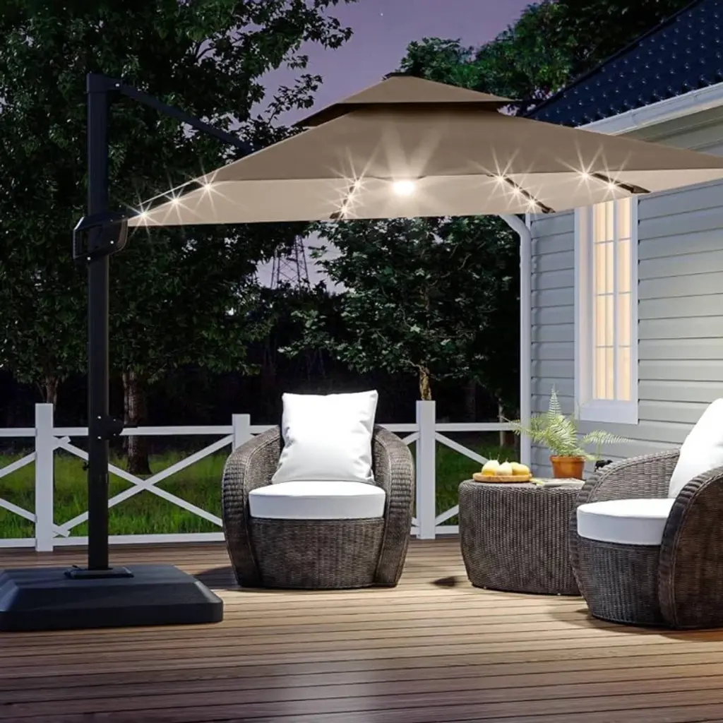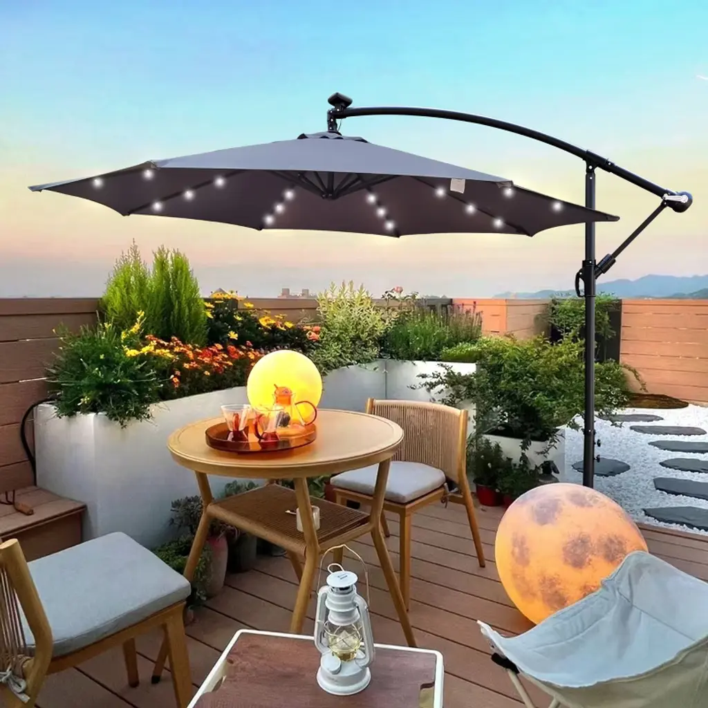 Block out the shining sun during the day and create a romantic space during the evening with this amazing 10 ft LED cantilever umbrella. Stay protected in the shade with the polyester canopy that blocks that warm, bright sun, and protects you from the harmful UV rays. The canopy has a vented top to help with airflow, keep things cool underneath the umbrella, and prevent the umbrella from falling during strong gust of winds with the help of 4 plastic base weights to weigh down the umbrella. The canopy has 32 pre-installed, solar-powered LED lights that will light up your night and create a place of peace that you can enjoy.While we strive to accurately represent product colors, please be aware that actual colors may vary slightly due to individual screen settings and lighting conditions. FeaturesSet Includes: One (1) 10 Ft umbrella and four (4) plastic base weights32 Solar powered LED lights Hand cranked lift mechanism to open the umbrella in secondsUV and water resistant polyester canopyVented canopy top for better airflow and to keep you cool under the umbrella Rust resistant 1.9" diameter pole Details:Product Type: Patio Umbrella & BaseWhat's Included: (1) Umbrella; (1) Umbrella BaseUmbrella BaseDimensions: 20" W x 20" D x 3" HWeight: 18.5 lbs.