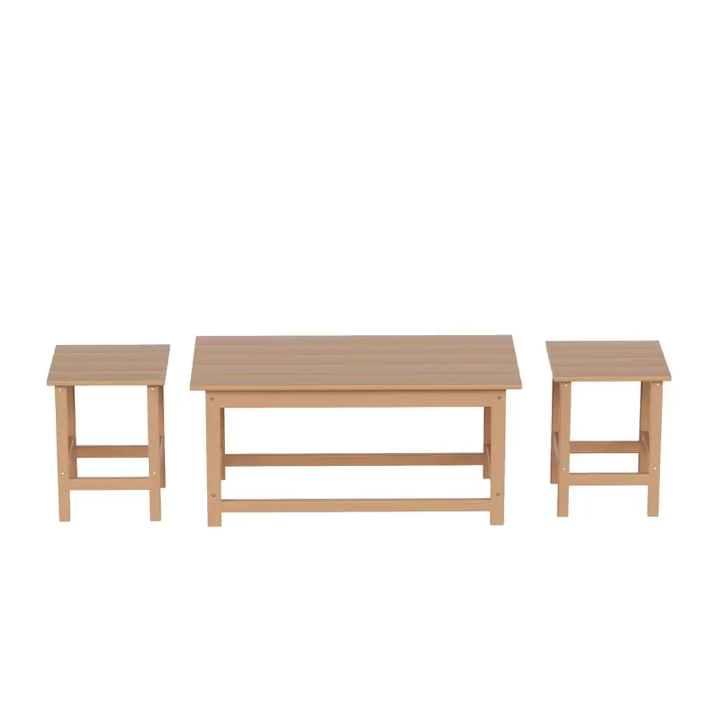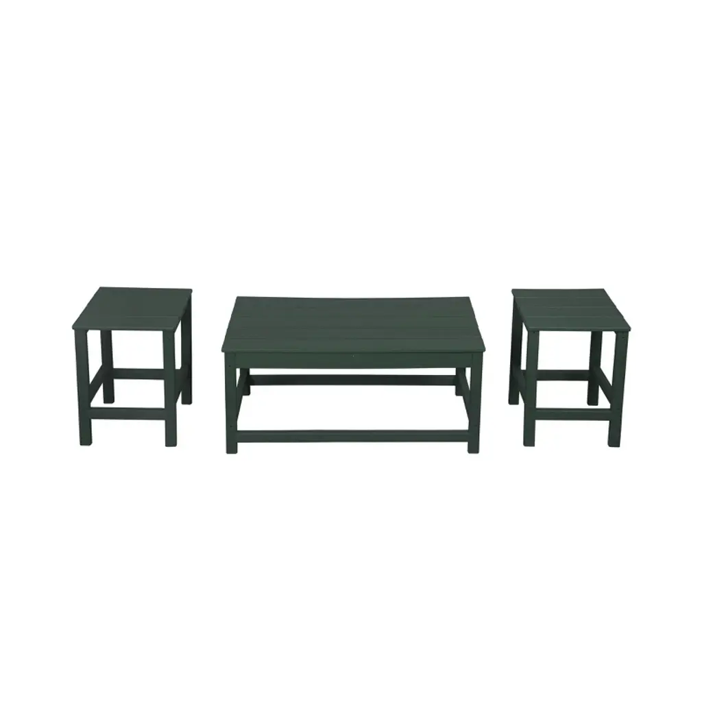 Give your patio or indoor décor some flair with this stylish 3-piece side table and coffee table set. Constructed from a durable HDPE lumber that is UV and weather resistant to preserve the vibrant color all season. This set is perfect for indoors or outdoors and will make a perfect addition to your home.While we strive to accurately represent product colors, please be aware that actual colors may vary slightly due to individual screen settings and lighting conditions. FeaturesSet includes: two (2) side tables, one (1) coffee tableDurable solid HDPE lumber constructionWeather and UV resistantEasy to clean with soap and waterSimple to assembleDetails:Product Type: Patio Table SetsWhat's Included: (2) Side Table; (1) Coffee TableCoffee TableDimensions: 35.25" W x 17.5" D x 16" HWeight: 21 lbs.Table Top Width: 14"Table Top Depth: 14"Table Top Thickness: 0.5"Weight Capacity: 220 lbs.Side TableDimensions: 14" W x 14" D x 18" HWeight: 9 lbs.Table Top Width: 14"Table Top Depth: 14"Table Top Thickness: 0.5"Weight Capacity: 180 lbs.