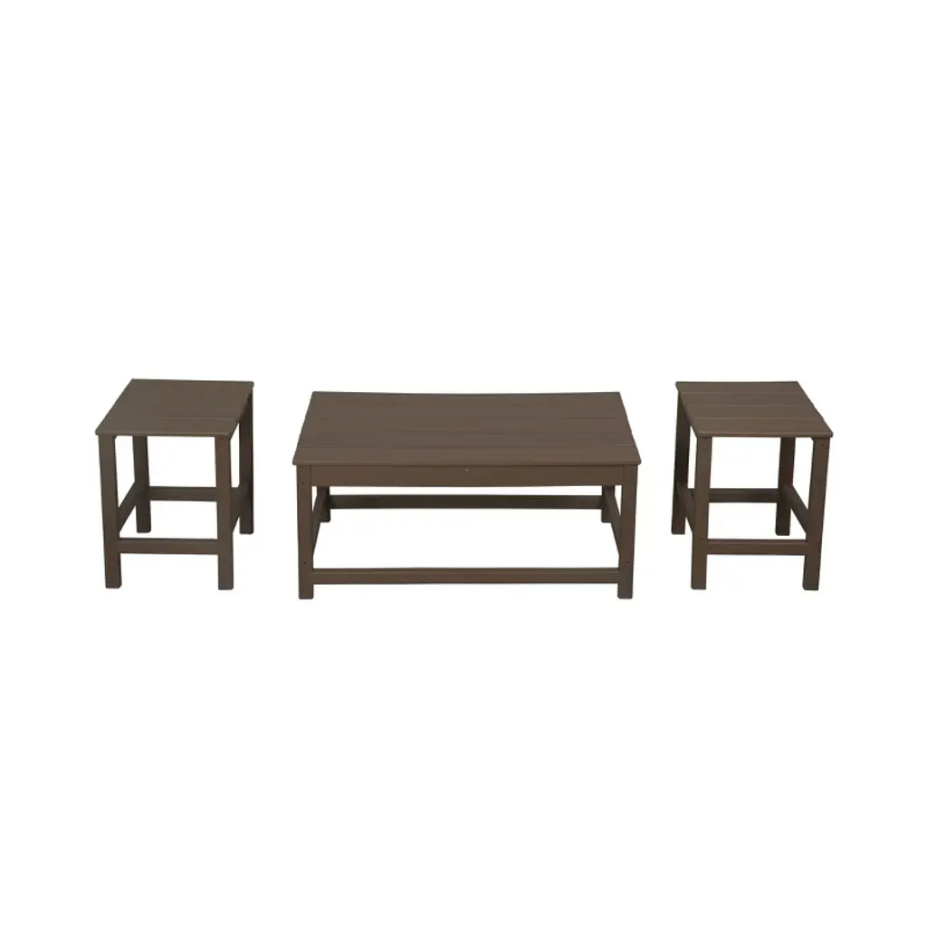 Give your patio or indoor décor some flair with this stylish 3-piece side table and coffee table set. Constructed from a durable HDPE lumber that is UV and weather resistant to preserve the vibrant color all season. This set is perfect for indoors or outdoors and will make a perfect addition to your home.While we strive to accurately represent product colors, please be aware that actual colors may vary slightly due to individual screen settings and lighting conditions. FeaturesSet includes: two (2) side tables, one (1) coffee tableDurable solid HDPE lumber constructionWeather and UV resistantEasy to clean with soap and waterSimple to assembleDetails:Product Type: Patio Table SetsWhat's Included: (2) Side Table; (1) Coffee TableCoffee TableDimensions: 35.25" W x 17.5" D x 16" HWeight: 21 lbs.Table Top Width: 14"Table Top Depth: 14"Table Top Thickness: 0.5"Weight Capacity: 220 lbs.Side TableDimensions: 14" W x 14" D x 18" HWeight: 9 lbs.Table Top Width: 14"Table Top Depth: 14"Table Top Thickness: 0.5"Weight Capacity: 180 lbs.