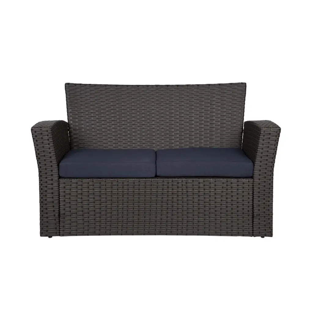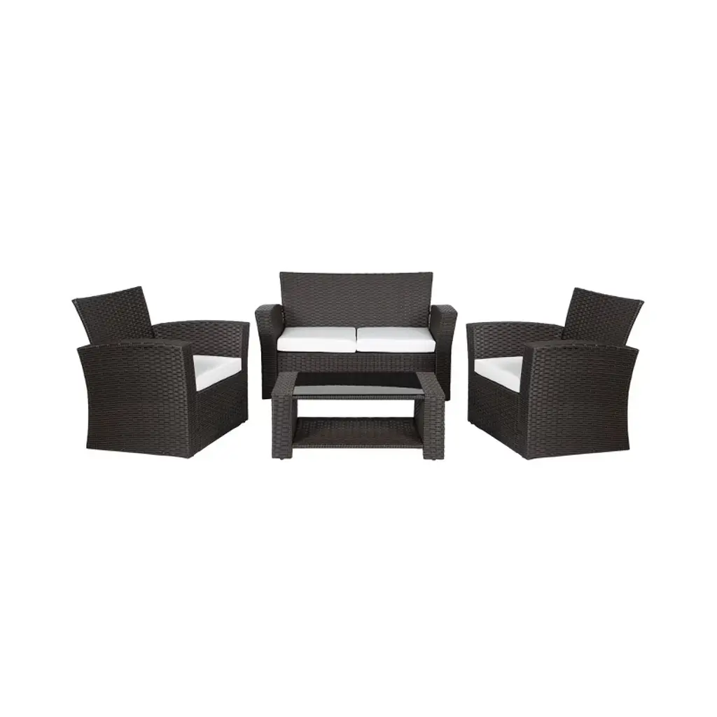 Whether you're lounging by the pool, patio, or balcony, this patio set is sure to be the center piece for your outdoor living space. Each piece is designed with a sturdy steel and rattan wicker frame that can withstand even the worst weather—from windy rain to all-day sunshine. With comfortable cushions, you can spend hours chatting with friends or family while placing your drinks and snacks on the tempered glass coffee table. This cozy 4-piece sofa set is certain to be the center of attention at gatherings and is the ideal addition to any outdoor living space.While we strive to accurately represent product colors, please be aware that actual colors may vary slightly due to individual screen settings and lighting conditions. FeaturesSet includes: one (1) sofa, one (1) loveseat, two (2) armchairs, and one (1) coffee tableDurable HDPE rattan wickerUV resistant 3" Inch removable seat cushionsSmoked black tempered glass coffee tableRust resistant steel frameDetails:Product Type: Patio Conversation SetsWhat's Included: (2) Chair; (1) Loveseat; (1) TableChairDimensions: 30.75" W x 28.75" D x 31.5" HLoveseatDimensions: 51" W x 38.75" D x 31.5" HWeight: 106 lbs.Weight Capacity: 600 lbs.TableDimensions: 34.5" W x 19.25" D x 13.75" HWeight Capacity: 110 lbs.