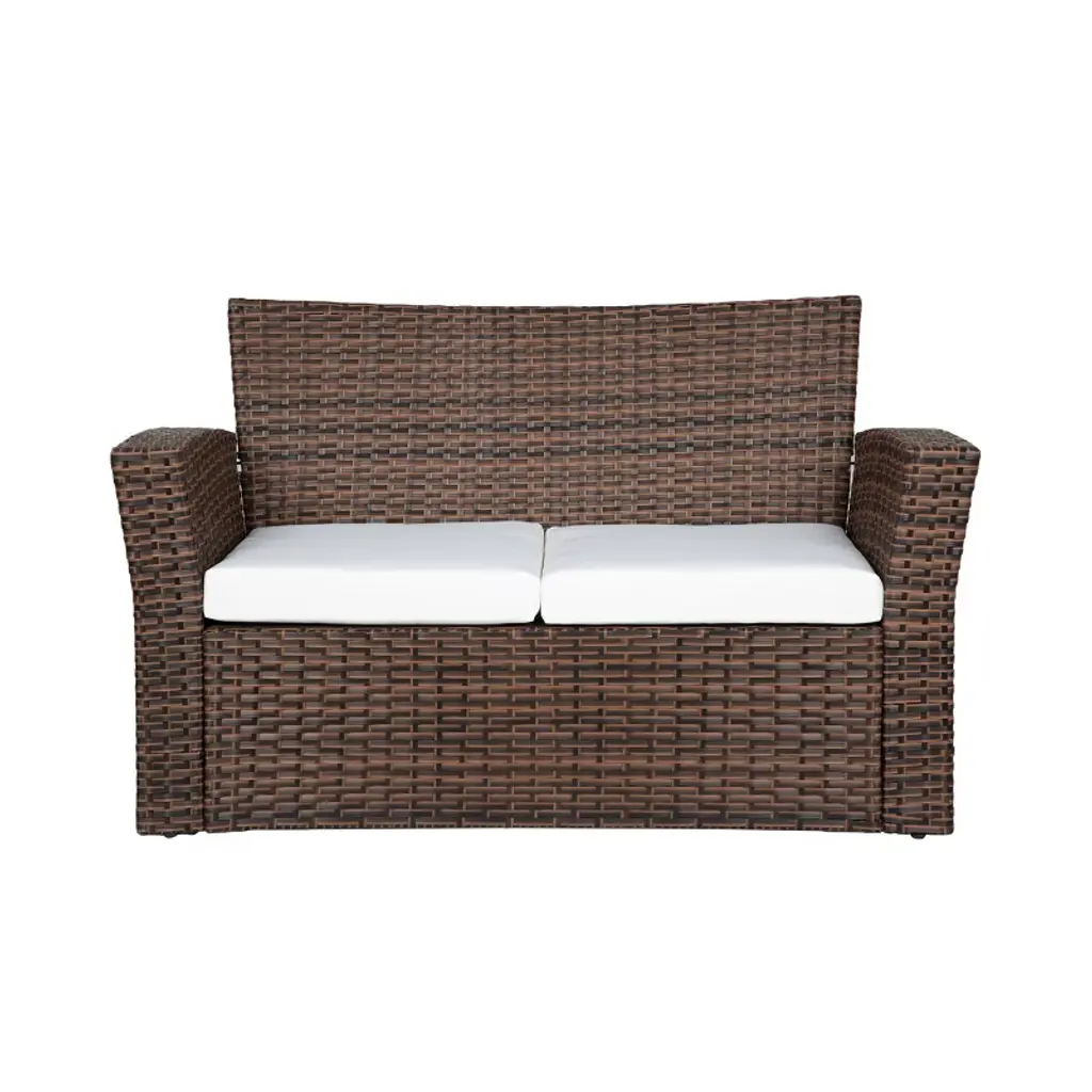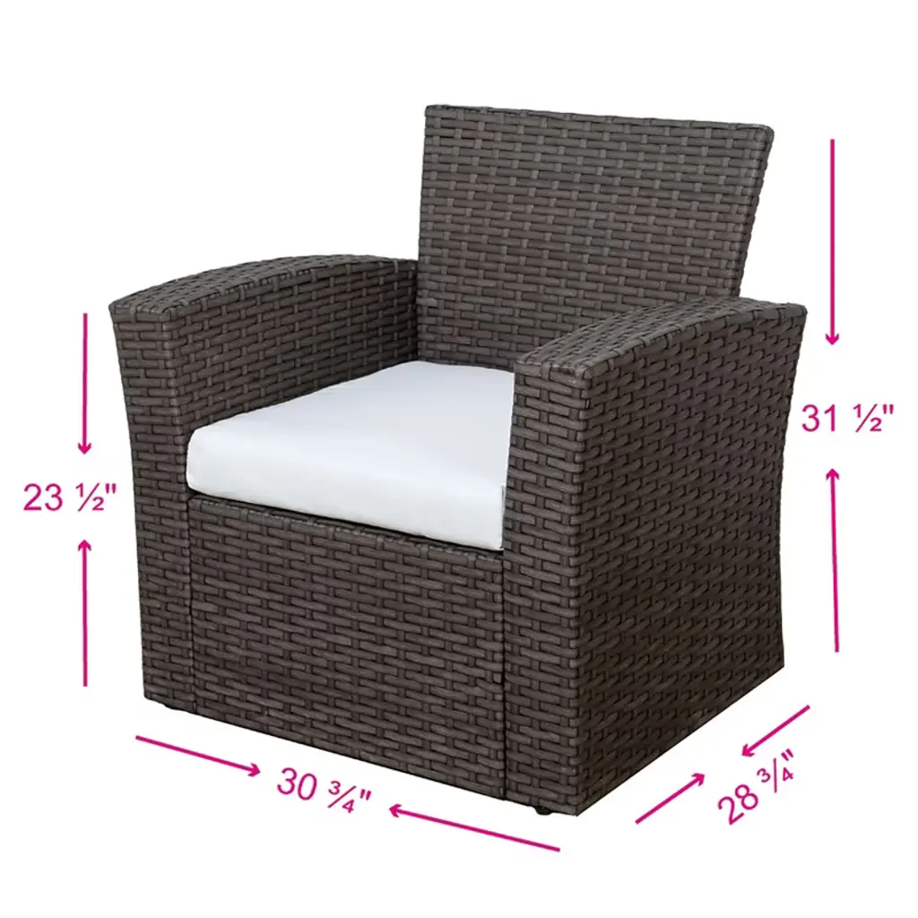 Lounging by the pool, patio, or balcony, no matter where you are, this patio set is sure to be the center piece for your outdoor living space. Each piece is designed with a sturdy steel and rattan wicker frame that can withstand even the worst weather, from windy rain to all-day sunshine. With comfortable cushions, you can spend hours chatting with friends or family while placing your drinks and snacks on the tempered glass coffee table. This cozy 4-piece set is certain to be the gathering of parties and the ideal addition to any outdoor living space.While we strive to accurately represent product colors, please be aware that actual colors may vary slightly due to individual screen settings and lighting conditions. FeaturesSet includes one (1) sofa, one (1) loveseat, two (2) armchairs, and one (1) coffee tableHDPE rattan wicker that strengthens the seatsUV and weather resistant material protects the set from the outdoor weather3" Inch removable seat cushions with removable cover for an easy washSmoked black tempered glass table that is four times stronger than normal glassRust resistant durable steel frameDetails:Product Type: Patio Conversation SetsWhat's Included: (2) Chair; (1) Loveseat; (1) TableChairDimensions: 30.75" W x 28.75" D x 31.5" HLoveseatDimensions: 51" W x 38.75" D x 31.5" HWeight: 106 lbs.Weight Capacity: 600 lbs.TableDimensions: 34.5" W x 19.25" D x 13.75" HWeight Capacity: 110 lbs.