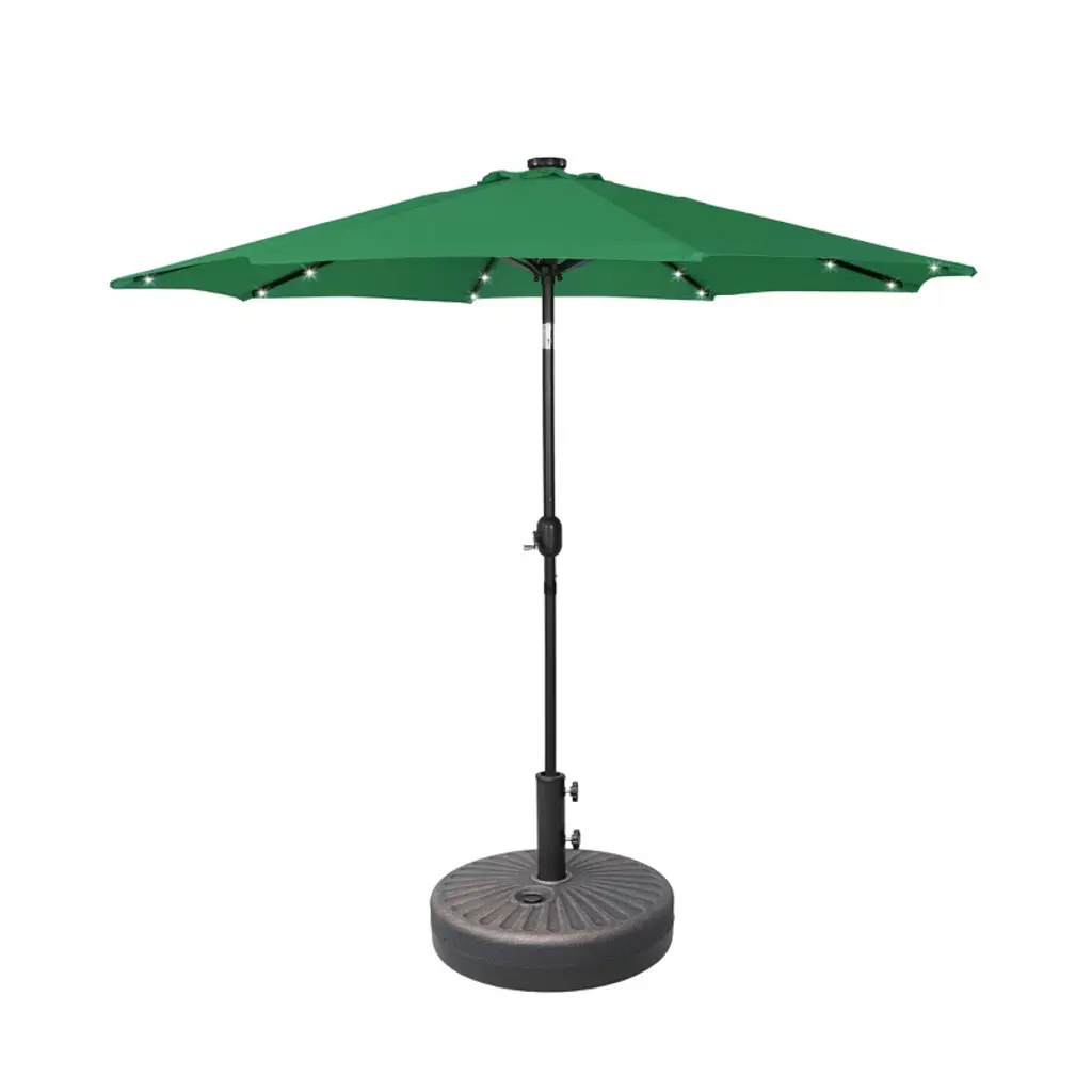 The 9-ft umbrella with LED lighting will keep you well-lit all night long while you unwind in the shade and relax at night under the light. The 32 solar-powered LED lights are powered by the solar panel on top of the umbrella, which keeps them on all night. It features a simple hand cranked lift and a easy-to-push button tilt that can easily cover the sun at any angle and power the solar lights at the same time! Keep cool all day long with the umbrella's vented design, that promotes airflow to keep you cool while under the umbrella and makes it easier for strong gusts to move through the fabric. With the round bronze base, it makes for a sturdier design. A long-lasting, water and fade-resistant polyester fabric blocks the sun and harmful UV rays. This umbrella is perfect for all your needs and will make the perfect addition to your backyard.While we strive to accurately represent product colors, please be aware that actual colors may vary slightly due to individual screen settings and lighting conditions. FeaturesLong lasting weather and fade resistant (180G) polyester fabric blocks out 95% of UV raysEasy tilt and crank functionality can conveniently position the umbrella at the perfect angle, and easily open and close itEight steel ribs and a thick steel center pole enhance strength and sturdiness.32-solar powered LED lights that save energy during the day while turned offVented canopy helps with airflow and reduces harsh winds from tipping the umbrellaUV protection that is similar to SPF 30Powder coated to prevent rust on aluminum frameDetails:Product Type: Patio Umbrella & BaseWhat's Included: (1) Umbrella; (1) Umbrella BaseUmbrella BaseDimensions: 20" W x 20" D x 13" HWeight: 4.5 lbs.