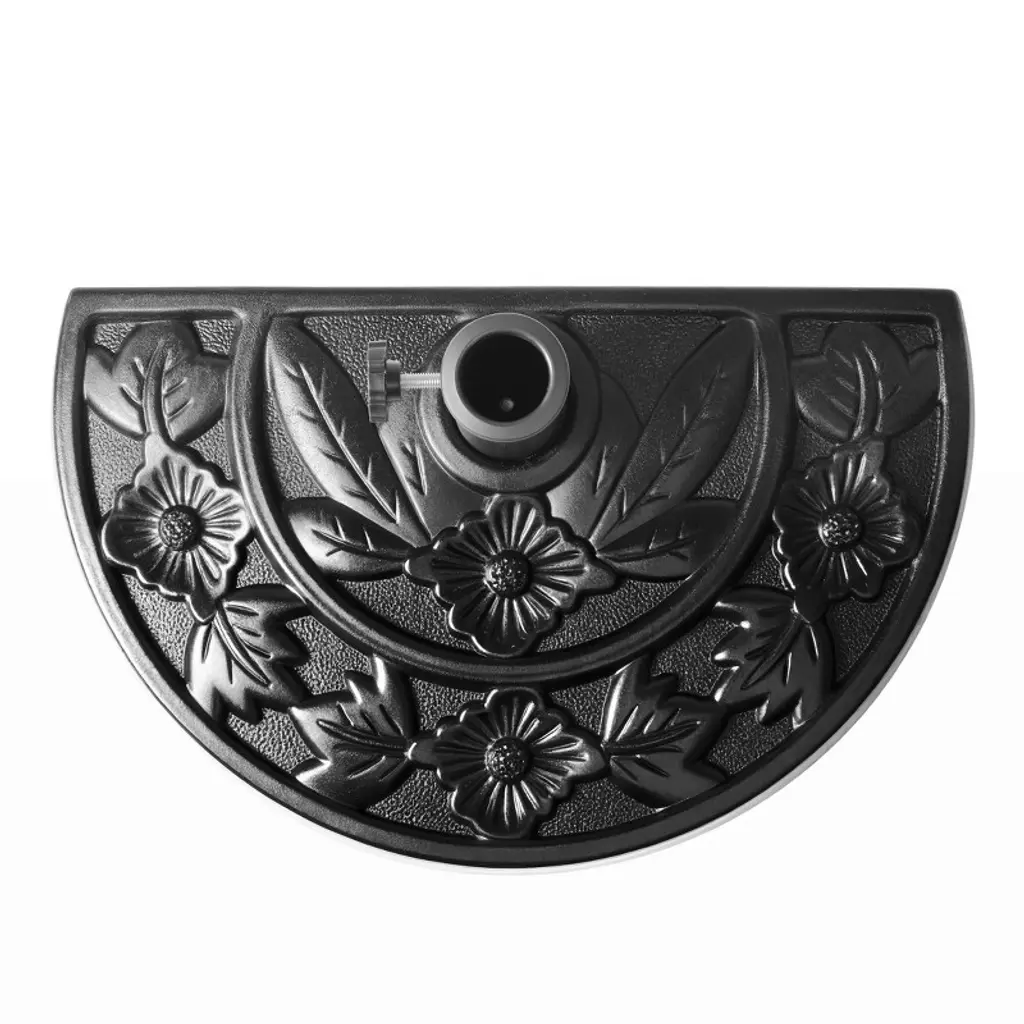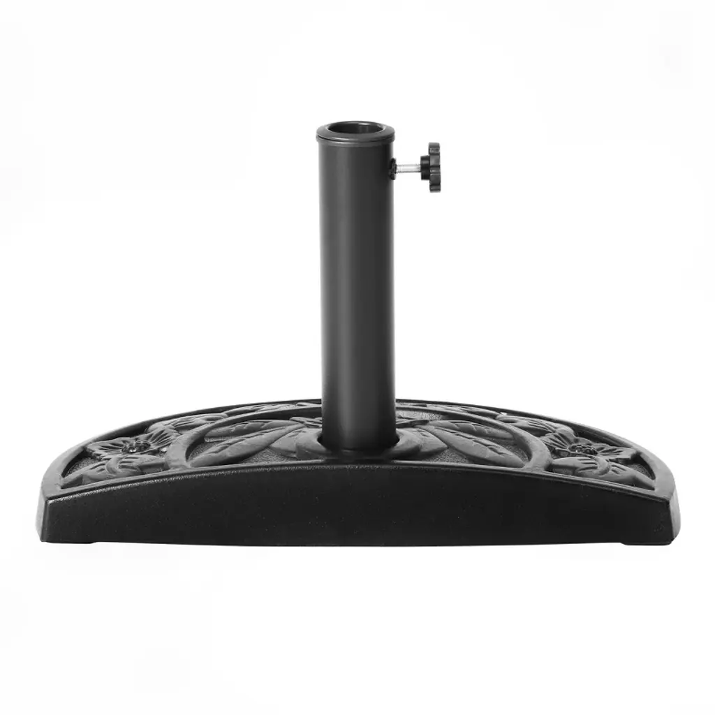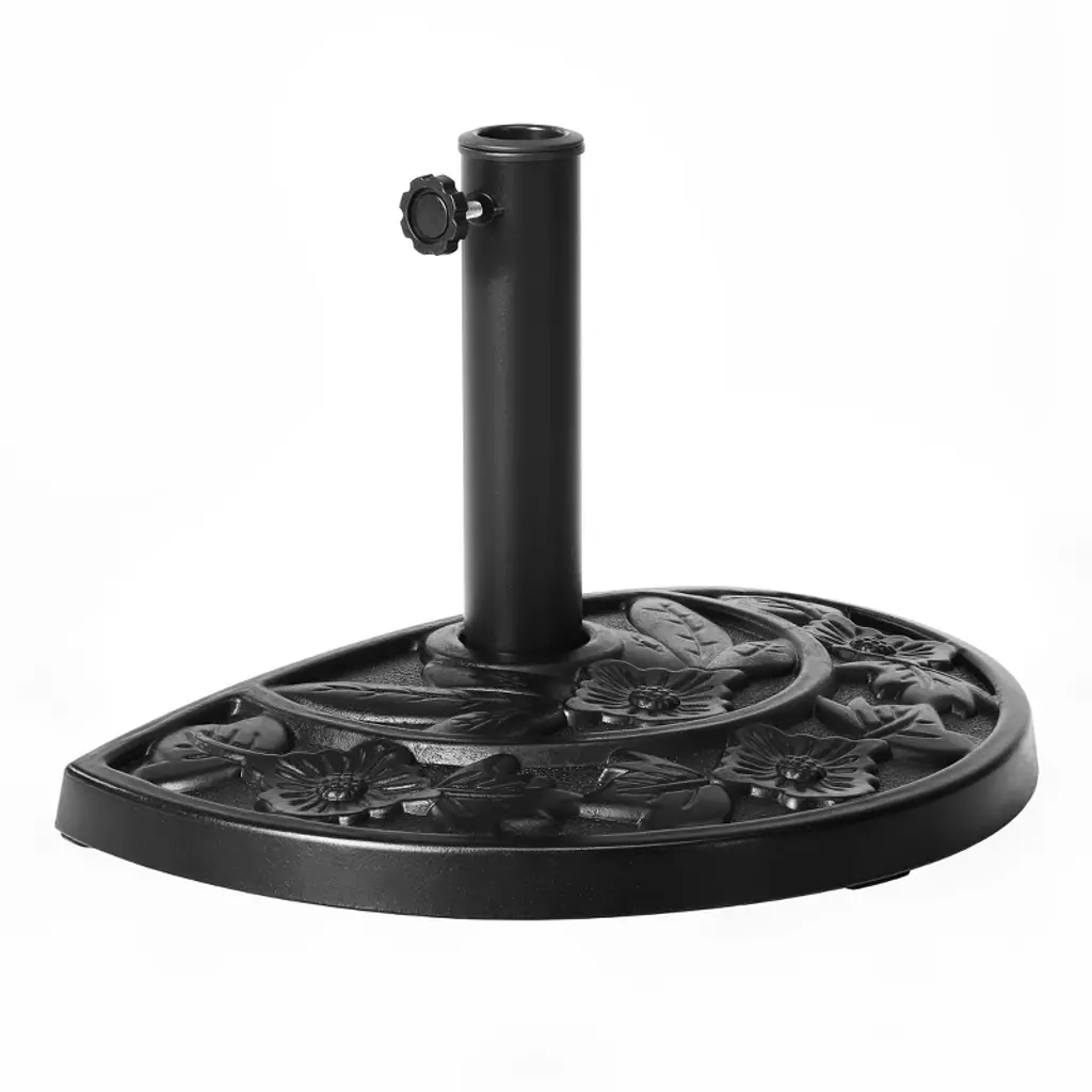 Provide your apartment balcony or your window wall warm and welcoming shade. Everything you need is included such as the half round patio umbrella and half round resin base. A perfect combination to design a comfortable outdoor living space in the summer sun. Umbrella is made of weather resistant polyester canopy and durable rust resistant steel frame. Umbrella base is made with sturdy concrete and a steel umbrella pole to secure umbrella in the upright position. A must for any patio garden.While we strive to accurately represent product colors, please be aware that actual colors may vary slightly due to individual screen settings and lighting conditions. FeaturesSet Includes: One 9ft Half Round Patio Umbrella and One Black Resin BaseUV and fade resistant polyester canopyCrank lift mechanismWeather resistant aluminum frame with steel ribsAir vented canopy for cool airflowDurable resin baseRust resistant aluminum poleDetails:Product Type: Patio Umbrella & BaseWhat's Included: (1) Umbrella; (1) Umbrella BaseUmbrella BaseDimensions: 19.5" W x 12.5" D x 12.5" HWeight: 20.75 lbs.