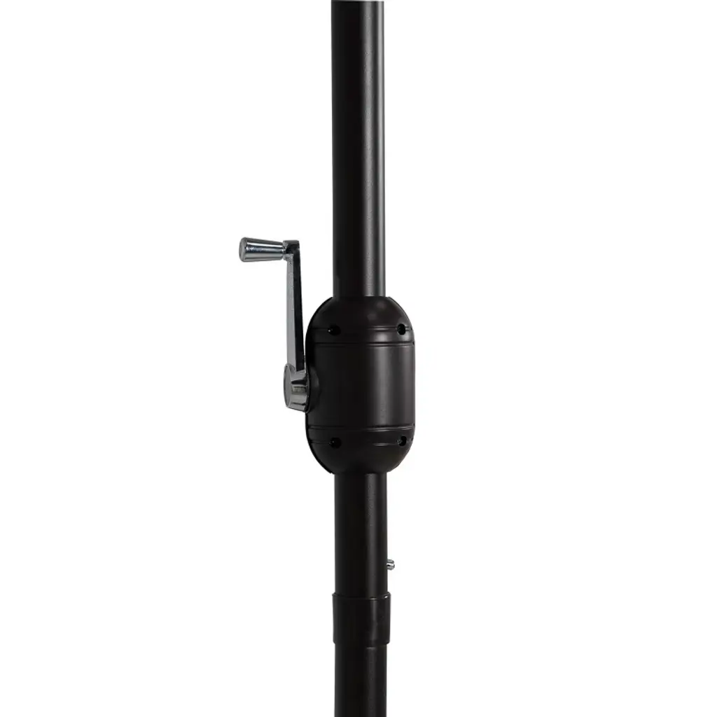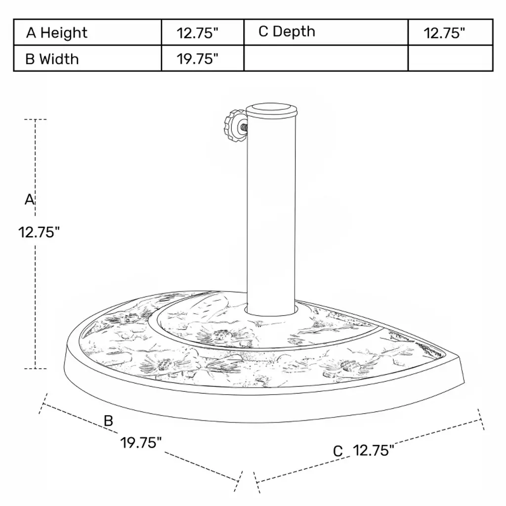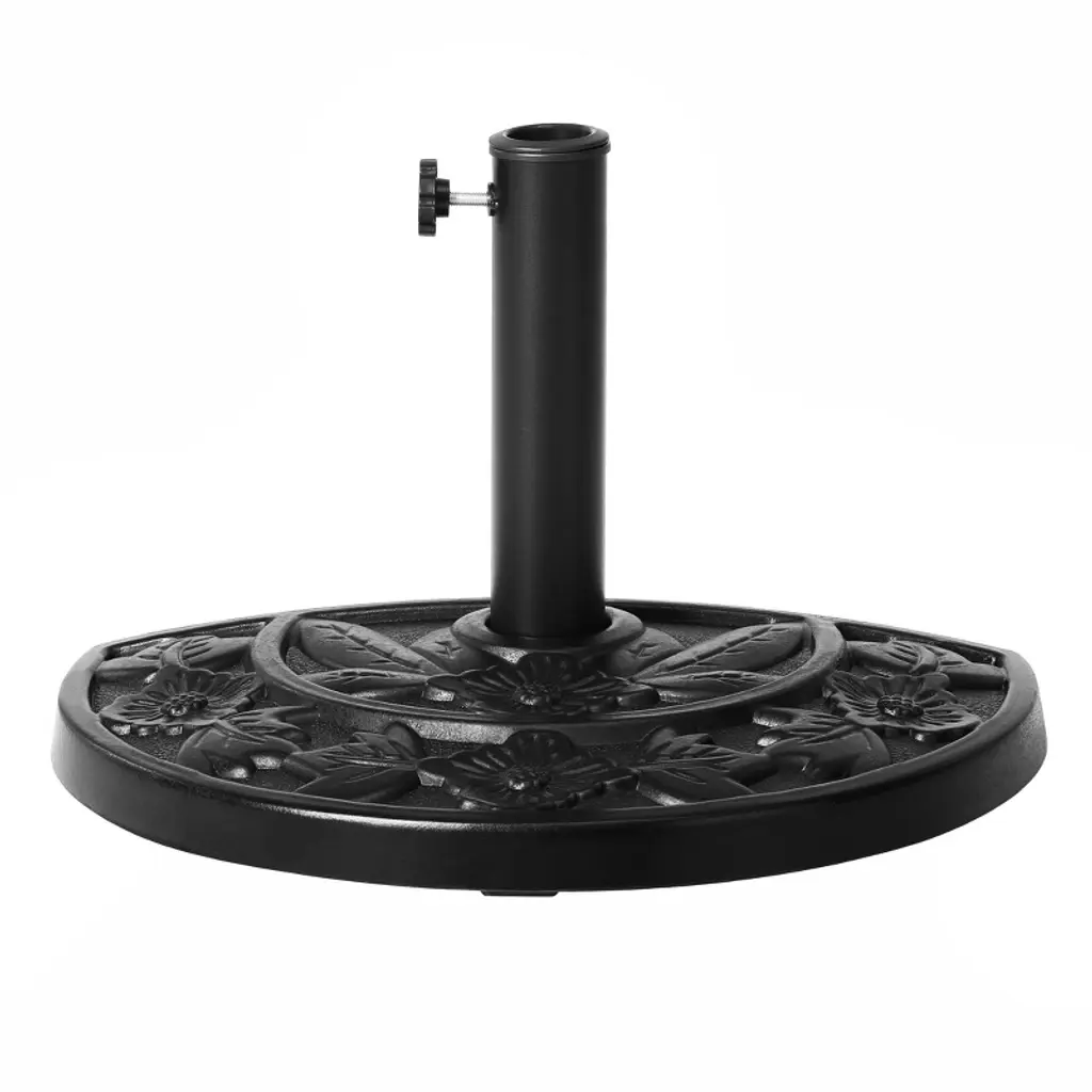 Provide your apartment balcony or your window wall warm and welcoming shade. Everything you need is included such as the half round patio umbrella and half round resin base. A perfect combination to design a comfortable outdoor living space in the summer sun. Umbrella is made of weather resistant polyester canopy and durable rust resistant steel frame. Umbrella base is made with sturdy concrete and a steel umbrella pole to secure umbrella in the upright position. A must for any patio garden.While we strive to accurately represent product colors, please be aware that actual colors may vary slightly due to individual screen settings and lighting conditions. FeaturesSet Includes: One 9ft Half Round Patio Umbrella and One Black Resin BaseUV and fade resistant polyester canopyCrank lift mechanismWeather resistant aluminum frame with steel ribsAir vented canopy for cool airflowDurable resin baseRust resistant aluminum poleDetails:Product Type: Patio Umbrella & BaseWhat's Included: (1) Umbrella; (1) Umbrella BaseUmbrella BaseDimensions: 19.5" W x 12.5" D x 12.5" HWeight: 20.75 lbs.