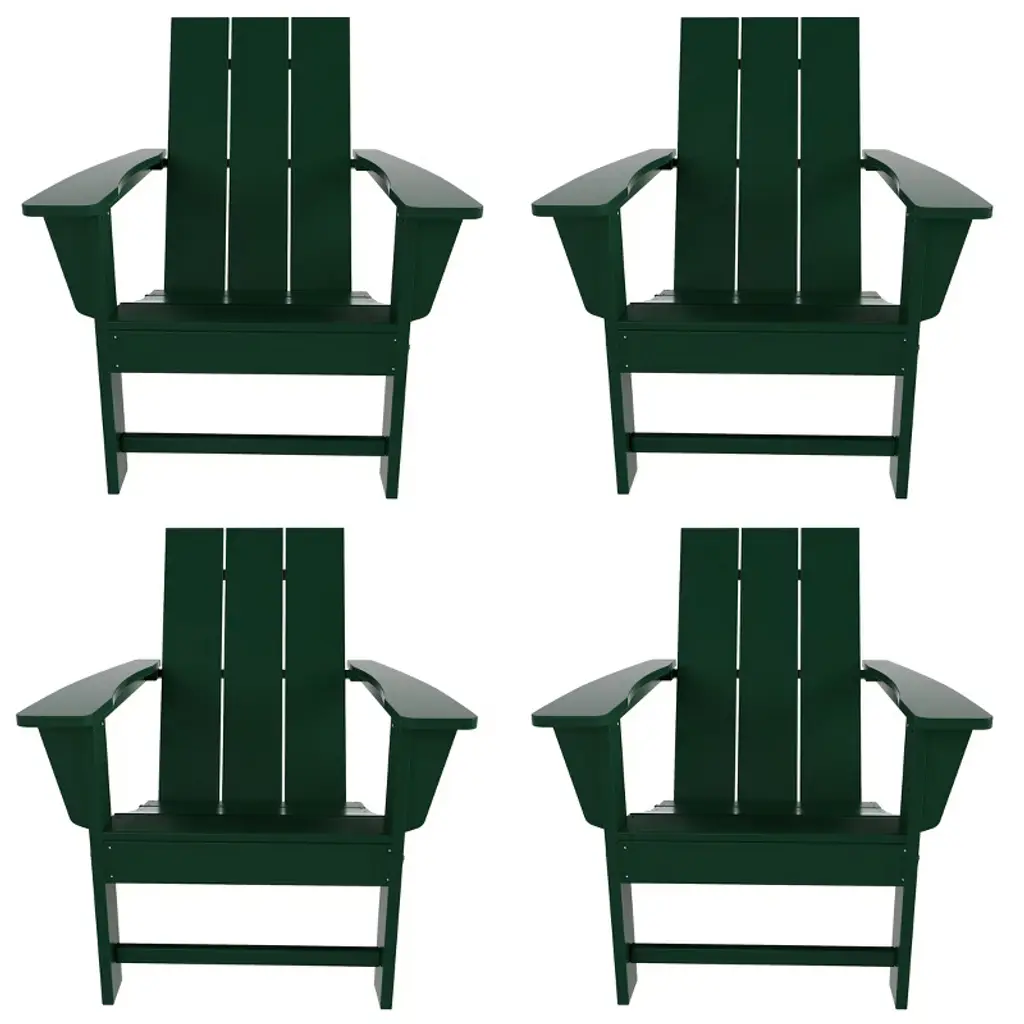 This four contemporary outdoor folding chair set has a contoured seat for ultimate comfort. Built to withstand a range of climates including hot sun, snowy winters, and strong coastal winds. UV protectant color to keep its rich vibrant colors for many years of use. These outdoor chair are the perfect addition to any porch, patio, or veranda. Cleans easily with soap, water, and a soft-bristle brush. These well-constructed patio chairs have marine-grade quality hardware. Ideal for lounging outdoors or in your favorite indoor spot. Multi-functional because it can also be used indoors. Let your outdoor living experience flourish when you invest in this solid plastic folding chair. Available in easy to match color options.While we strive to accurately represent product colors, please be aware that actual colors may vary slightly due to individual screen settings and lighting conditions. FeaturesSet includes: four (4) Adirondack chairsDurable HDPE Plastic ConstructionContoured seat, wide armrest, high backrestMade with Weather & UV Resistant MaterialsEco-Friendly and environmentally stable HDPE Plastic, giving off no harmful fumesUV-treated to resist fading to keep vibrant color all season longFoldable for easy storageDetails:Product Type: Adirondack ChairsWhat's Included: (4) Adirondack ChairAdirondack ChairDimensions: 30" W x 32" D x 35.5" HWeight: 39.25 lbs.Seat Width: 20.5"Seat Depth: 20"Seat Height: 15"Weight Capacity: 450 lbs.