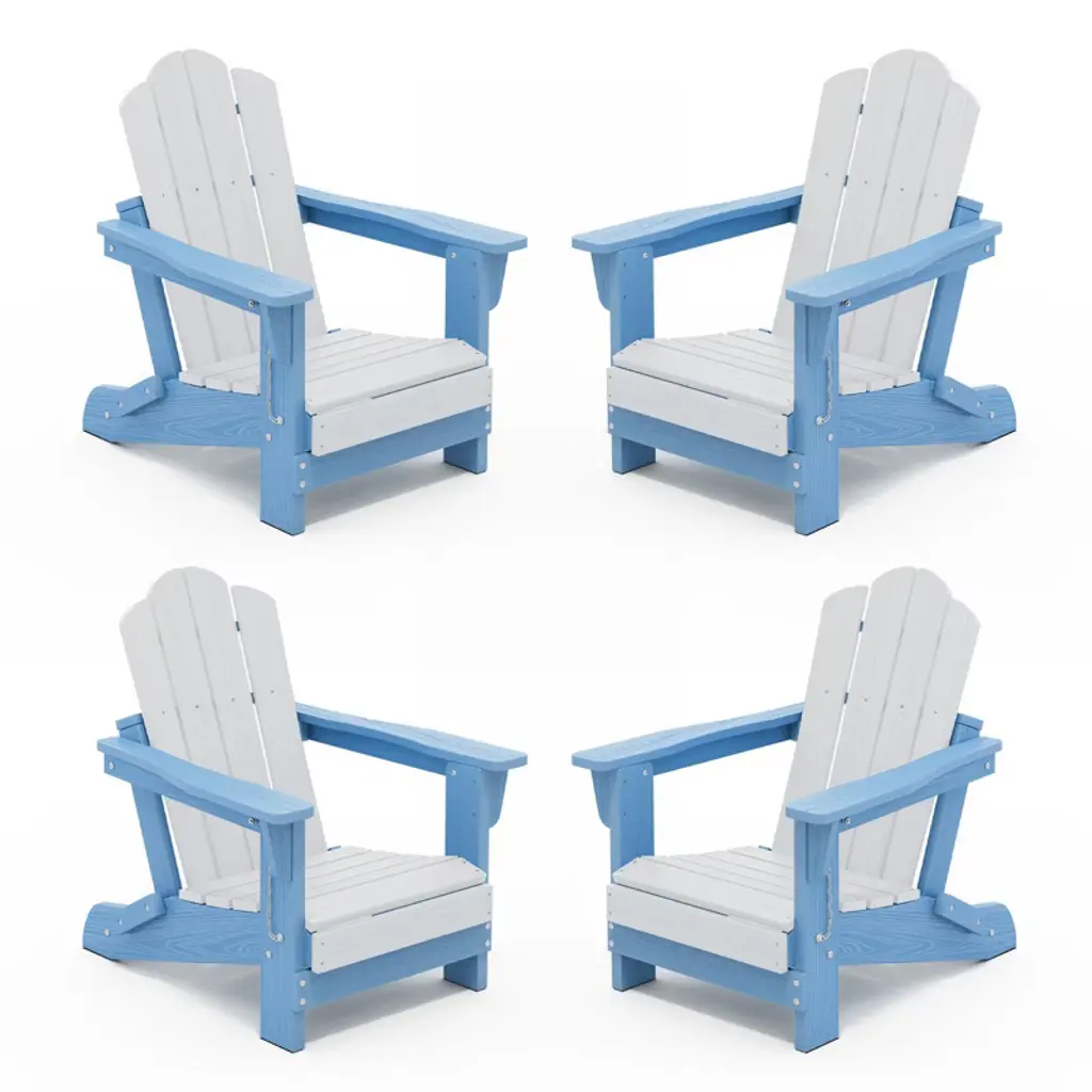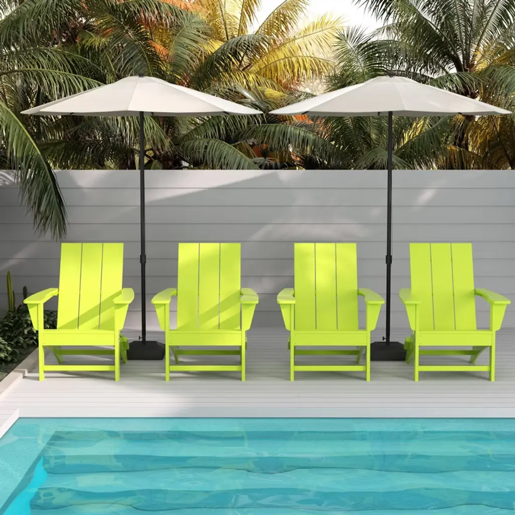 This four contemporary outdoor folding chair set has a contoured seat for ultimate comfort. Built to withstand a range of climates including hot sun, snowy winters, and strong coastal winds. UV protectant color to keep its rich vibrant colors for many years of use. These outdoor chair are the perfect addition to any porch, patio, or veranda. Cleans easily with soap, water, and a soft-bristle brush. These well-constructed patio chairs have marine-grade quality hardware. Ideal for lounging outdoors or in your favorite indoor spot. Multi-functional because it can also be used indoors. Let your outdoor living experience flourish when you invest in this solid plastic folding chair. Available in easy to match color options.While we strive to accurately represent product colors, please be aware that actual colors may vary slightly due to individual screen settings and lighting conditions. FeaturesSet includes: four (4) Adirondack chairsDurable HDPE Plastic ConstructionContoured seat, wide armrest, high backrestMade with Weather & UV Resistant MaterialsEco-Friendly and environmentally stable HDPE Plastic, giving off no harmful fumesUV-treated to resist fading to keep vibrant color all season longFoldable for easy storageDetails:Product Type: Adirondack ChairsWhat's Included: (4) Adirondack ChairAdirondack ChairDimensions: 30" W x 32" D x 35.5" HWeight: 39.25 lbs.Seat Width: 20.5"Seat Depth: 20"Seat Height: 15"Weight Capacity: 450 lbs.