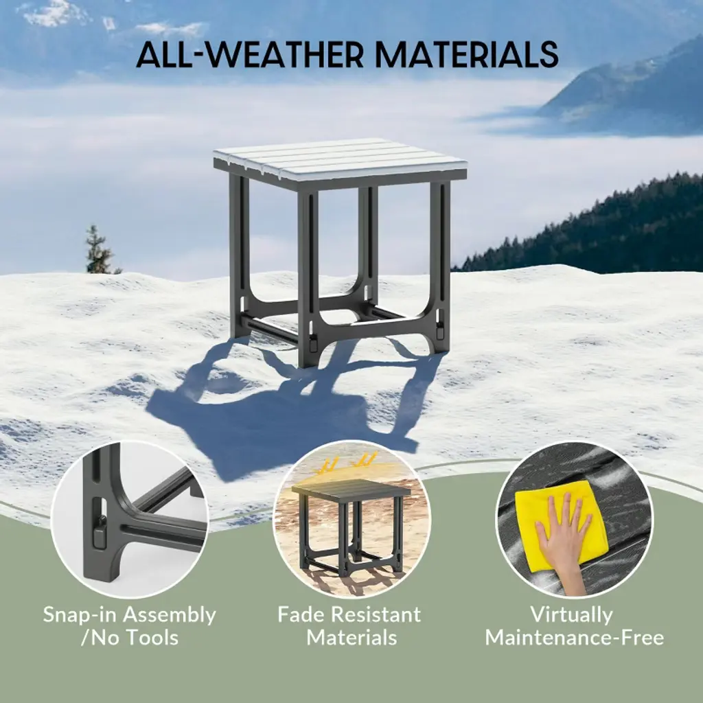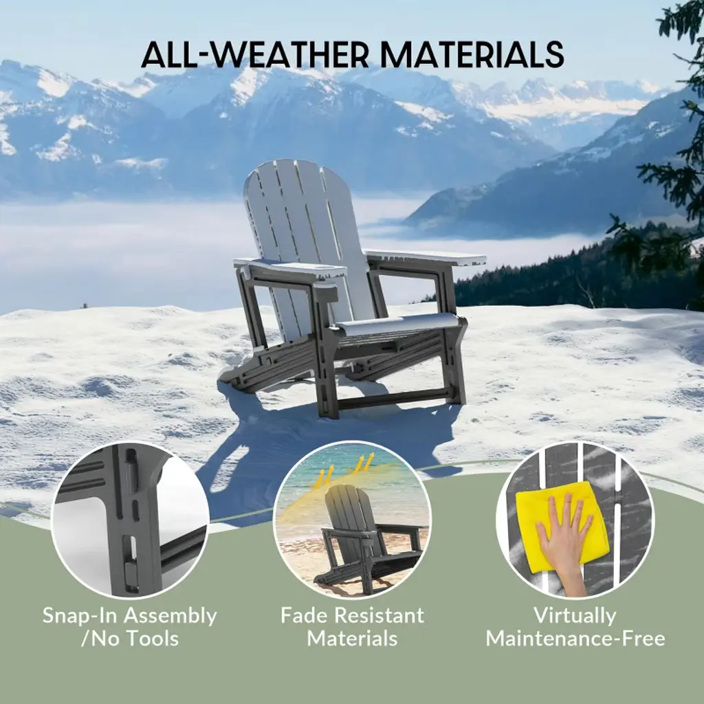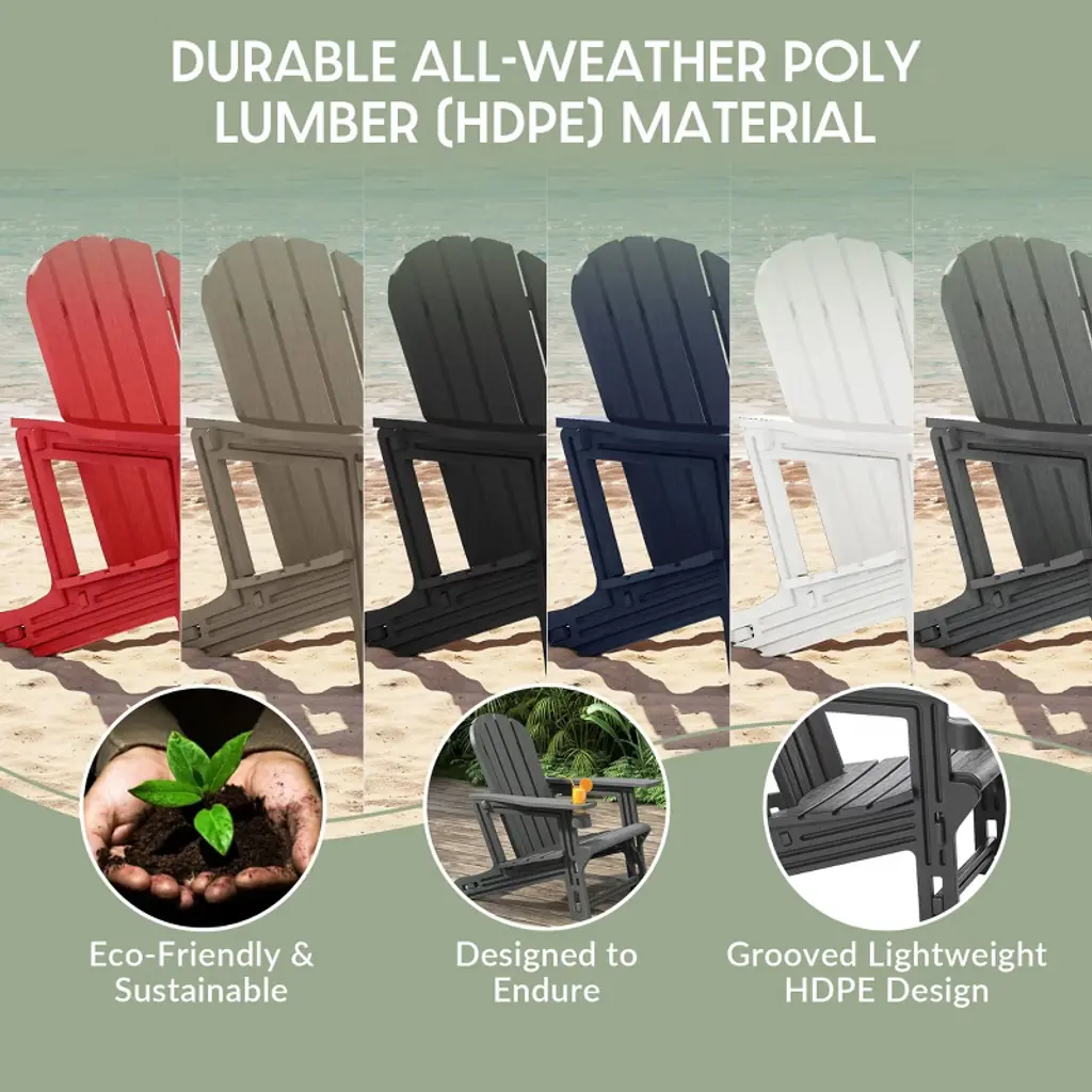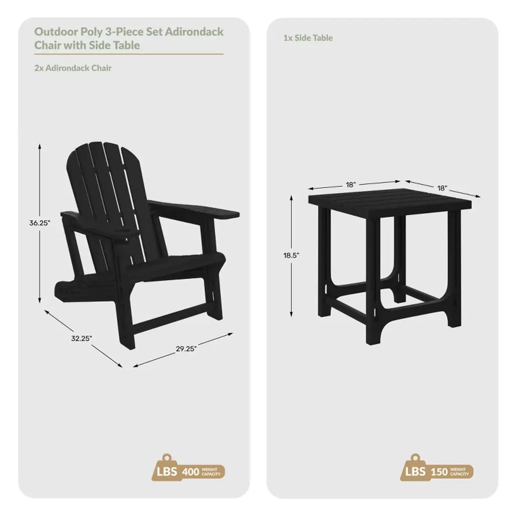 Discover outdoor luxury with our 3-Piece HDPE Adirondack Chairs & Side Table Set, designed for elevated comfort and modern outdoor living. Enjoy easy setup with snap-and-lock assembly—no tools, screws, or missing parts. Made from durable, non-toxic HDPE with a wood-like grain texture, this set resists fading, UV rays, and weather for lasting beauty and safety for kids and pets. The chairs features broad 5" armrests and a discreet 3.25" cup holder for your favorite tumbler and convenient phone holder. Lightweight and easy to move, it’s perfect for any outdoor space. The square side table features rounded edges for safety and a slatted top for quick drainage. Its compact, portable design makes it ideal for decks, patios, or poolside settings. Blending timeless charm with smart design, this set offers style, comfort, and convenience built to last.While we strive to accurately represent product colors, please be aware that actual colors may vary slightly due to individual screen settings and lighting conditions. FeaturesSet Includes: Two (2) HDPE Adirondack Patio Chair & One (1) 18" HDPE Square Side TableConstructed from Durable HDPE Material That is Designed to be Stable and Sturdy and Has a Wood-Like Grain Finish that Mimics Natrual Wood & Weather Resistant to Protect Against The Harsh Outdoor Elements & Fade & UV Resistant to Protect Against the SunInnovative Hardware-Free Design Ensures A Quick, Tool-Free Setup, Eliminates The Frustration Of Stripped Screws Or Misplaced HardwareBuilt-in Cup and Phone Holder Keep Essentials Nearby & Rids of That Annoying Problem of Your Phone Falling Out Your Pocket & BreakingSquare Legs With Expansive & Flat Contact Points, Provide Unwavering Support & A Visibly Grounded Aesthetic For Assured StabilitySnap-&-Lock Design Ensures A Quick, Tool-Free Setup. Pieces Simply Glide Into Place For A Sturdy, Hardware-Free BuildBroad 5-Inch Armrests Offer Generous Room For Ultimate Relaxation, Enhancing The Chair's Comfortable & Spacious Feel & Thick Durable Armrest With The 3.25" Wide Cup Holder Perfect For Holding Your Favorite Tumbler Or Water BottleDetails:Product Type: Patio Conversation SetsWhat's Included: (2) Adirondack Chair; (1) Side TableAdirondack ChairDimensions: 29.25" W x 32.25" D x 36.25" HWeight: 21.5 lbs.Seat Width: 20"Seat Depth: 19"Seat Height: 16.25"Weight Capacity: 400 lbs.Table Top Width: 18"Table Top Depth: 18"Table Top Thickness: 1.25"Weight Capacity: 150 lbs.Side TableDimensions: 18" W x 18" D x 18.5" HWeight: 6 lbs.Table Top Width: 18"Table Top Depth: 18"Table Top Thickness: 1.25"