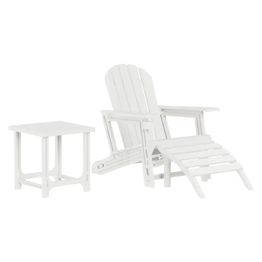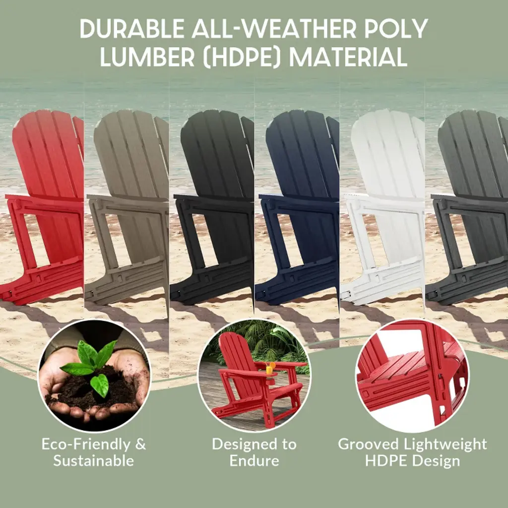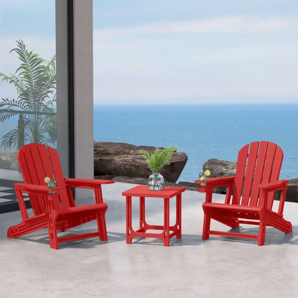 Discover outdoor luxury with our 3-Piece HDPE Adirondack Chairs & Side Table Set, designed for elevated comfort and modern outdoor living. Enjoy easy setup with snap-and-lock assembly—no tools, screws, or missing parts. Made from durable, non-toxic HDPE with a wood-like grain texture, this set resists fading, UV rays, and weather for lasting beauty and safety for kids and pets. The chairs features broad 5" armrests and a discreet 3.25" cup holder for your favorite tumbler and convenient phone holder. Lightweight and easy to move, it’s perfect for any outdoor space. The square side table features rounded edges for safety and a slatted top for quick drainage. Its compact, portable design makes it ideal for decks, patios, or poolside settings. Blending timeless charm with smart design, this set offers style, comfort, and convenience built to last.While we strive to accurately represent product colors, please be aware that actual colors may vary slightly due to individual screen settings and lighting conditions. FeaturesSet Includes: Two (2) HDPE Adirondack Patio Chair & One (1) 18" HDPE Square Side TableConstructed from Durable HDPE Material That is Designed to be Stable and Sturdy and Has a Wood-Like Grain Finish that Mimics Natrual Wood & Weather Resistant to Protect Against The Harsh Outdoor Elements & Fade & UV Resistant to Protect Against the SunInnovative Hardware-Free Design Ensures A Quick, Tool-Free Setup, Eliminates The Frustration Of Stripped Screws Or Misplaced HardwareBuilt-in Cup and Phone Holder Keep Essentials Nearby & Rids of That Annoying Problem of Your Phone Falling Out Your Pocket & BreakingSquare Legs With Expansive & Flat Contact Points, Provide Unwavering Support & A Visibly Grounded Aesthetic For Assured StabilitySnap-&-Lock Design Ensures A Quick, Tool-Free Setup. Pieces Simply Glide Into Place For A Sturdy, Hardware-Free BuildBroad 5-Inch Armrests Offer Generous Room For Ultimate Relaxation, Enhancing The Chair's Comfortable & Spacious Feel & Thick Durable Armrest With The 3.25" Wide Cup Holder Perfect For Holding Your Favorite Tumbler Or Water BottleDetails:Product Type: Patio Conversation SetsWhat's Included: (2) Adirondack Chair; (1) Side TableAdirondack ChairDimensions: 29.25" W x 32.25" D x 36.25" HWeight: 21.5 lbs.Seat Width: 20"Seat Depth: 19"Seat Height: 16.25"Weight Capacity: 400 lbs.Table Top Width: 18"Table Top Depth: 18"Table Top Thickness: 1.25"Weight Capacity: 150 lbs.Side TableDimensions: 18" W x 18" D x 18.5" HWeight: 6 lbs.Table Top Width: 18"Table Top Depth: 18"Table Top Thickness: 1.25"