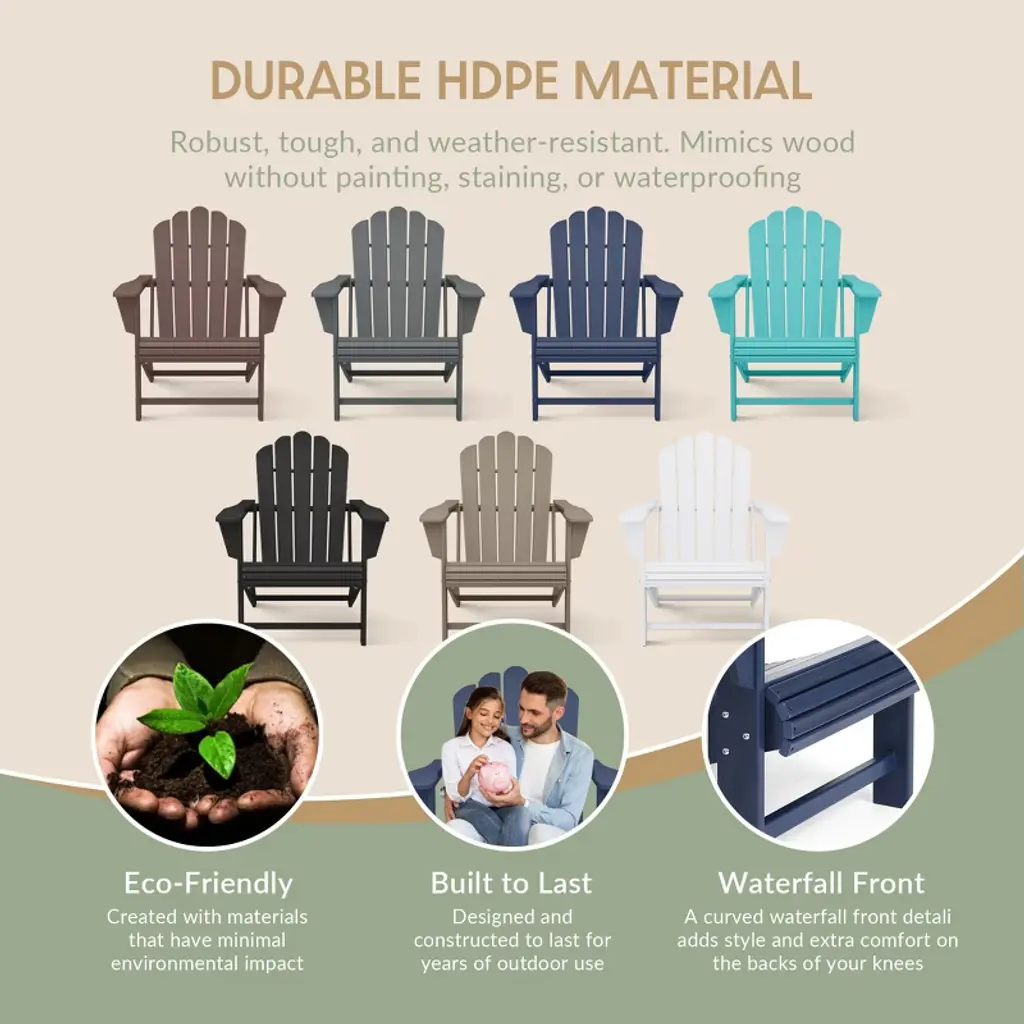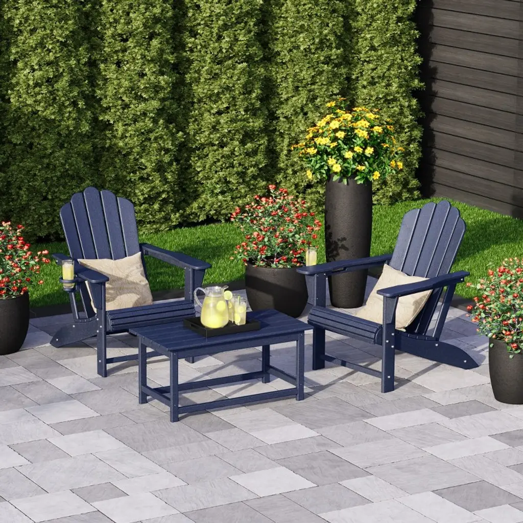 Relax in style with our 3-piece Adirondack chairs with cup holder and Coffee table set for ultimate convenience. Crafted from durable, weather-resistant, UV and fade-resistant HDPE, designed to withstand the elements and provide lasting comfort. The contoured seat with the waterfall and backrest offer optimal support, while the hidden cup holder keeps your drink within reach and the helpful patio coffee table can hold extra drinks or snacks.While we strive to accurately represent product colors, please be aware that actual colors may vary slightly due to individual screen settings and lighting conditions. FeaturesSet Includes: Two (2) Adirondack Chairs with Cup Holders and One (1) Patio Coffee TableConstructed from Durable HDPE Material and Designed to be Stable and SturdyWeather Resistant to Protect Against the Harsh Outdoor ElementsFade and UV Resistant to Protect Against the SunHidden Cup Holder to Hold Your Drinks on Those Warm or Cold Afternoons and Can be Hidden for a More Classic Adirondack Chair Look and a 35" Inch Wide Coffee Table for Plenty of Space for More Drinks or Snacks20" Inch Wide Inclined Seat for a Spacious Seat wth a Contoured Seat and Waterfall Front to Relieve Pressue on the Back of Your Knees and Curved BackrestSlatted Backrest and Seat for added Breathability for those Warmer DaysDetails:Product Type: Patio Conversation SetsWhat's Included: (2) Adirondack Chair; (1) Coffee TableAdirondack ChairDimensions: 29.5" W x 33" D x 36.75" HWeight: 38 lbs.Seat Width: 20.75"Seat Depth: 19.5"Seat Height: 15"Weight Capacity: 450 lbs.Coffee TableDimensions: 35.25" W x 17.5" D x 16" HWeight: 21 lbs.Weight Capacity: 220 lbs.