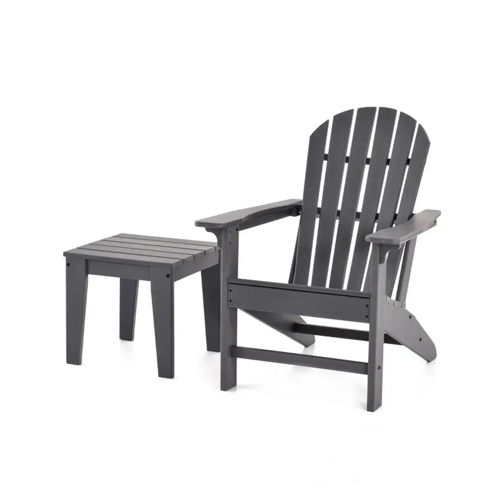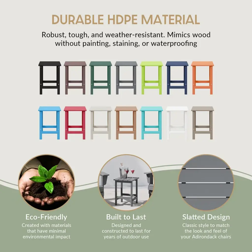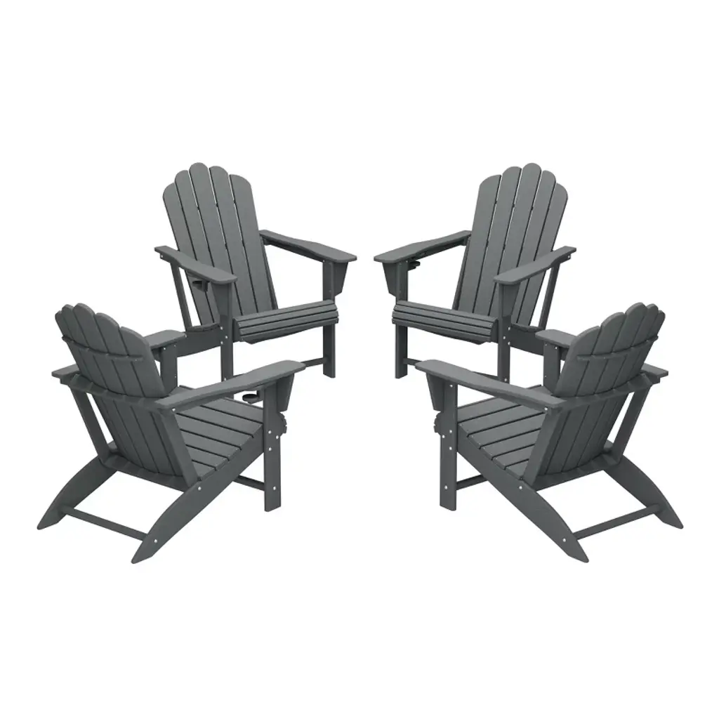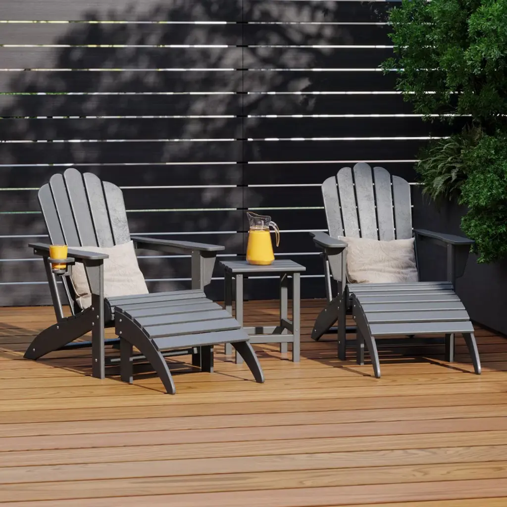 Relax in style with our 5-piece Adirondack chair with cup holder, ottoman, and side table set for ultimate convenience. Crafted from durable, weather-resistant, UV and fade-resistant HDPE, this chair is designed to withstand the elements and provide lasting comfort. The contoured seat with the waterfall and backrest offer optimal support, while the hidden cup holder keeps your drink within reach and a the helpful patio side table can hold extra drinks or snacks.While we strive to accurately represent product colors, please be aware that actual colors may vary slightly due to individual screen settings and lighting conditions. FeaturesSet Includes: Two (2) Adirondack Chairs with Cup Holder, Two (2) Folding Ottomans, One (1) Patio Side TableConstructed from Durable HDPE Material and Designed to be Stable and SturdyWeather Resistant to Protect Against the Harsh Outdoor ElementsFade and UV Resistant to Protect Against the SunHidden Cup Holder to Hold Your Drinks on Those Warm or Cold Afternoons and Can be Hidden for a More Classic Adirondack Chair Look and a 14" Inch Side Table for Plenty of Space for More Drinks or Snacks20" Inch Wide Inclined Seat for a Spacious Seat wth a Contoured Seat and Waterfall Front to Relieve Pressue on the Back of Your Knees and Curved BackrestFoldable Ottoman for Easy Storage Under the ChairDetails:Product Type: Patio Conversation SetsWhat's Included: (2) Adirondack Chair; (2) Ottoman; (1) Side TableAdirondack ChairDimensions: 29.5" W x 33" D x 36.75" HWeight: 38 lbs.Seat Width: 20.75"Seat Depth: 19.5"Seat Height: 15"Weight Capacity: 450 lbs.OttomanDimensions: 20" W x 13.5" D x 18.75" HWeight: 8.75 lbs.Table Top Width: 14"Table Top Depth: 14"Table Top Thickness: 0.5"Side TableDimensions: 14" W x 14" D x 18" HWeight: 9 lbs.Table Top Width: 14"Table Top Depth: 14"Table Top Thickness: 0.5"Weight Capacity: 180 lbs.