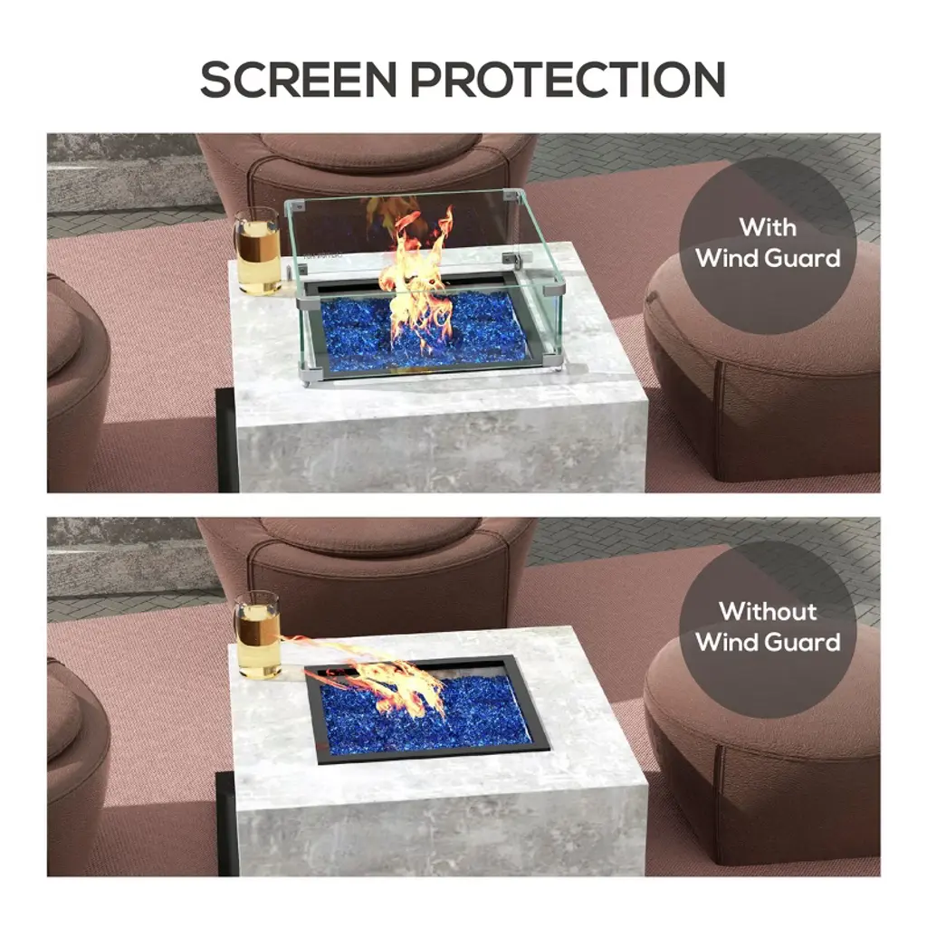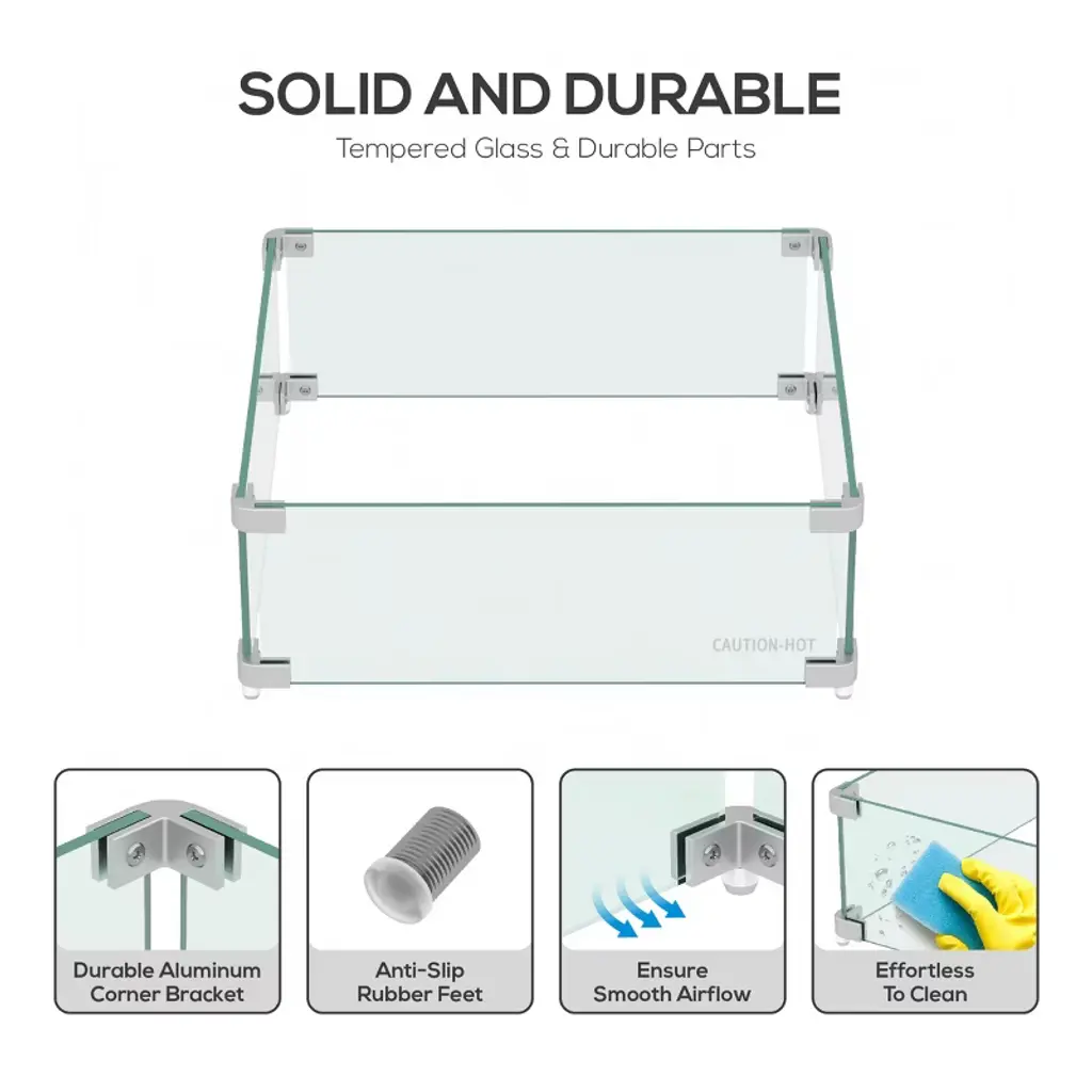 The square tempered glass flame guard serves a dual purpose: it curbs excessive flame movement that could lead to harm, and it enhances both safety and sophistication. By containing the flames within its polished, heat-resistant tempered glass enclosure, it prevents erratic dispersion that might result in damage. Simultaneously, the glass reflects the play of flames, elevating the aesthetic allure.