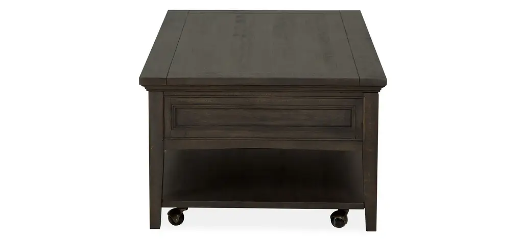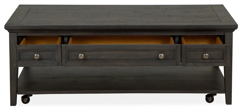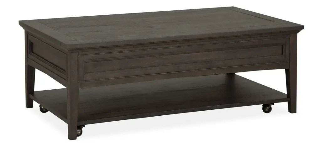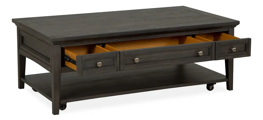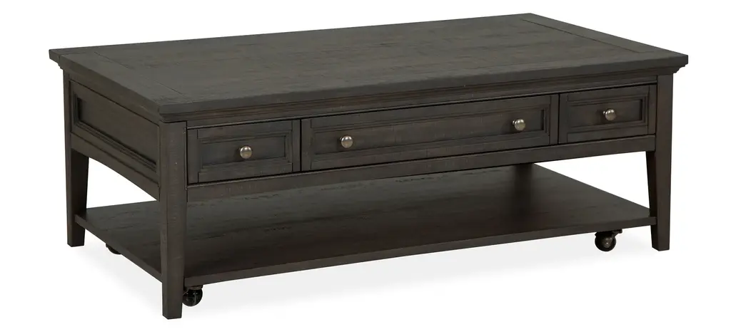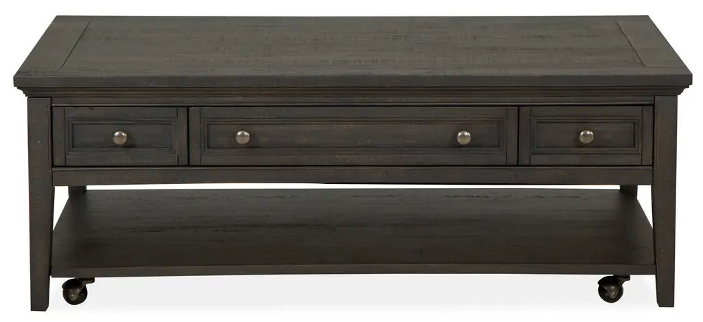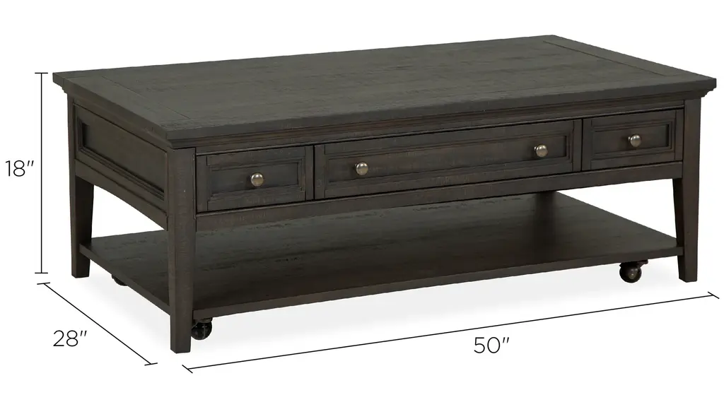 Bold, straightforward and on-trend-the Westley Falls coffee table with casters makes a statement in style. A fresh graphite finish highlighted with aged pewter hardware lends presence to this timeless furnishing while blending easily with your existing fabrics and finishes. This table features storage and display options that make staying organized easier than ever. Without a doubt, the addition of Westley Falls coffee table elevates the design quotient of any living space.