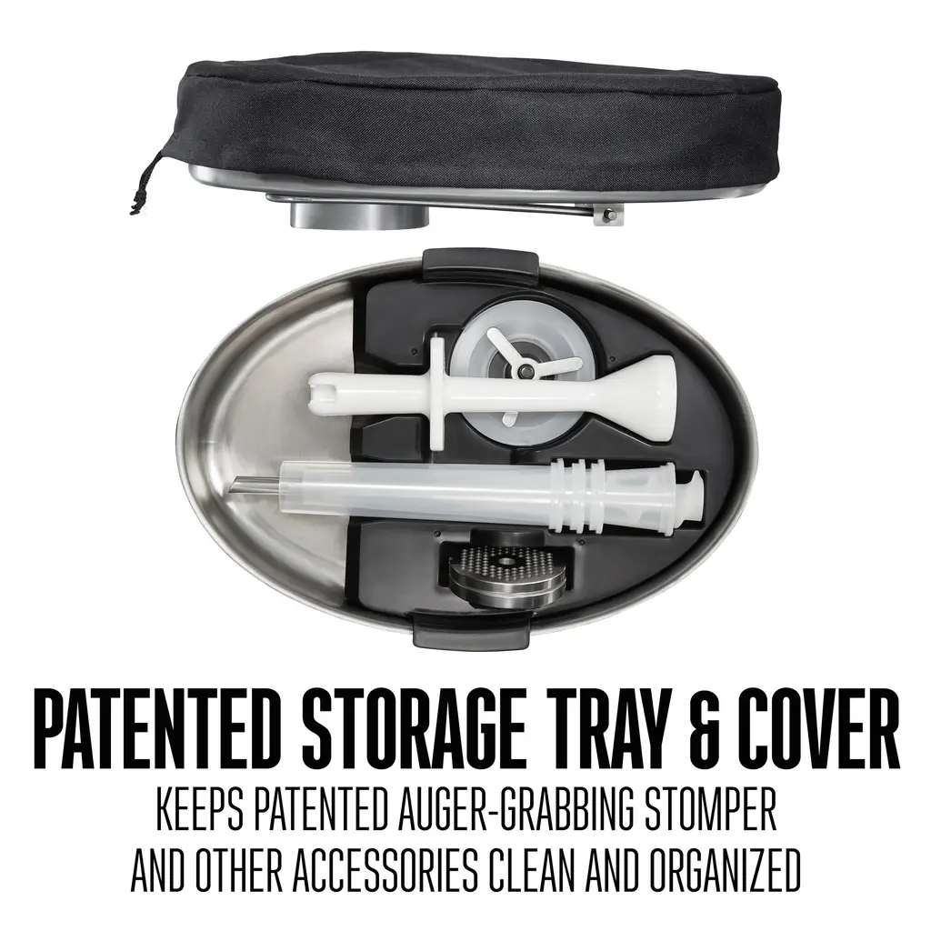 The New and Improved Weston Pro Series Meat Grinders are perfect for the hunter or home chef who need a machine with unmatched performance, quality and durability. Grind 4 - 6 pounds of fresh meat per minute and make sausages easily with the Weston® #8 Electric Meat Grinder and Sausage Stuffer. Why is ours better? SPEED: An extra wide, offset throat with rifled head design makes ours the fastest grinders on the market. DURABILITY: We use all metal, precision engineered gears for quiet performance and rugged durability. DEPENDABILITY: A permanently lubricated, air cooled motor keeps running smooth for a lifetime of use. Our new oval tray design enables you to load meat quickly into the grinder, and we've added a built-in knife sharpener to keep your butcher knives ready for efficient slicing. Includes an auger grabbing stomper, nested storage tray for the accessories, a tray cover, two stainless steel plates, a stainless steel grinding knife, and a sausage stuffing kit with adapter, spacer, three sausage funnels and a snack stick funnel.