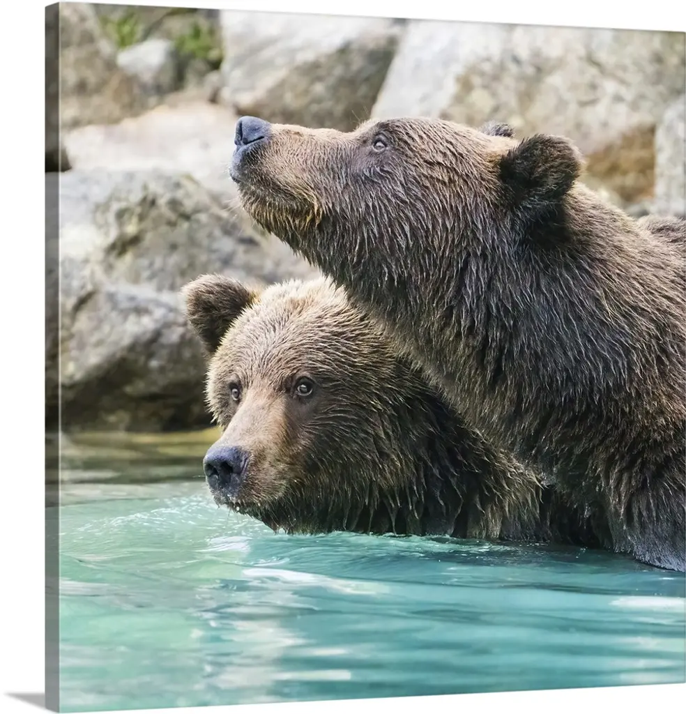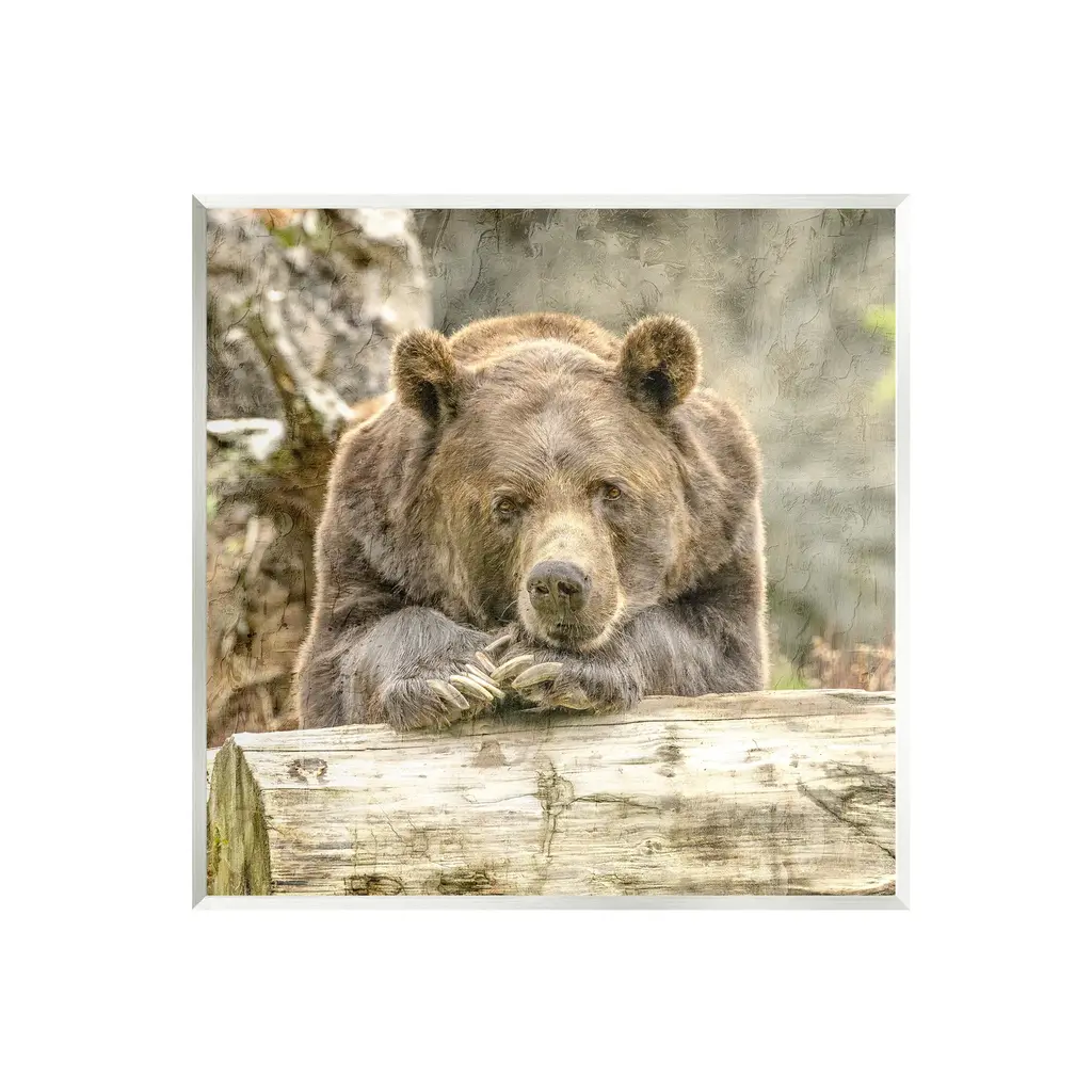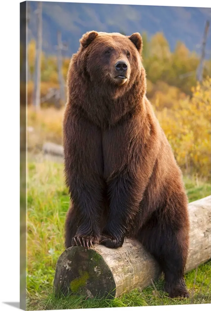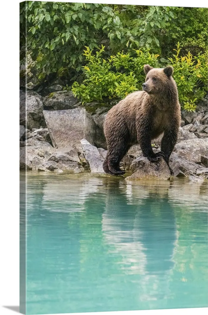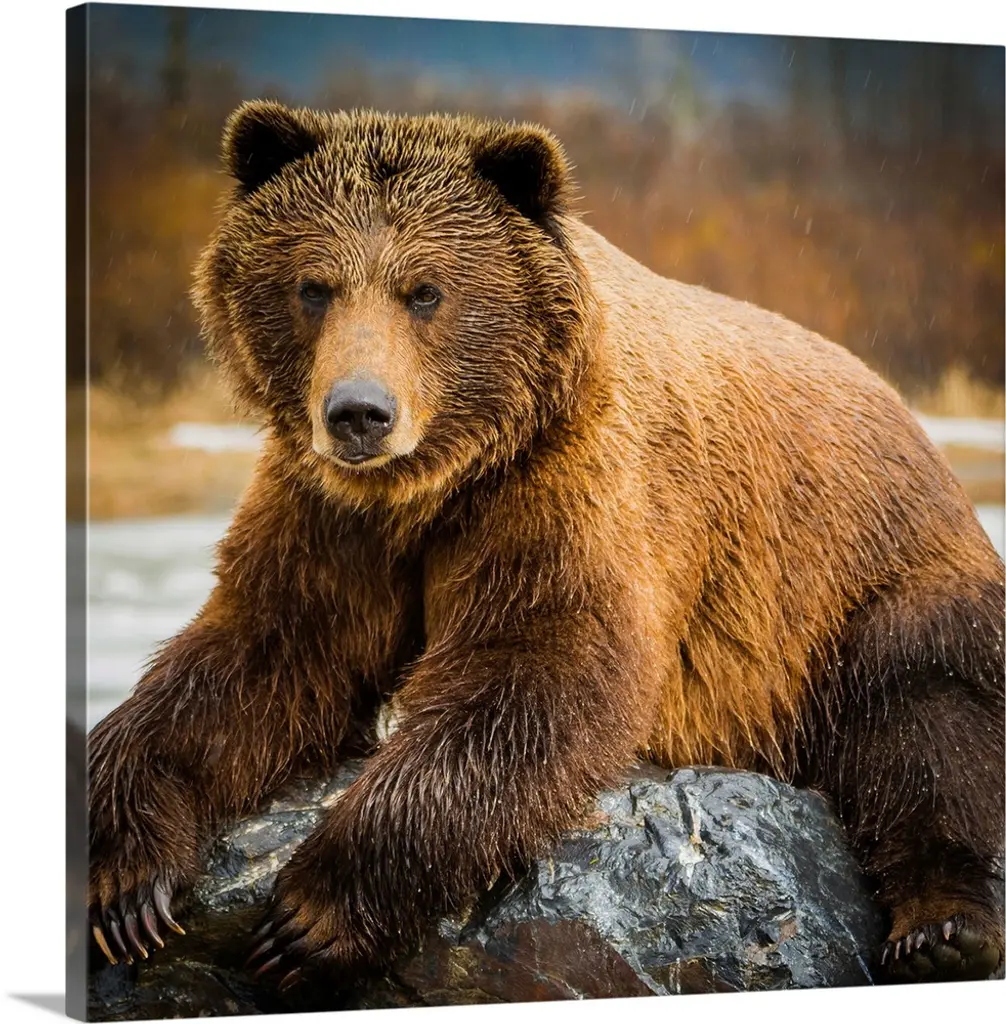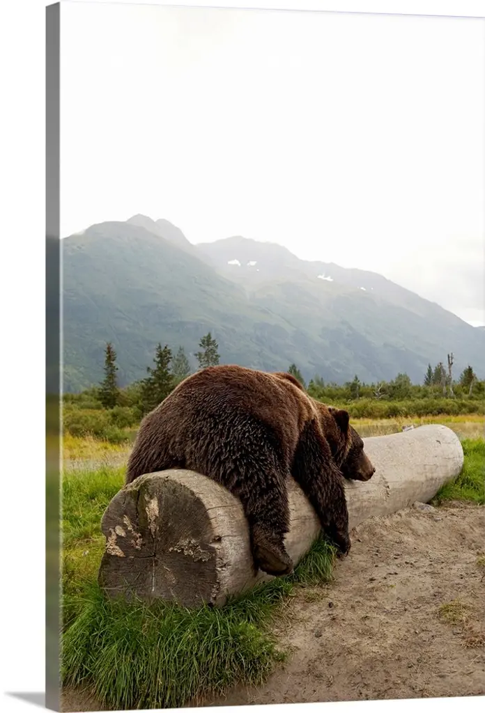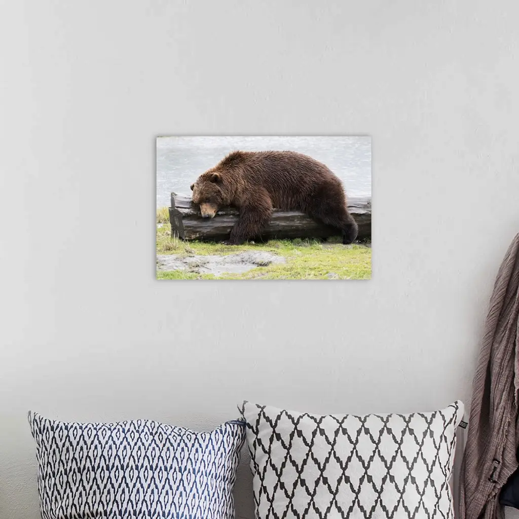 Wet Brown Bear Laying On A Log At The Water's Edge, Alaska